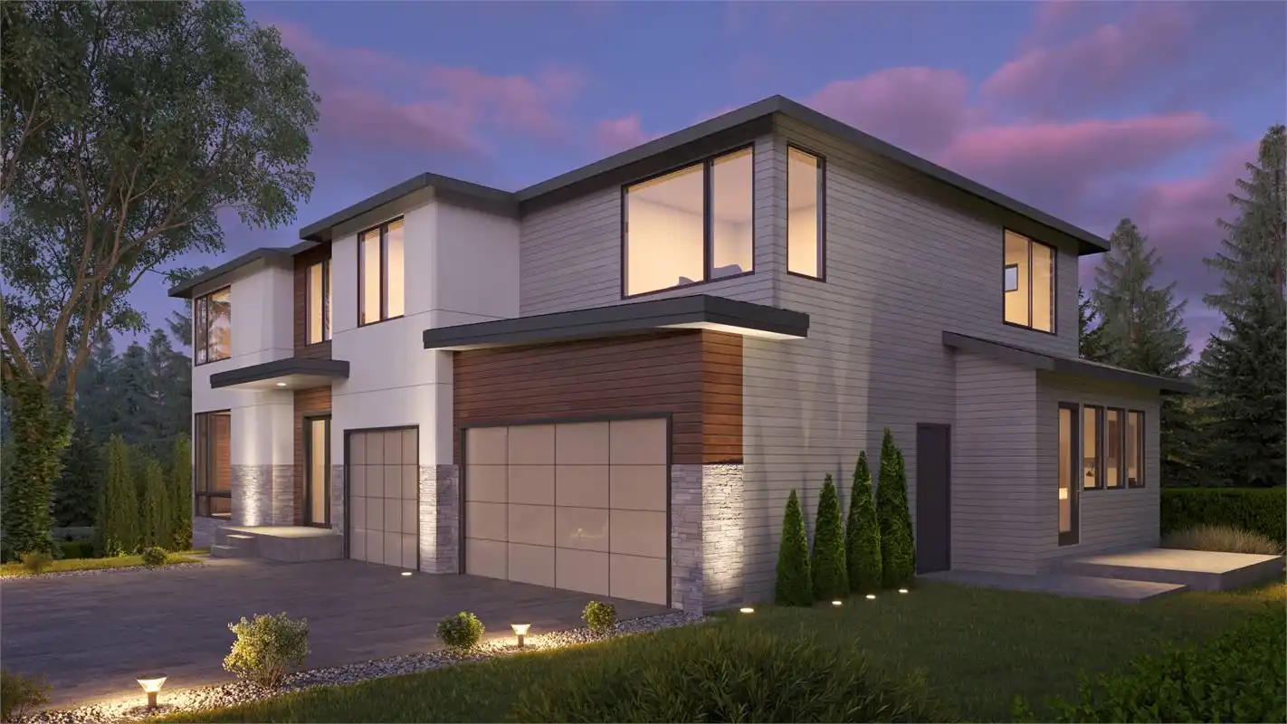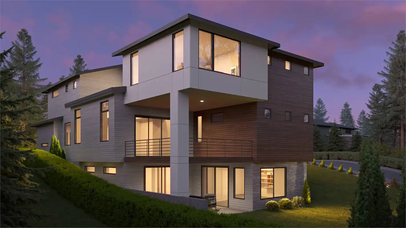 This exquisite modern house plan spans across two stories and boasts a walkout basement, showcasing both style and functionality. With over 4,877 square feet of living space, this breathtaking home features 5 bedrooms and bathrooms. Upon entering, you are welcomed by a grand foyer leading to an open-concept living space that includes a spacious great room, gourmet kitchen, and dining area. The main level also boasts a versatile home office, which doubles as a guest room. Separated by a bridge with large windows, the luxurious private master suite is complete with a spa-like bathroom and a spacious walk-in closet. Additionally, there are 3 more bedrooms and a laundry room on this level. The lower level is designed for entertainment and relaxation, featuring a media room, a large fitness space, and a covered patio that's perfect for spending quality time with family and friends.