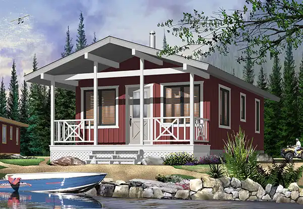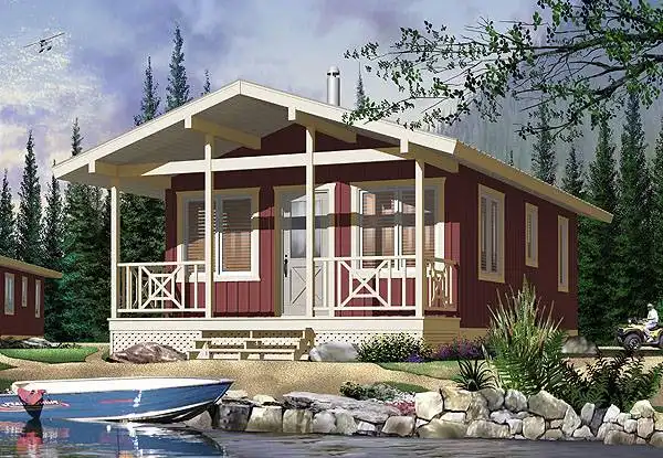 This 540 square foot country style house plan, is a great getaway or vacation home. There are plenty of features and space for a family of four. Inside you will find the kitchenette, table area and a few chairs, shower, simple beds and bunk beds, there is even a space for a wooden stove.
