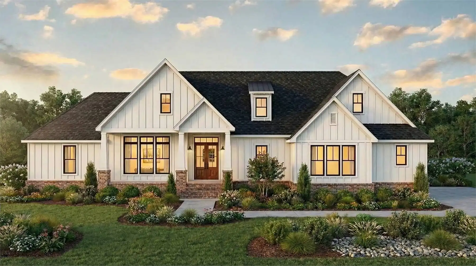 This 1,967 square foot modern farmhouse plan with a split bedroom layout features a large welcoming front porch. The foyer has a brick archway that leads you into the heart of the open floor plan with a vaulted kitchen, dining area and living room. The L-shaped kitchen has an island with seating and 10’ 4” x 5’ walk-in pantry. The rear covered porch is 39’ 4” x 12’ and has an outdoor kitchen. The private master suite occupies the left wing of the home with easy access to the laundry room. Bedrooms 2 and 3 reside on the opposite side of the home and share a full bath. The rear side-entry garage provides space for 2 cars and includes a storage room with a small garage door to easily access lawn equipment or small recreational vehicles.