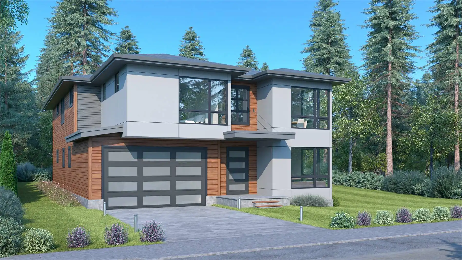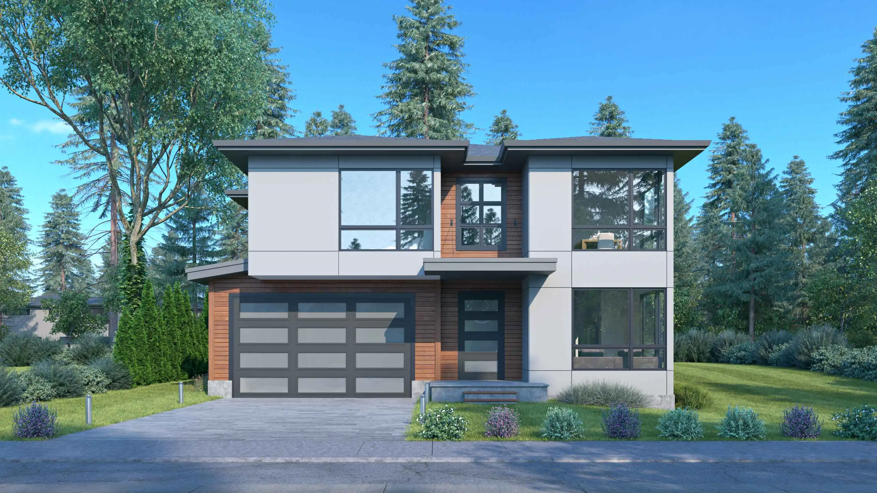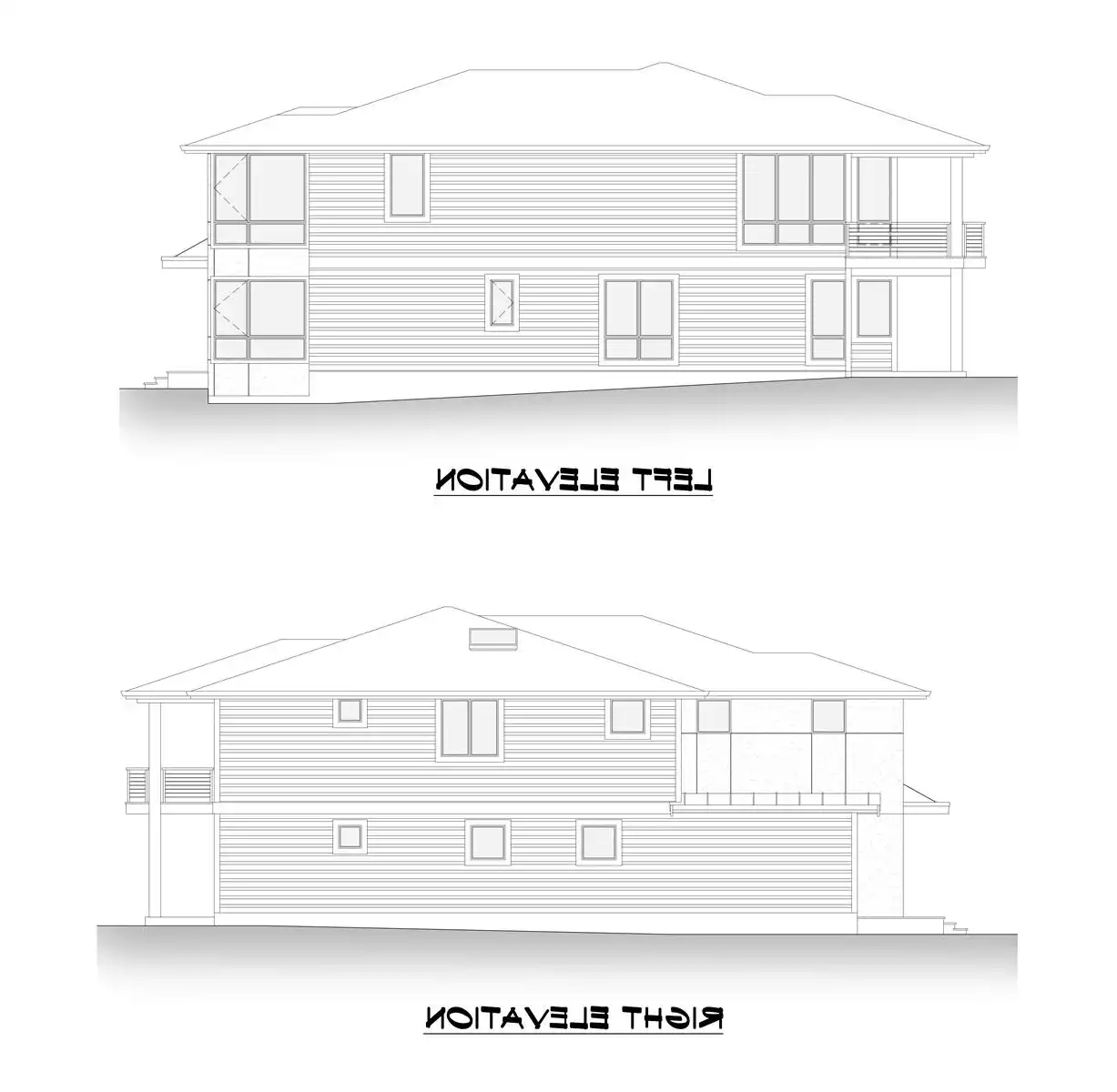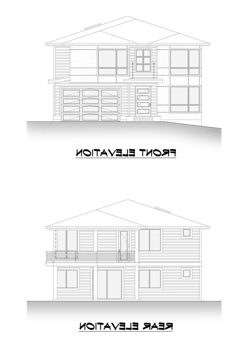 Check out House Plan 1581 if you have modern style and want to make the most of views with an inverted layout! This home offers 3,566 square feet with four bedrooms and four-and-a-half bathrooms in total. The first floor includes a three-car tandem garage, two bedroom suites, and a rec room. Upstairs, the luxe primary suite and the final suite are placed in front and back on one side. On the other, the dining room is lofted above the foyer while the island kitchen looks back over the living area. Don't miss the two-sided fireplace and covered deck!