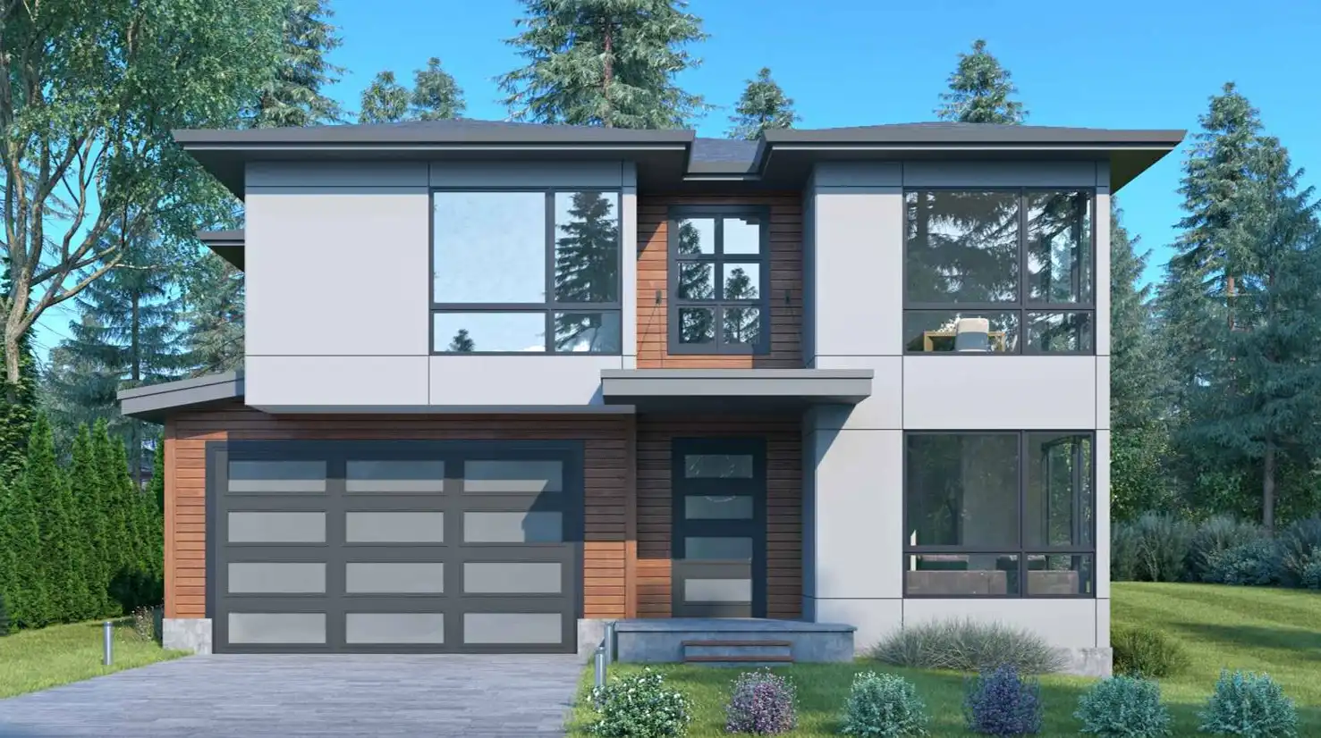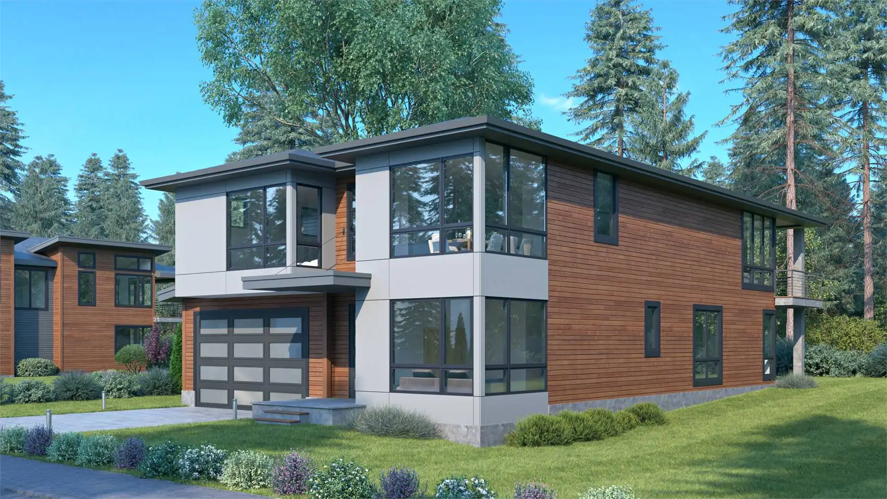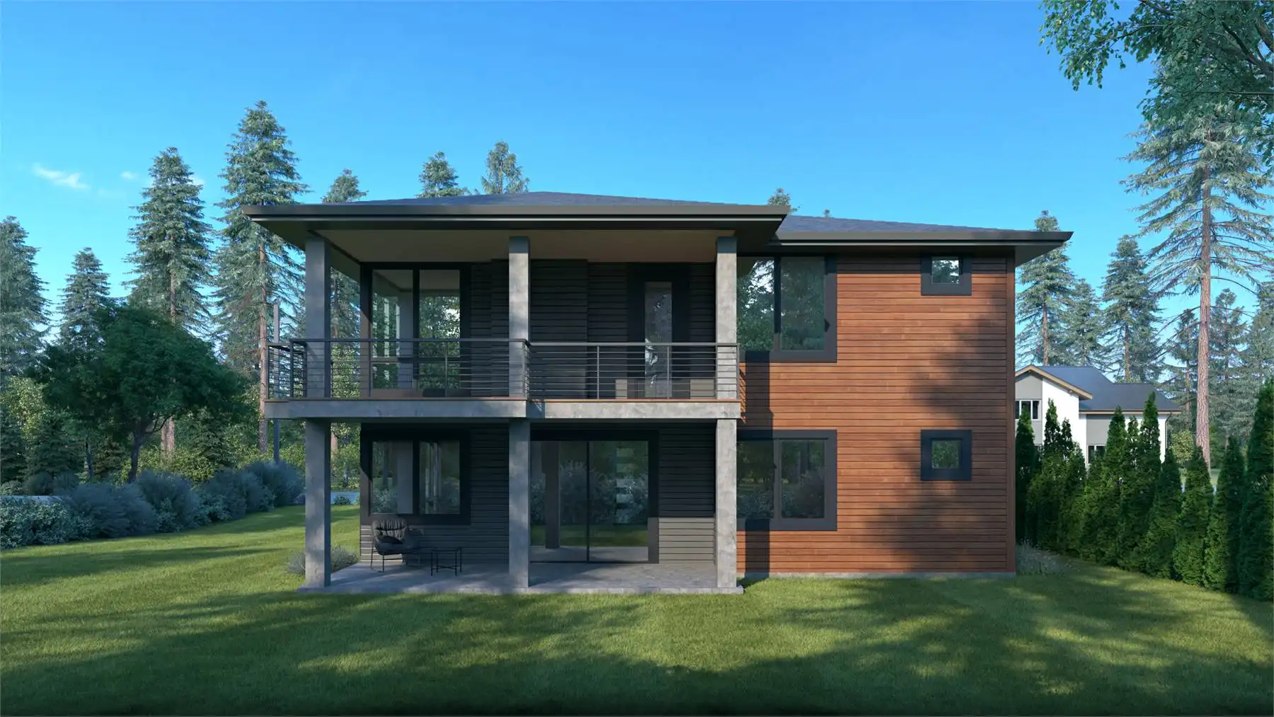 Check out House Plan 1581 if you have modern style and want to make the most of views with an inverted layout! This home offers 3,566 square feet with four bedrooms and four-and-a-half bathrooms in total. The first floor includes a three-car tandem garage, two bedroom suites, and a rec room. Upstairs, the luxe primary suite and the final suite are placed in front and back on one side. On the other, the dining room is lofted above the foyer while the island kitchen looks back over the living area. Don't miss the two-sided fireplace and covered deck!