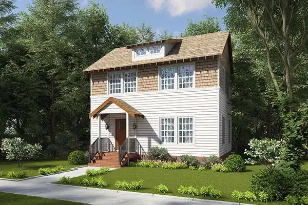 This lovely plan is 1,344 square feet, 3-bedrooms and 1.5 bathrooms and was designed for shallow depth lot, The 28-foot house width leaves adequate room for a detached garage to be built to the left or right of the house. The style of this home design is based on a published plan book from the early 1900's such as those published by Sears and Roebuck. At that time a house kit consisting of pre-cut lumber and all of the other materials and finishes to complete the construction of a complete new home could be purchased.
