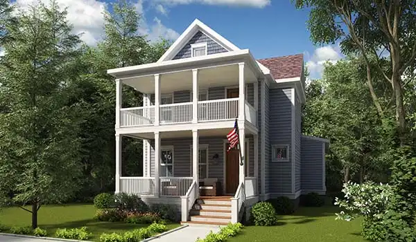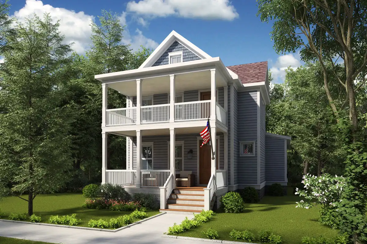 You'll love this traditional four-bedroom home design, complete with two porches and a balcony. The home's façade has a classic, Southern feel. Please note that a two-car garage may be positioned wherever you wish. In the family room, guests will enjoy good conversation in front of the warming fireplace. The island kitchen is adjacent to the laundry room, to facilitate multi-tasking. The master suite on the main level would be perfect for an aging relative. A second master suite is found upstairs, and includes a bright sitting area.