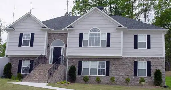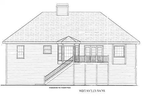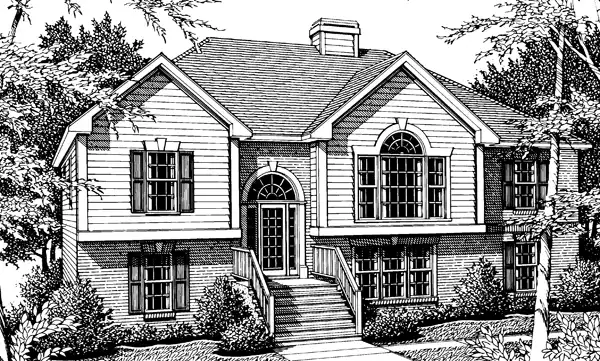 The dramatic Palladium window is the focal point of this split foyer design. A cathedral ceiling in the living area peaks above a fireplace opposite the radius windows and the railing of the foyer stairs allows the light from the radius window over the front door to be a part of the living areas view. An open over-sized kitchen has room for a small island but is shown open to the breakfast area with its bay window, which allows for access to the back deck. The formal dining room is the highlight of your view from the foyer featuring a pair of French doors on the rear wall allowing access to the same rear deck. The lower level allows for a 4th bedroom and future playroom expanding the plans overall potential size to over 2300 sq. ft. The three-car garage is the best part of this drive under design. The third bay can also be used as a workshop area.
