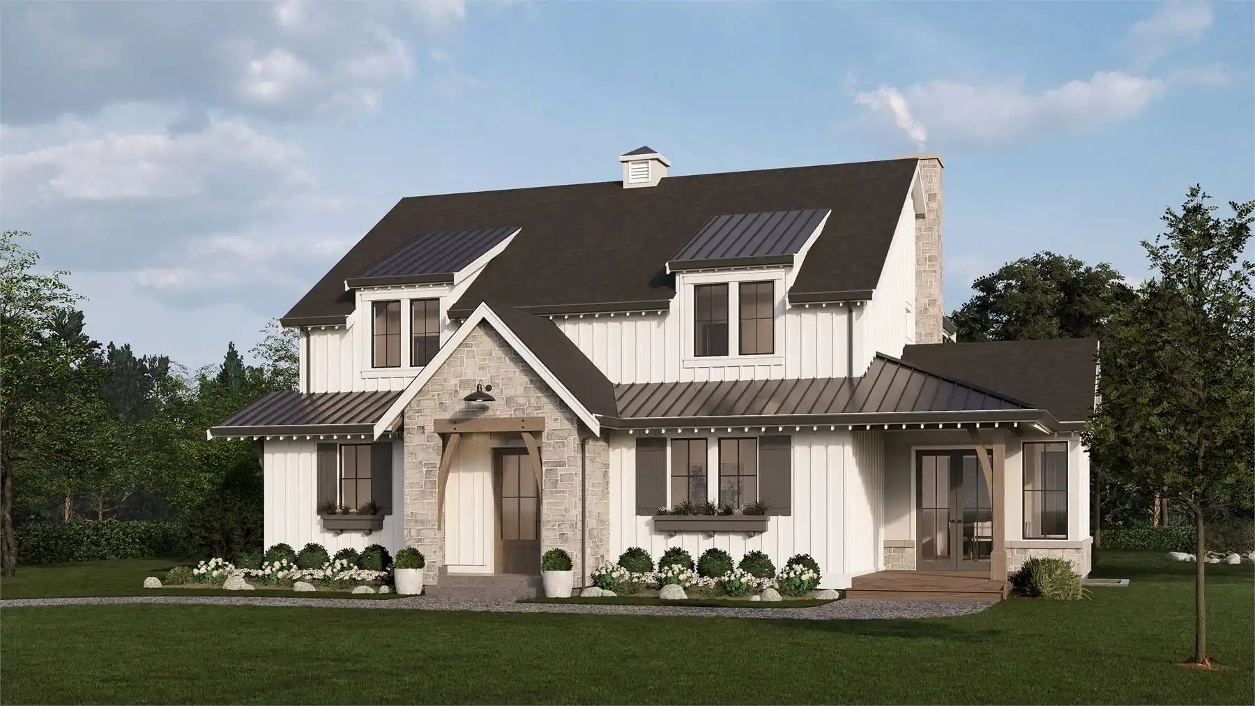 Discover modern farmhouse elegance in this 2,877 square-foot home featuring four bedrooms, each with its own private bathroom. The welcoming front porch leads you into a spacious open-plan area that includes a kitchen with a large island, perfect for socializing and cooking, connected to the living and dining areas for easy flow. Highlights of this home include a relaxing rear porch, a practical mudroom to keep essentials organized, and a versatile bonus room above the garage that can be tailored to your needs, such as a home office or gym. This design beautifully combines rustic charm with modern convenience.
