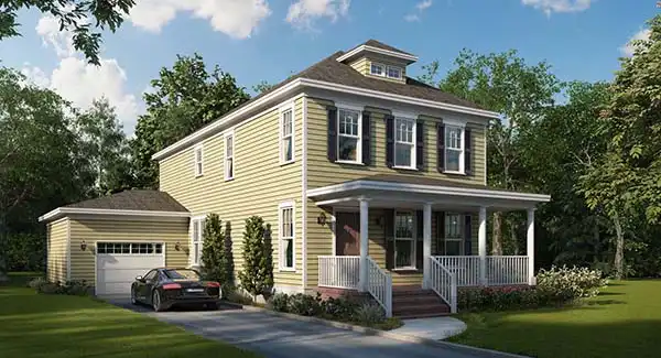 This is house plan is a variation of the historical “Four Square” style residence, typically located on the outskirts of a central urban core in the early 1,900’s. This model shows a single car attached garage that could easily be eliminated to allow a driveway to reach a larger detached garage behind the house on the right side. Another special feature of this model is that it has two master bedrooms, one on each floor. The main house structure is just 24-0 feet wide, offering a lot of living space on a narrow property. The versatility of this house to fit on a variety of lot sizes has made it a popular seller not to mention its construction simplicity and affordability. Quincy Bay is in South Boston harbor, a picturesque setting to imagine this house.
