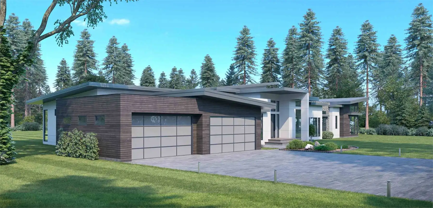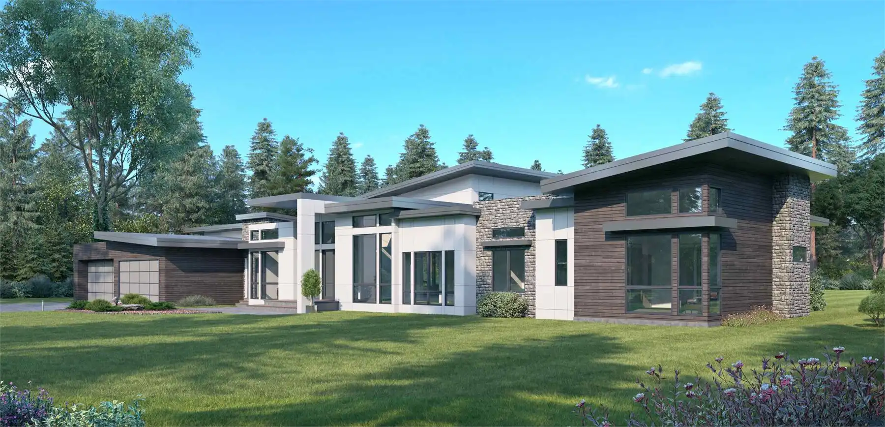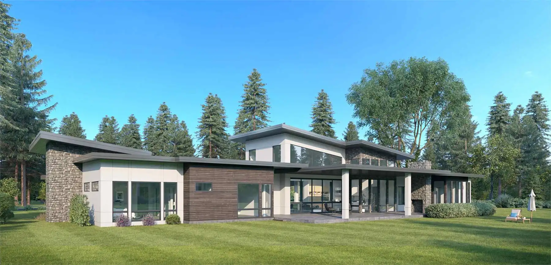 With 5,230 square feet spread out across one expansive level, House Plan 1717 definitely stands out in terms of breadth and bold modern style. When you enter through the front, you'll find a parlor on one side and the living room on the other. There's also an office located through the living room for the at-home worker. Cross the gallery hallway and you'll find the open-concept living spaces, complete with a great room with foldaway patio doors and a double island kitchen that has a secondary prep kitchen in back. Take the hall toward the garage to see the mudroom with laundry and the huge, luxurious master suite. Head back across the house and you'll find the powder room, a bar with a full bath and dry sauna that also connects to outdoor living, another laundry room, and three bedrooms--two in a Jack-and-Jill arrangement and another private suite. House Plan 1717 is an amazing design for a family and anybody who love to host!