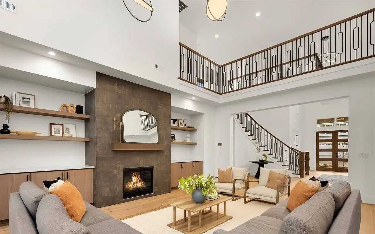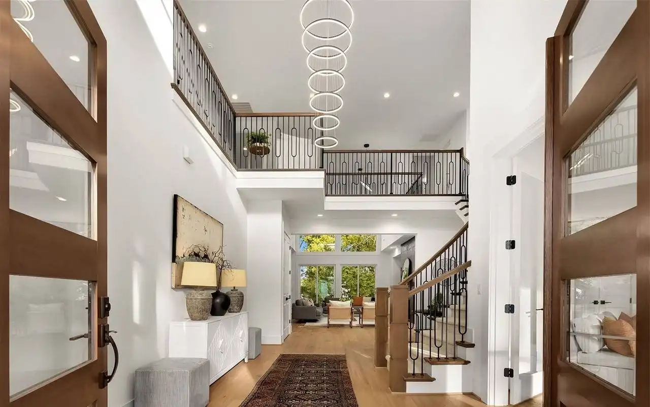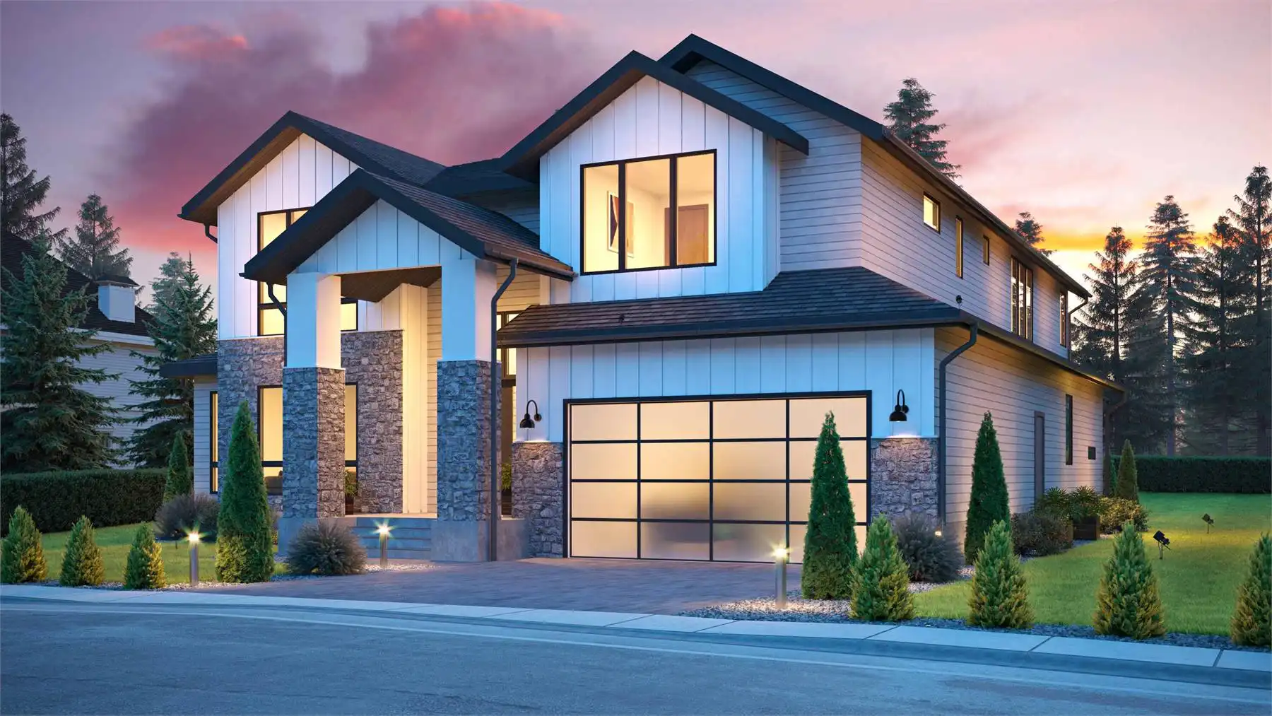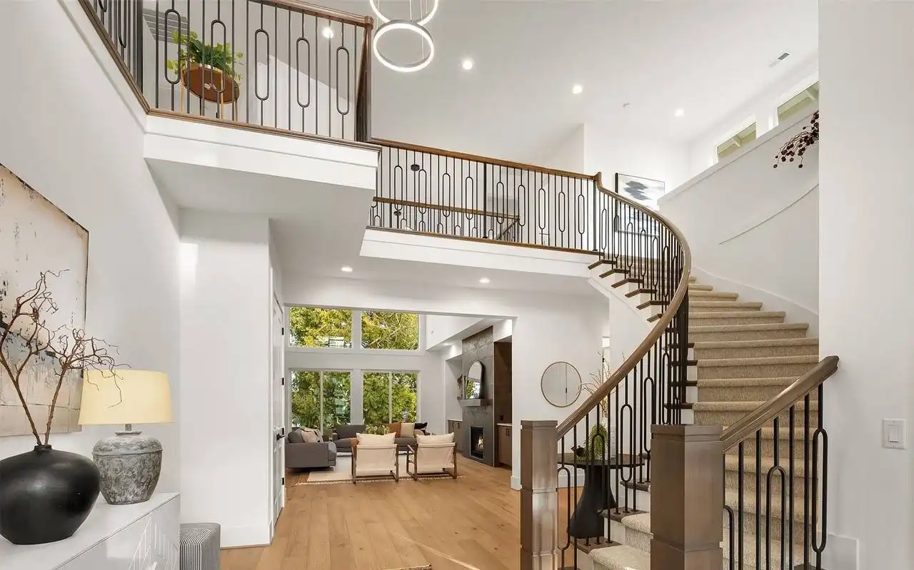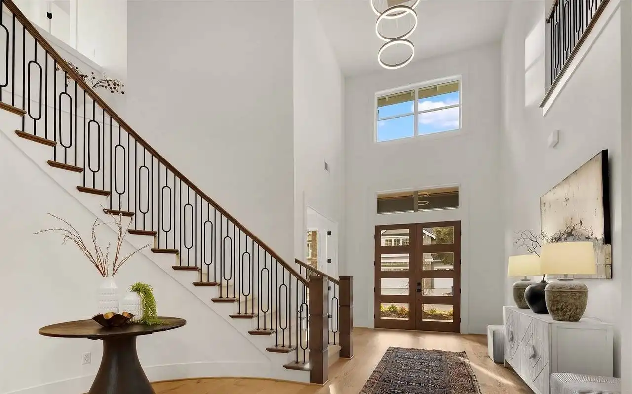 This luxury transitional farmhouse features 4,147 square feet of living space and showcases a spacious open floor plan and versatile living areas, ideal for the modern family. The front entryway opens to a grand foyer, featuring soaring ceilings and a graceful curved staircase leading up to the second level. To the right of the foyer, you will discover a generously-sized flex space, perfect for a home office, den, or guest suite. The centerpiece of the home is the expansive two-story great room, which boasts a cozy fireplace with built-ins and abundant natural light that pours in through large windows. The gourmet kitchen is a chef's delight, with a sizable island, ample counter space, and abundant storage. The adjacent dining room leads to a covered patio, providing an ideal spot for outdoor dining. Upstairs, you will find a spacious master suite, along with three additional bedrooms and a laundry room. This home also features a 4-car tandem garage, mudroom, and plenty of storage throughout, combining functionality and style in perfect harmony.