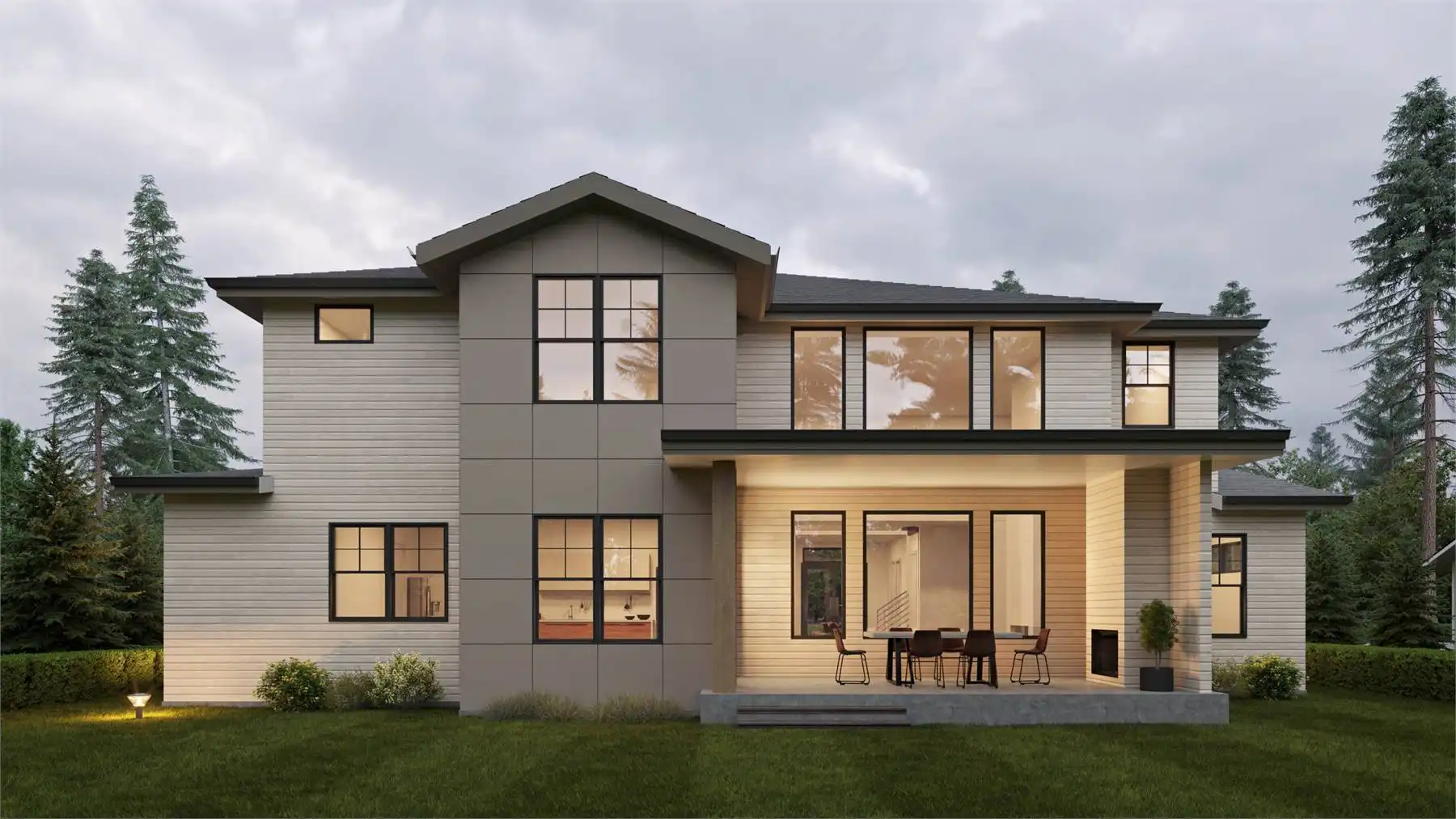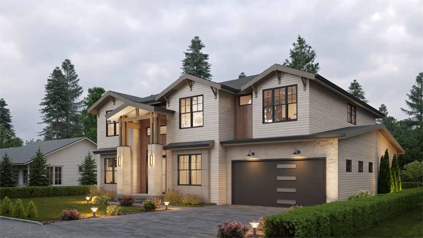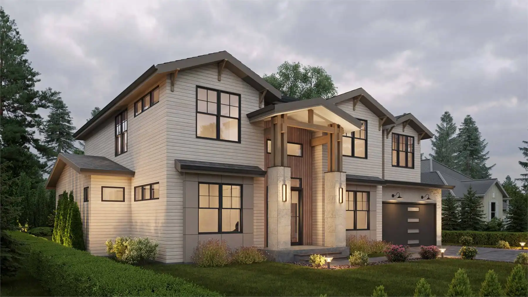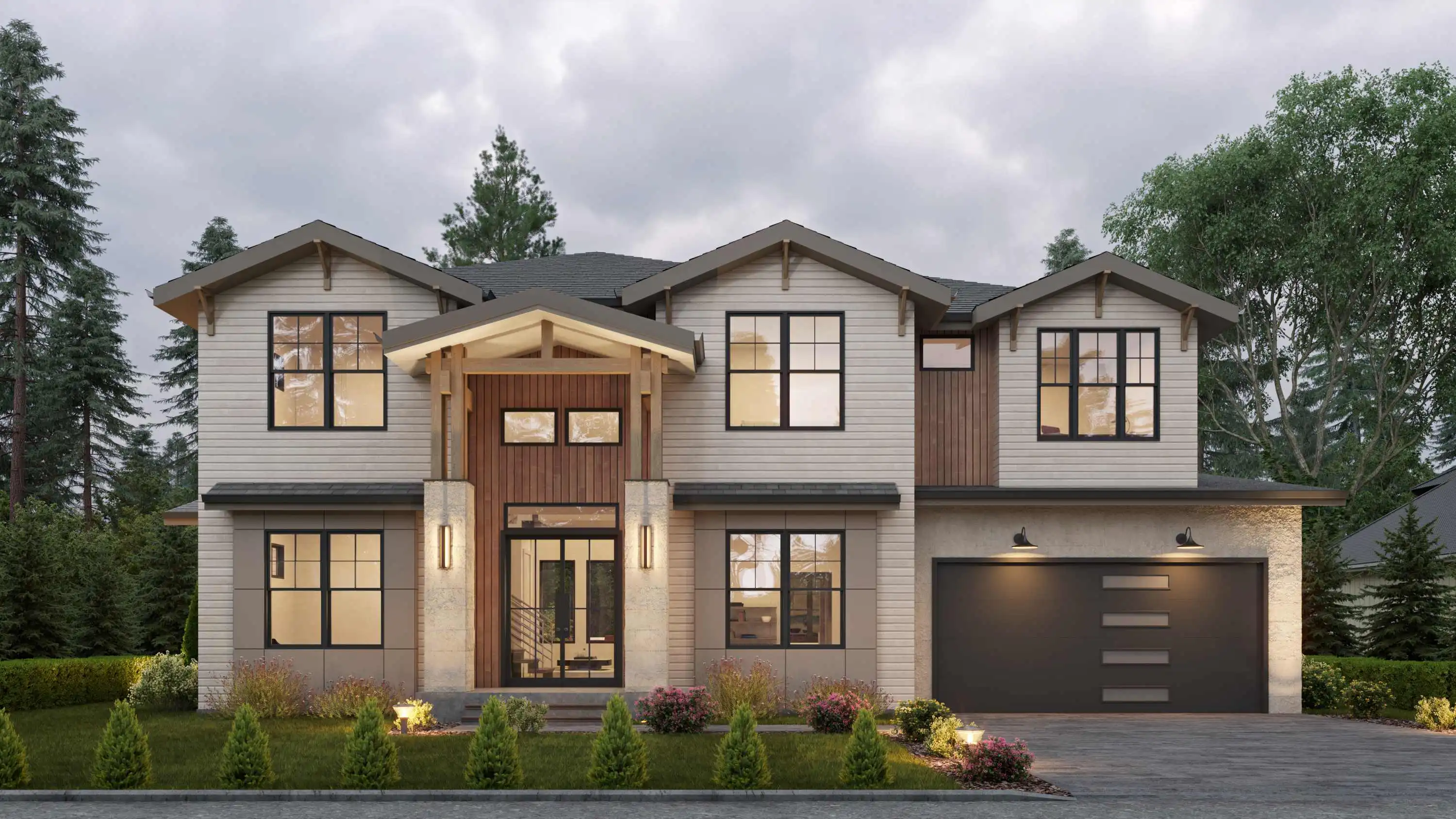 This stunning 4,054 square foot Craftsman-style home plan boasts a spacious open floor plan. The great room, spanning two stories, features a cozy fireplace, while the gourmet kitchen offers plenty of counter space, a large island with seating, and a cozy nook. Completing the main floor are a formal dining room, a home office, and a guest suite. Upstairs you'll find a luxurious master suite with a sitting area, two ensuite bedrooms, a bonus room, and a laundry room.