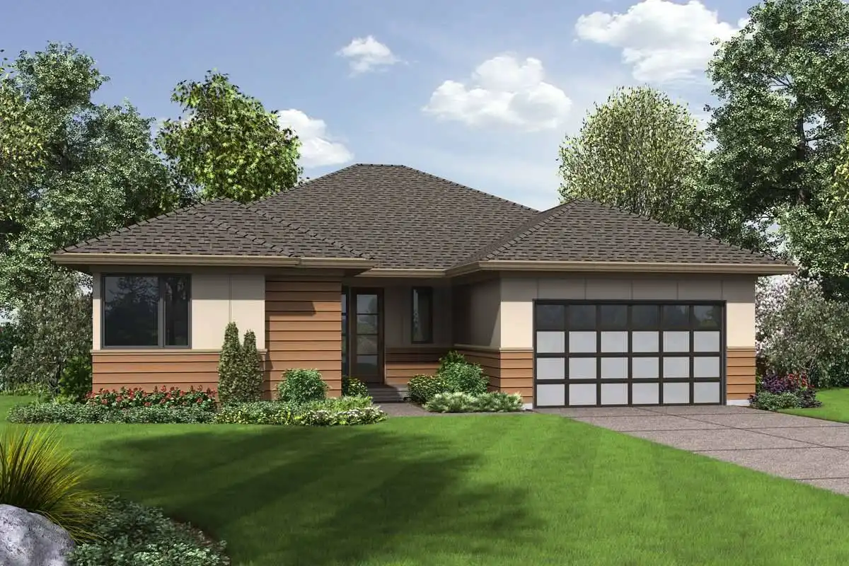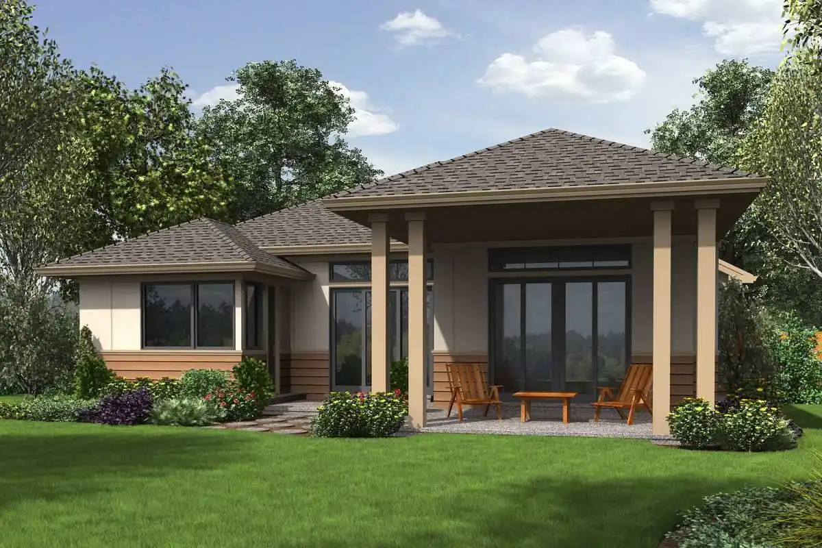 Modern ranch style house plan does not lose sight of the fact that this home is packed full of useful rooms and features. Prime for the fast-paced 21st century lifestyle, this 2,175 square foot home has enough space to accommodate everyone. The 4 bedrooms and 2.5 bathrooms are all located on the ground level. However, the master suite has been given its own side of the layout, giving extra privacy and plenty of room. A dining and living room combination pair well with the chef’s kitchen and large island. This plan also offers a flex room which can be used as an office, a rec room, or anything in between. Additionally, this home comes complete with a covered outdoor living area, keeping you safe from the elements while still enjoying the outdoors.