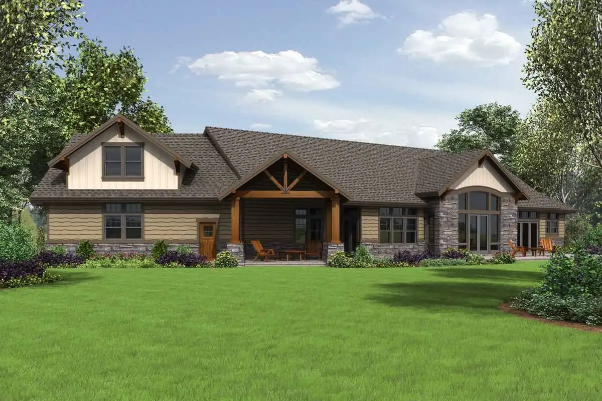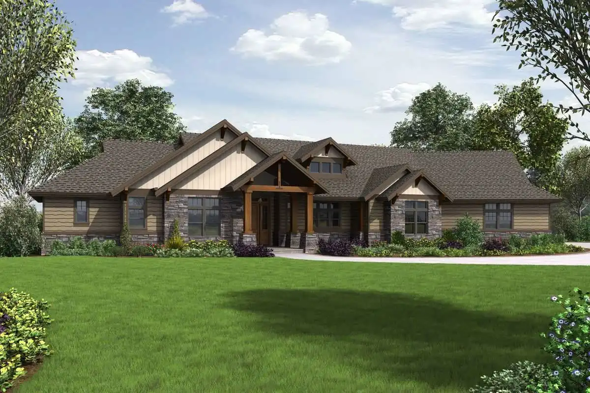 This craftsman ranch style house plan is meticulously crafted, down to the last detail. The result is a beautiful 3,156 square foot home that offers timeless beauty and unending use. True to its style, this ranch home contains almost all of its rooms on the first floor, including the impressive great room and kitchen areas, which flow together seamlessly, making entertaining a breeze. Additionally, this home offers 3 bedrooms, highlighted by the master bedroom and its enormous walk-in closet with an island. The outdoor space of this home is dedicated to work alongside nature, with several designated beds for landscaping and incorporating the surrounding flora. Above the 3-car garage is an almost 650 square foot bonus room, full of all of the space and potential that one could need to make this house a fully functional home.