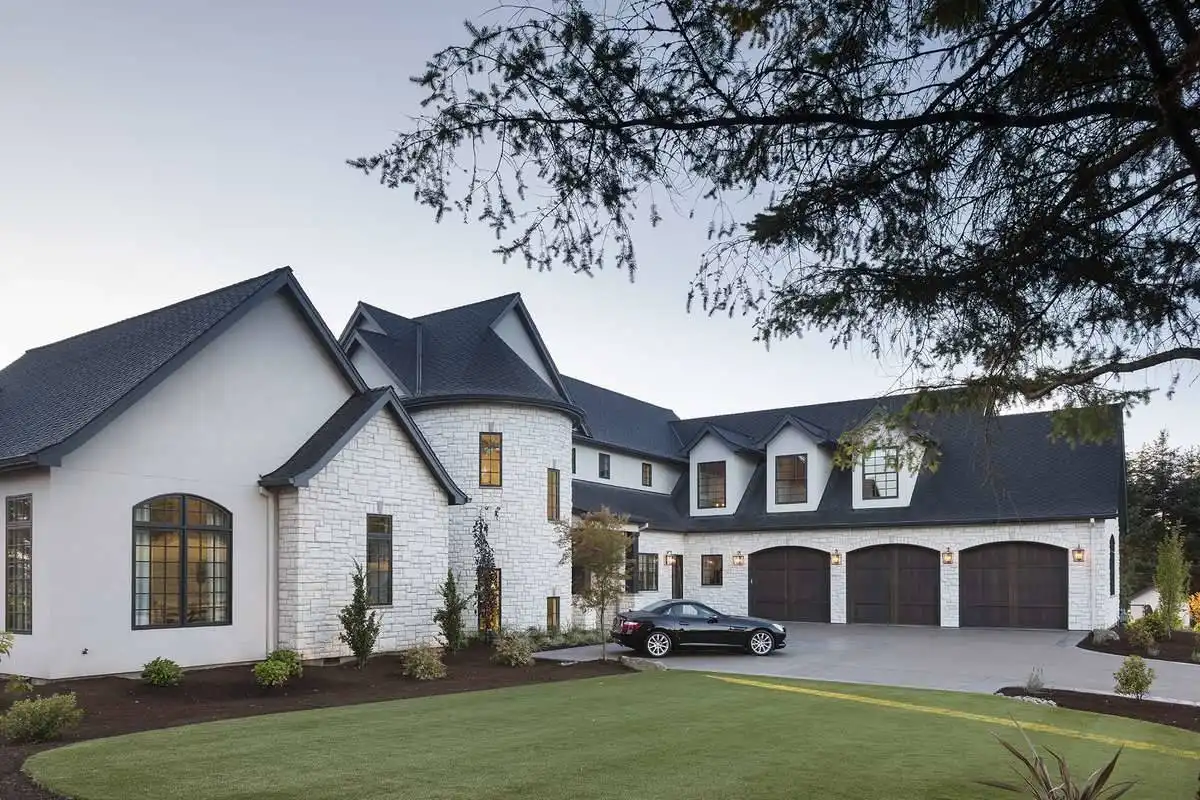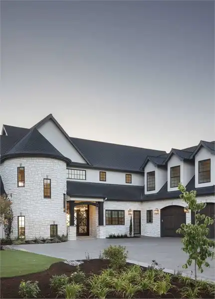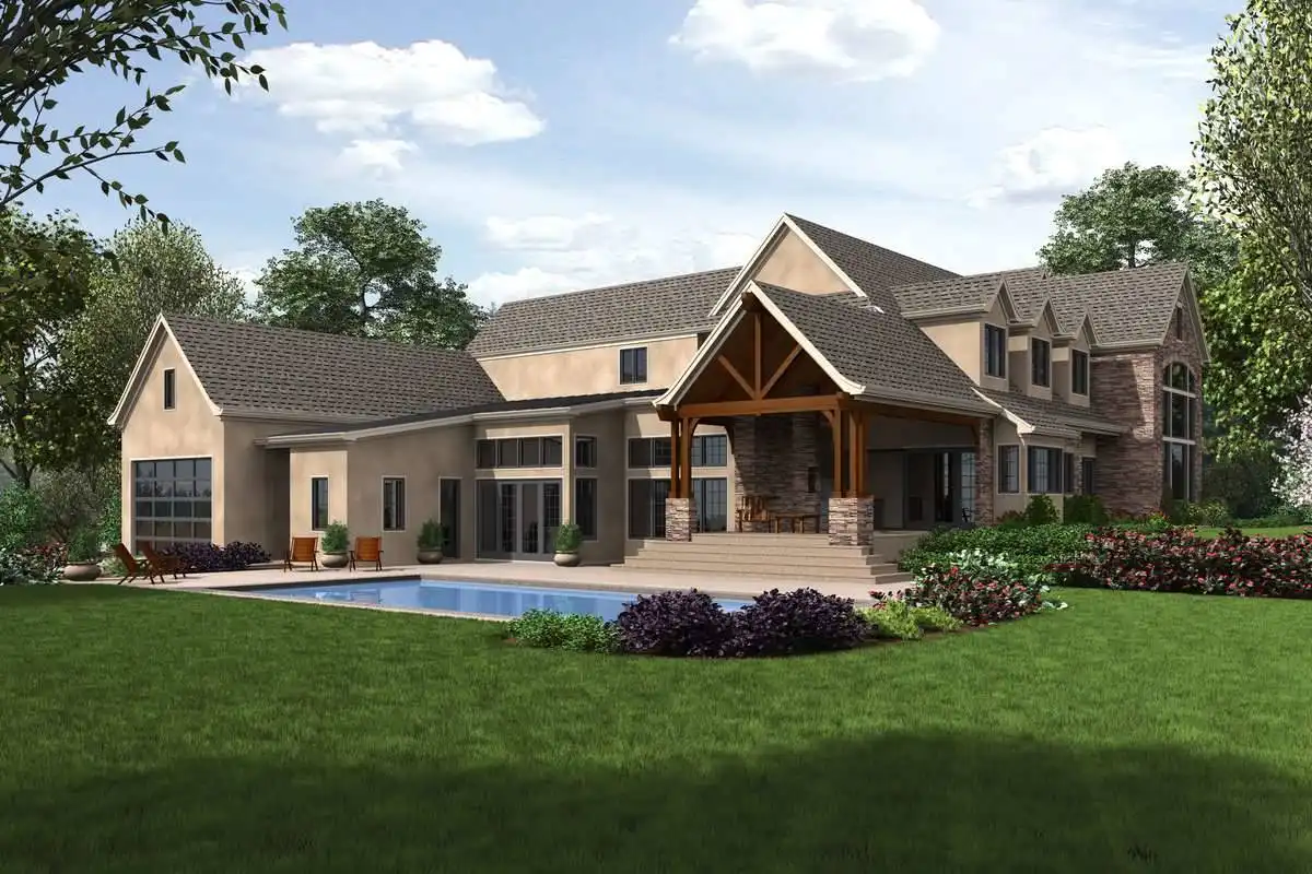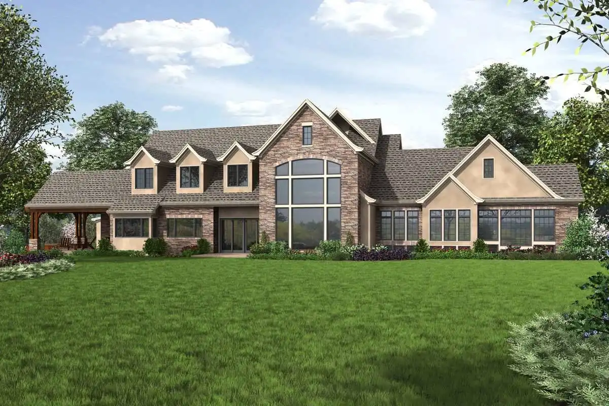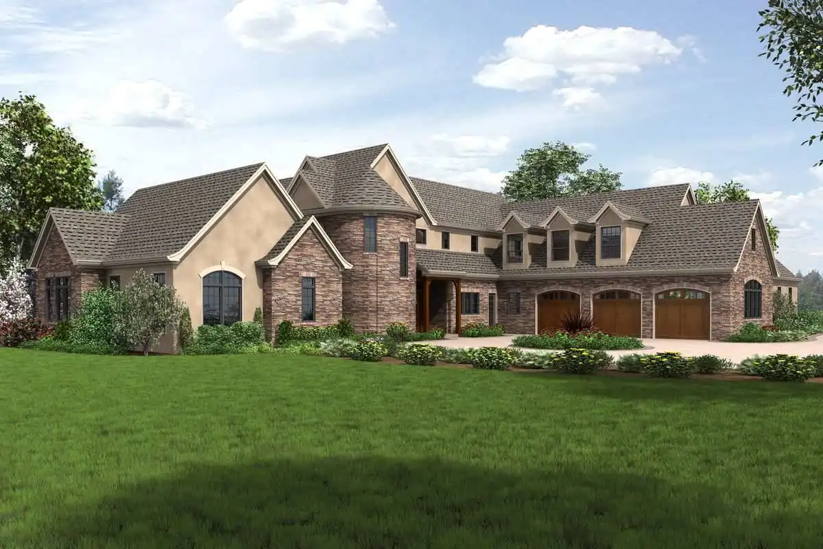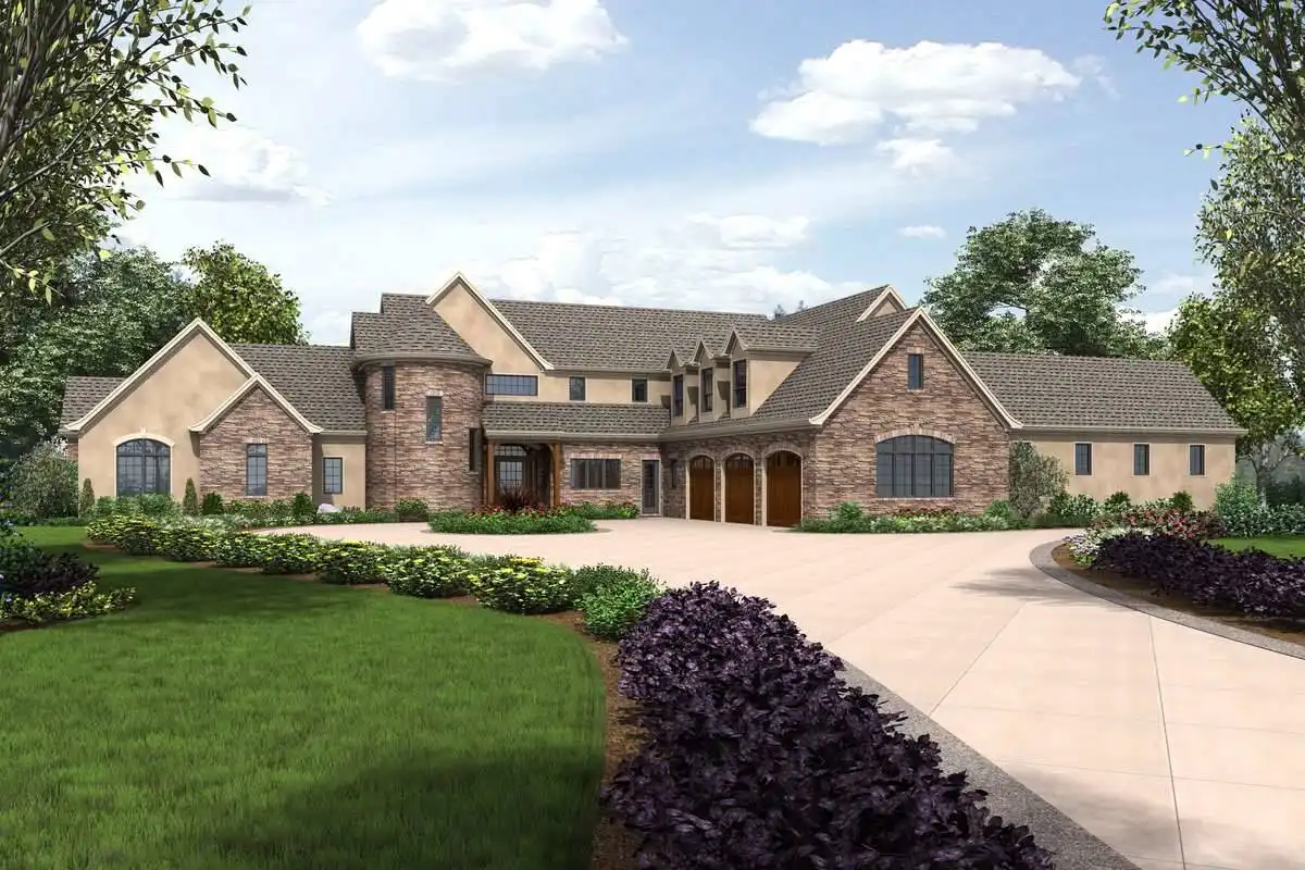 European style house plan, bathing the interior in sunlight. With 7,149 square feet, this home is truly the stuff of dreams. With rooms that you couldn’t even imagine having, this 4 bed, 4.5 bath home makes those dreams reality. The first floor is packed full of surprises that cater to every whim and desire that you may have. A stunning spiral staircase greets the entryway which spills out in to the 2-story great room, complete with the aforementioned cathedral window. The right wing of the main floor is home to an office and one of the most beautiful master suites available. The double doors open to the vaulted ceilings of the bedroom, while you move through to the luxurious bathroom and it’s his and hers separate walk-in closets. The other side of the main floor is where all of the general common areas are located, such as the kitchen and dining room and the massive eat-in island. The kitchen opens to the outdoor entertainment area which makes parties and barbecues an ease. With the outdoor kitchen and ready-made designs for an in-ground pool, the entire neighborhood will be jealous of this home. As an added bonus, the main floor has dedicated space for a shop or in-home gym, as well as a large game room, and even a golf simulator room for an especially unique flair. The second floor is much more understated but still as functional, housing 2 bedrooms, a study, and a massive guest bedroom, perfect for extended stays from the in-laws. The space and design of this plan have all of the features that you could want and more; going a long way towards making that dream a reality.
