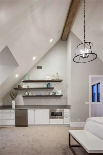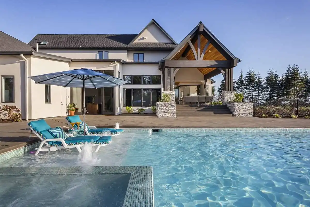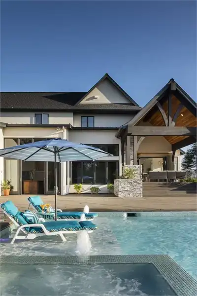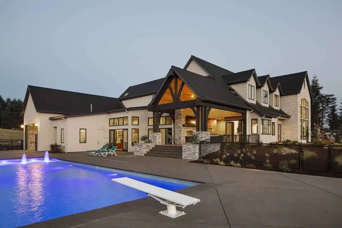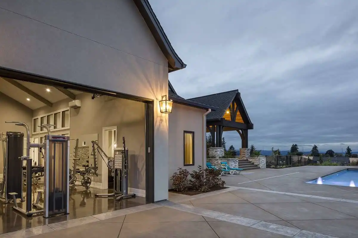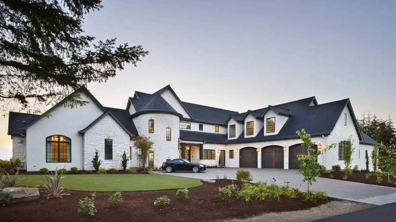 European style house plan, bathing the interior in sunlight. With 7,149 square feet, this home is truly the stuff of dreams. With rooms that you couldn’t even imagine having, this 4 bed, 4.5 bath home makes those dreams reality. The first floor is packed full of surprises that cater to every whim and desire that you may have. A stunning spiral staircase greets the entryway which spills out in to the 2-story great room, complete with the aforementioned cathedral window. The right wing of the main floor is home to an office and one of the most beautiful master suites available. The double doors open to the vaulted ceilings of the bedroom, while you move through to the luxurious bathroom and it’s his and hers separate walk-in closets. The other side of the main floor is where all of the general common areas are located, such as the kitchen and dining room and the massive eat-in island. The kitchen opens to the outdoor entertainment area which makes parties and barbecues an ease. With the outdoor kitchen and ready-made designs for an in-ground pool, the entire neighborhood will be jealous of this home. As an added bonus, the main floor has dedicated space for a shop or in-home gym, as well as a large game room, and even a golf simulator room for an especially unique flair. The second floor is much more understated but still as functional, housing 2 bedrooms, a study, and a massive guest bedroom, perfect for extended stays from the in-laws. The space and design of this plan have all of the features that you could want and more; going a long way towards making that dream a reality.