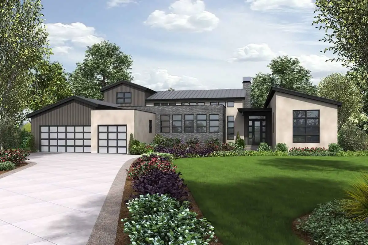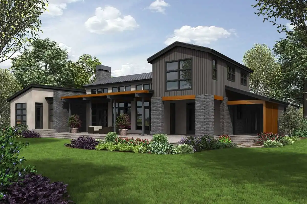 Contemporary house plan is as amazing as the layout and all of its features. The massive vaulted living room and its floor to ceiling glass that opens to the porch is only part of this home that spans 3,681 square feet. With a 3-car garage and plenty of storage, this home features an astonishing kitchen and walk-in pantry as well as an outdoor kitchen which adds a new level of entertainment to outdoor living. The large master bedroom features high vaulted ceilings as well as an attached private spa bathroom which is the definition of relaxation. While largely a single-floor layout, this plan does feature a second level with a large amount of office space and an attached hobby room. Perhaps the most surprising bonus to this great plan is the sauna that it offers which takes self-care to a whole new level. Not only is this house a modern masterpiece, but it’s a lavish take on the quality of living that you deserve.
