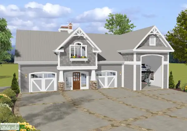 This functional design offers much more than just garage space! The versatile arrangement has parking for 2 vehicles, 1 small RV such as a 4-wheeler, etc. and a larger garage for a boat or a luxury RV. The small RV storage area could also serve as a bunk room since it features a mini kitchen and a bathroom with a shower. Located behind the larger RV storage garage is an eat-in kitchen and another full bath with a shower. A staircase leads up to a private bunk room. The main garage has 9 ft ceilings and accesses a laundry closet, a covered porch and an RV cleanup pad. The upper level is accessed from the bunk room. Upstairs is a home away from home! The spacious family room features a fireplace and a vaulted ceiling with a ceiling fan and has doors leading to a screened porch. Adjoining the family room is an eat-in kitchen with a snack bar. This level is completed by a bedroom which features a separate entry to the main bathroom and a walk-in closet.
