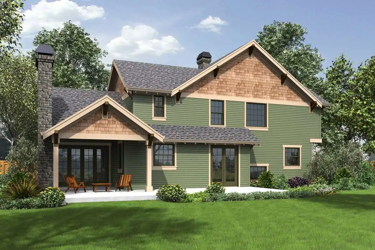 Traditional craftsman style house plan is as unique as they come. Standing 3-stories high, this 3,439 square foot home provides 4 bedrooms and 3.5 bathrooms, as well as many hidden gems. This amazing amount of space begins on the lowest level in which the 3 car garage resides. Also located on this level is a guest bed and bath suite, as well as a full theater and wet bar. Family movie nights will be taken to a whole new level with this fully functional theater and media space. Moving upwards to the main floor, you are greeted with an impressive 2-story great room with built-in window seats and a double-sided fireplace. The other side of the fireplace opens to the den which has a private balcony overlooking the front of the home. The backside of this floor is home to the kitchen and dining room, which provide access to the outdoor living area and its expansive built-in grill and dining area, topped off with an outdoor fireplace. The third and final floor is where the final 3 bedrooms are located, including the master bed and bath and 2 additional bedrooms which share a jack and jill bathroom. The master suite also offers a private balcony, perfect for a romantic evening and a glass of wine while watching the sun set. Overall, this plan offers an outstanding amount of space paired with phenomenal curb appeal, making it a great option to consider as you select your dream home.