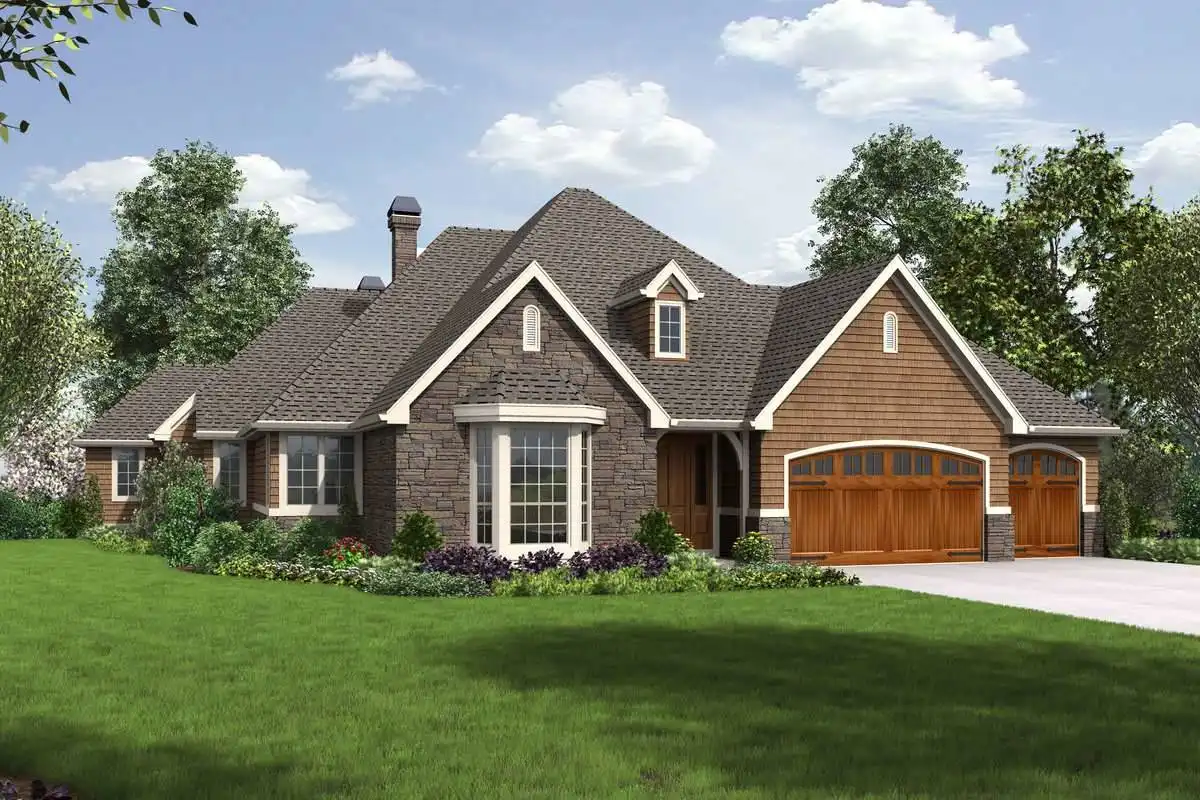 European ranch style plan is a gorgeous take on a popular layout. As with many ranch houses, the 3,044 square feet of this home are housed on a single floor. Past the foyer and 3 car garage, the plan opens in to a beautiful great room with vaulted ceilings and French doors which open to the covered outdoor living space. A gourmet kitchen and large island makes the dining space a true centerpiece. Three bedrooms, including the master suite, adorn the right hand side of the house. The master suite provides a great walk-in tiled shower, as well as separate his and hers walk-in closets. The other two bedrooms also have walk-in closets as well as separate bathrooms and a shared shower space. While it might be a popular home style, you have never seen a ranch plan quite like this one