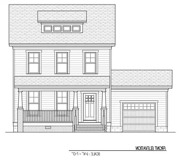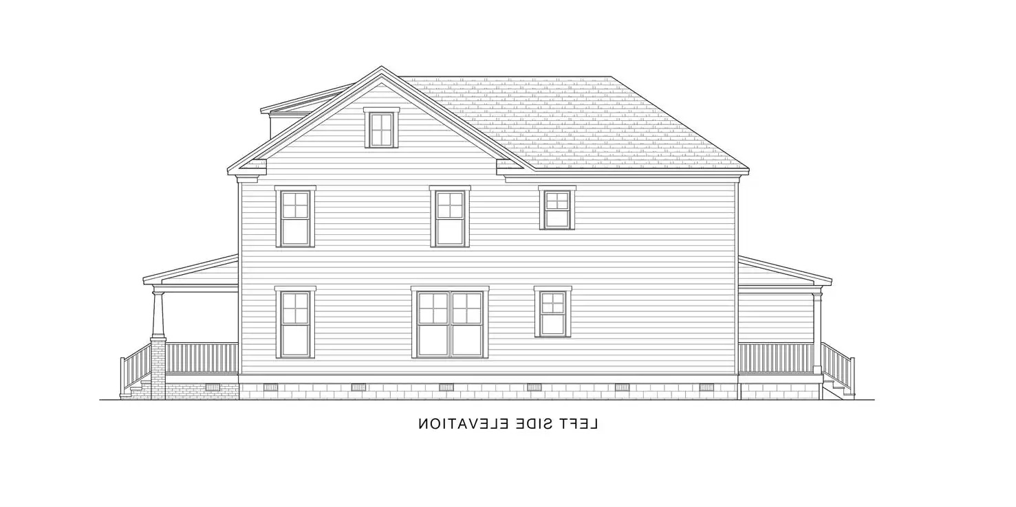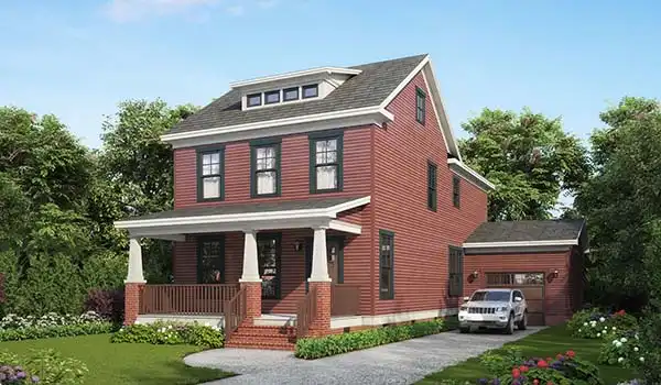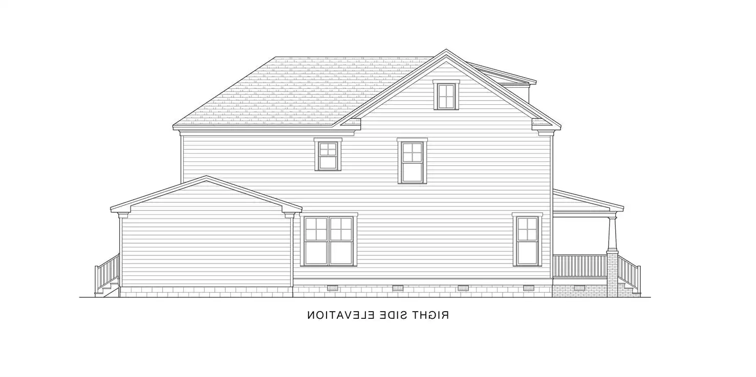 This 2-story southern style home is designed for a narrow lot and features an optional third floor. A single car attached garage can easily be eliminated to allow a driveway to reach a larger detached garage behind the house on the left side. Another special feature of this model is that it has two master suites. The main home is 24' wide, offering a lot of living space on a narrow project site.