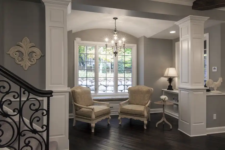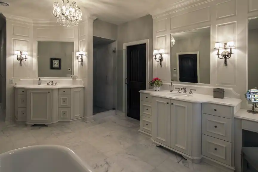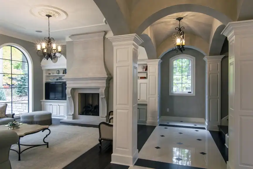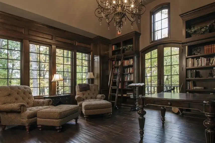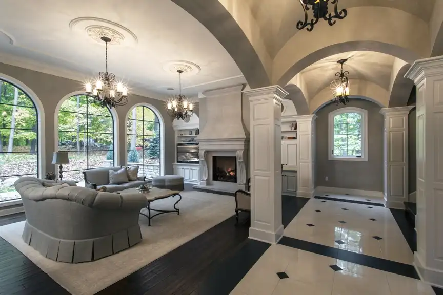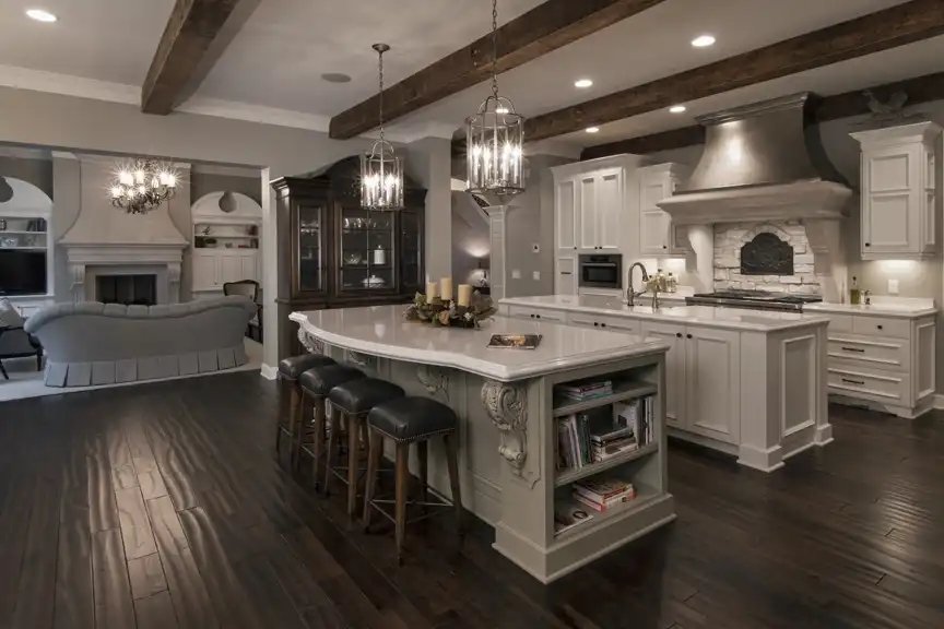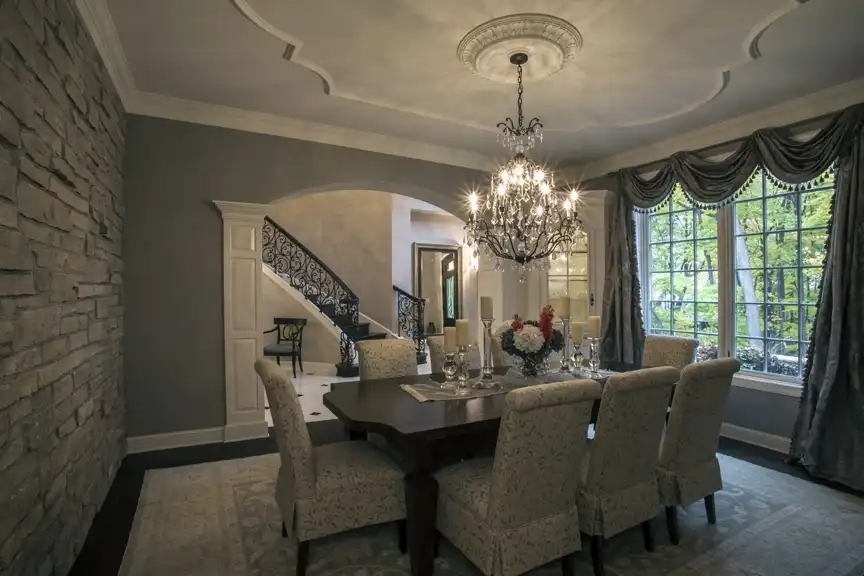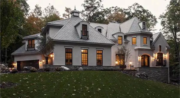 This is a French Country styled home. It has a wonderful open floor plan with 4,919 square feet of heated living space between two floors. It has four bedrooms, four bathrooms and one half bath with the master being on the second floor . The exterior features two attached garages, both able to fit two cars each. As well as a gorgeous covered patio in the rear.