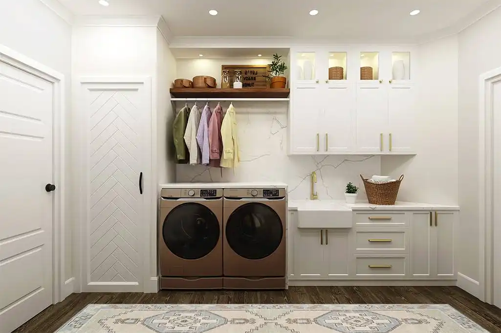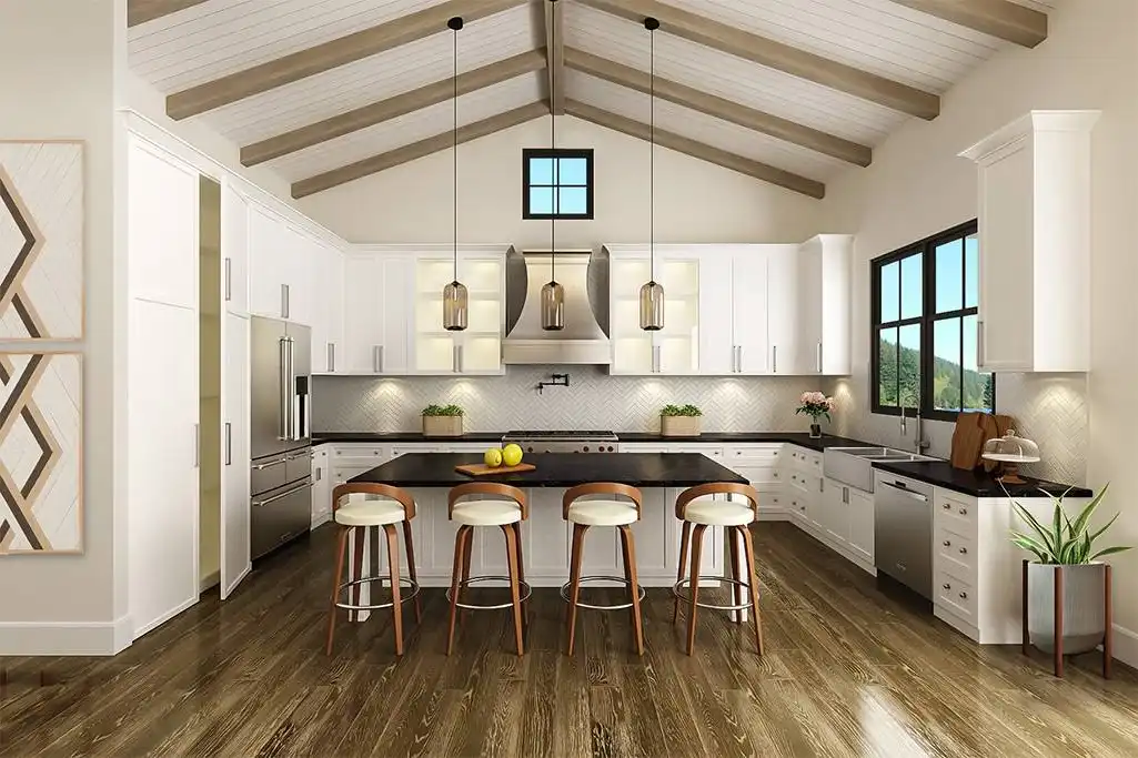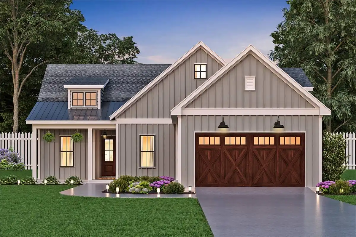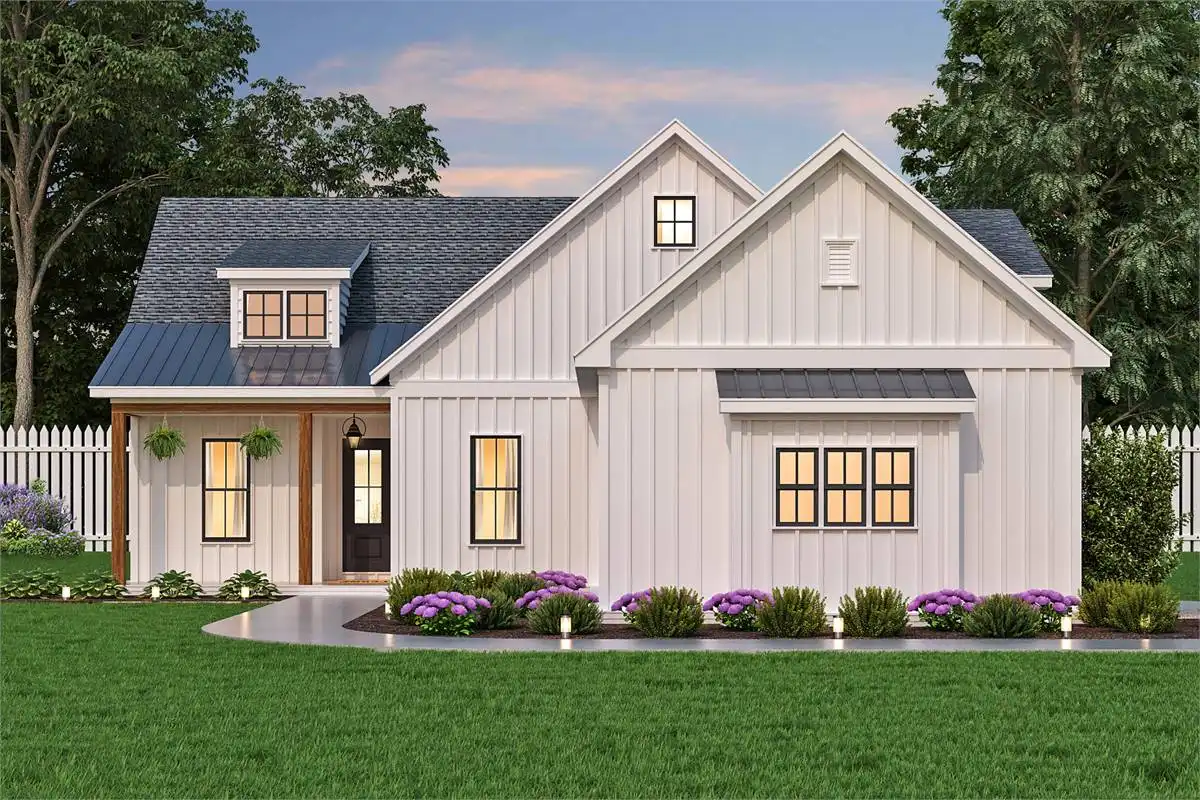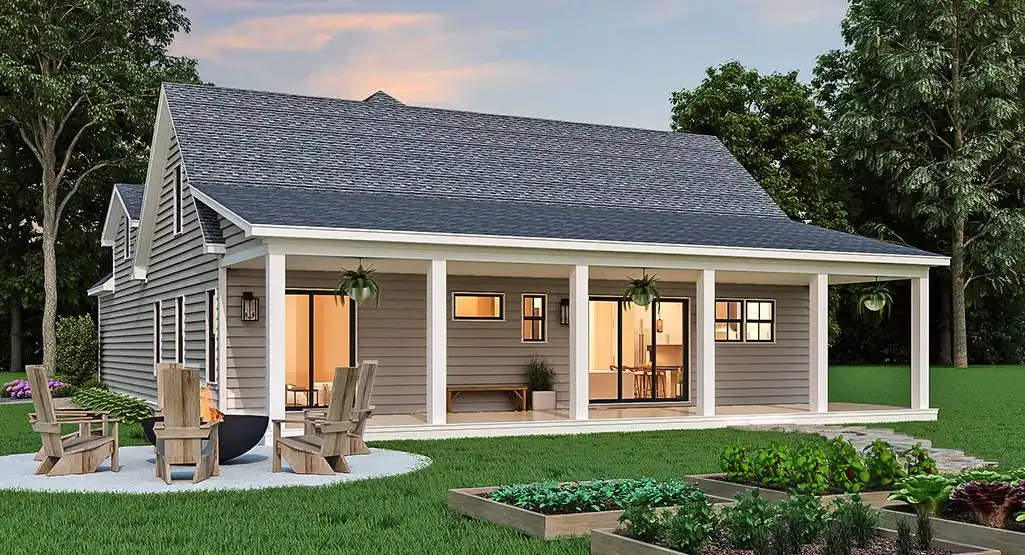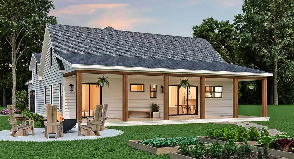 A fully customizable country farmhouse plan, this 1,637 square foot home is perfect to grow alongside you and your family. Beginning with a 3 bedroom 2 bathroom layout, the design can have a second story or a basement added if you'd like. Or add both, the choice is yours and the customization potential is endless! The main level is totally open and inclusive. Rooms such as the vaulted family room and the cheery island kitchen are accessible and spacious throughout. There is also a home office nearby. For outdoor living consider adding a kitchen and fireplace lounge area to the covered porch. And for even more relaxation, check out the nearby master suite featuring dual closets and a spacious bathroom. Finally, head down the hall to reveal a guest bedroom, the laundry, and an attached garage with a workbench, perfect for the hobbyist in you!