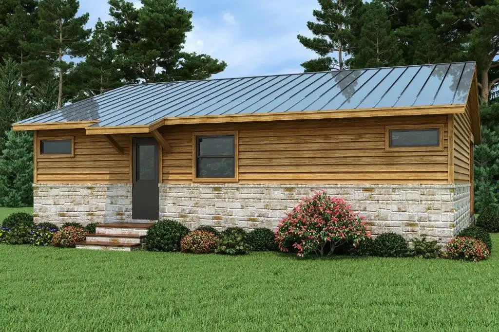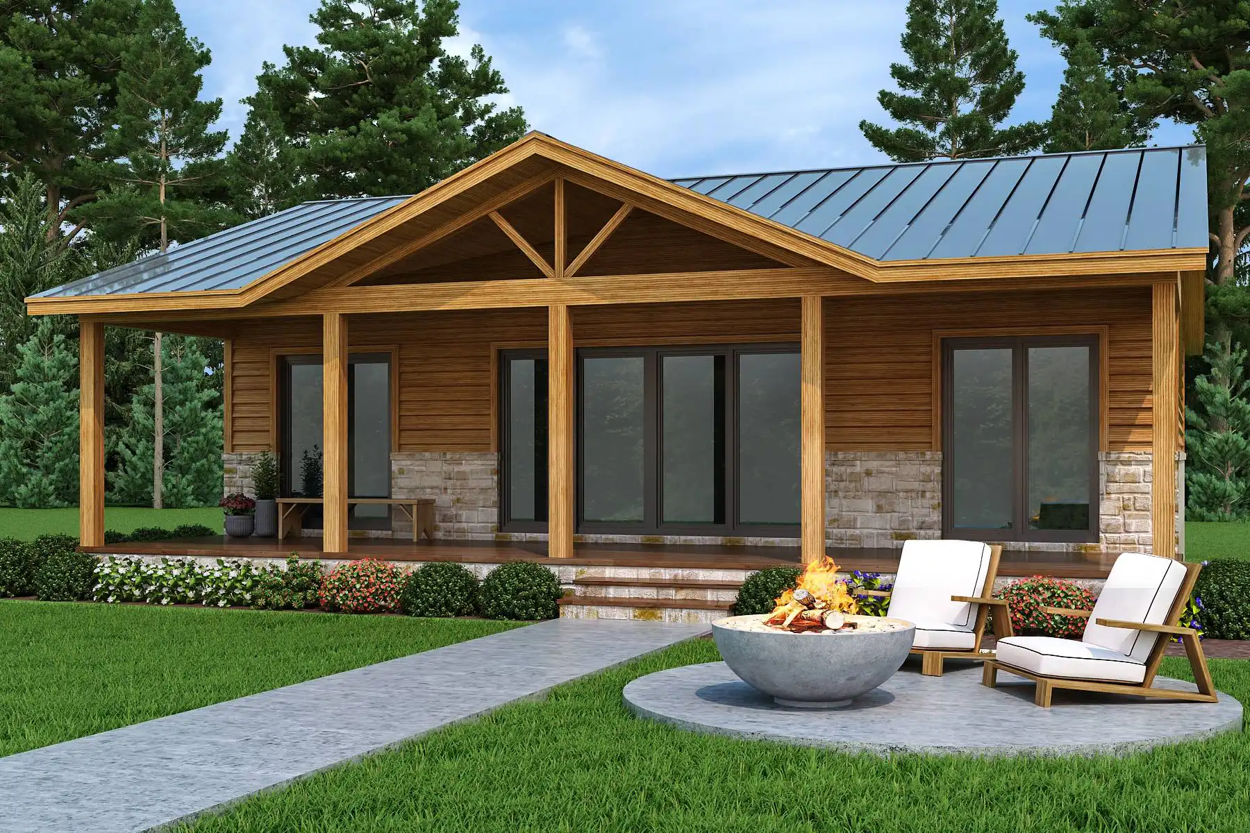 This charming rustic cabin features a 10-foot deep front porch, perfect for relaxing and taking in the scenic views. The cozy interior features 1,153 square feet with two bedrooms, two full baths, a vaulted great room and functional L-shaped kitchen. With its simple yet functional design, this cabin is an ideal retreat for those seeking a peaceful and comfortable getaway in the mountains or countryside.