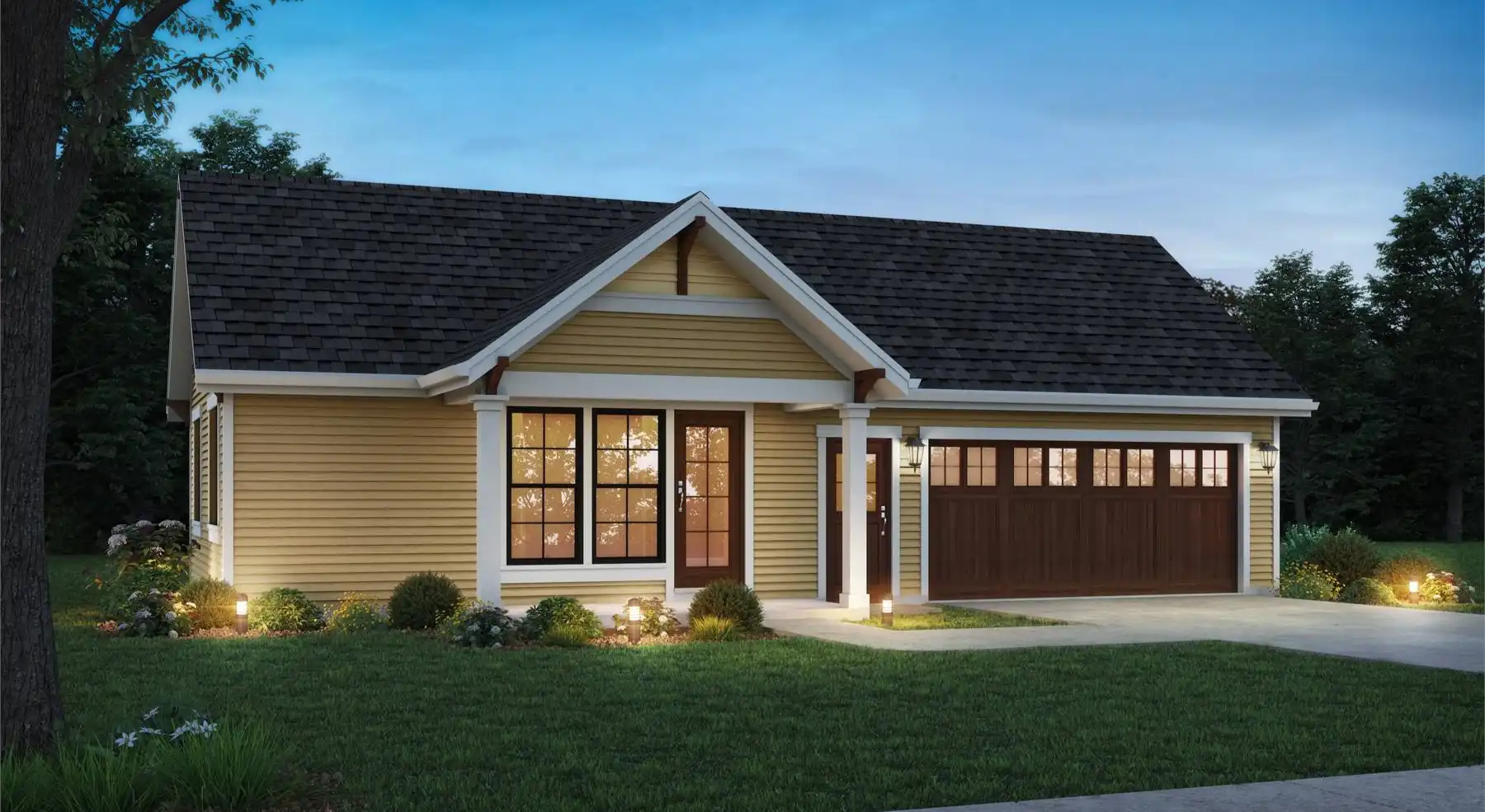 This one-story house plan seamlessly combines a 506 square foot, two-car garage at the front with a comfortable 506 square foot, one-bedroom, one-bath home at the back. The garage features both a wide door for vehicles and a convenient side entrance. The home layout is thoughtfully designed for efficiency and comfort. This plan is perfect for those who need a practical yet cozy living space, and it can be customized to fit your specific needs.
