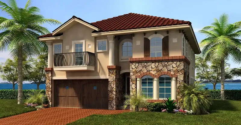 This Beach style house plan features 2,637 square feet, 3 bedrooms and 4.5 bathrooms. The size of the house would fit perfectly on a narrow lot. The exterior detail of the home adds that special touch and catches the eye. The extended foyer offers a nice wall for all of those family photos. The dining room is defined by large decorative pillars that separate it from the gourmet kitchen, including a pantry, lots of built-ins, and plenty of counter space that any gourmet chef could appreciate. A free-standing island in the center of the kitchen has a built-in range top. A breakfast room and family room offer easy access to the covered patio. The family room has a 20-foot ceiling, a corner warming fireplace, and built-ins. A sweeping staircase adjacent to the family room leads to the second story. The master suite boasts a trey ceiling and luxurious bath with separate garden tub and shower, his and hers vanities, and a large wardrobe. A utility room and powder room can easily be accessed from the master wardrobe as well as a one and two car garage. Upstairs two-family bedrooms each have a full bath with walk-in closet and storage space. A game room with powder room and a rear balcony offer plenty of space for family fun. A second master suite has a private balcony and boasts a master bath with his and hers vanities, a shower, and large walk-in closet. This room could also be used as a guest suite or in-law suite, completing this two-story luxury Mediterranean house plan.