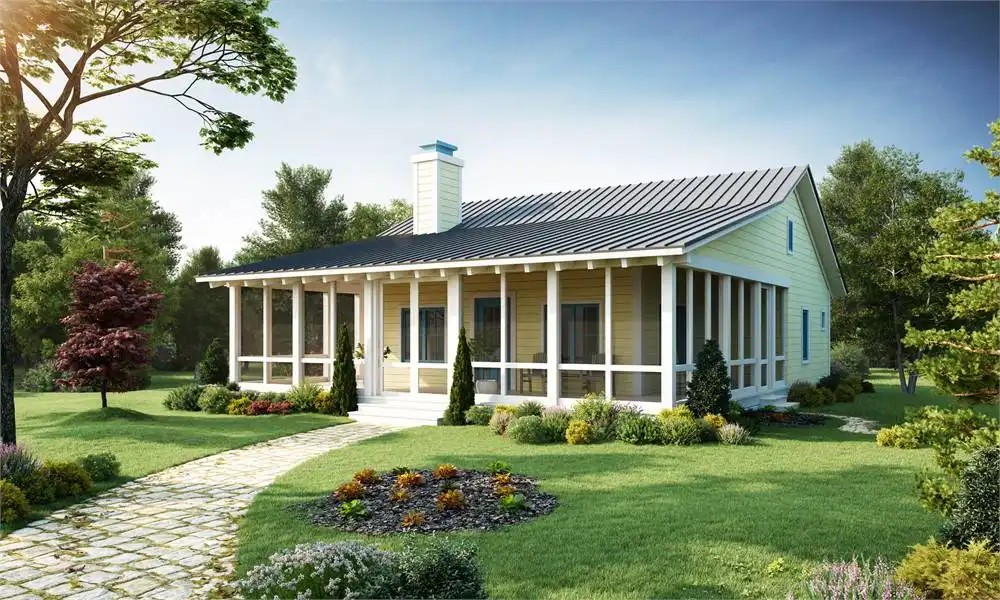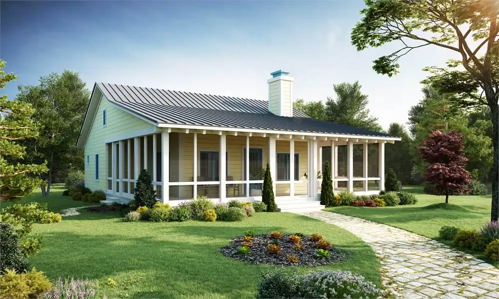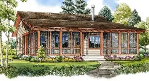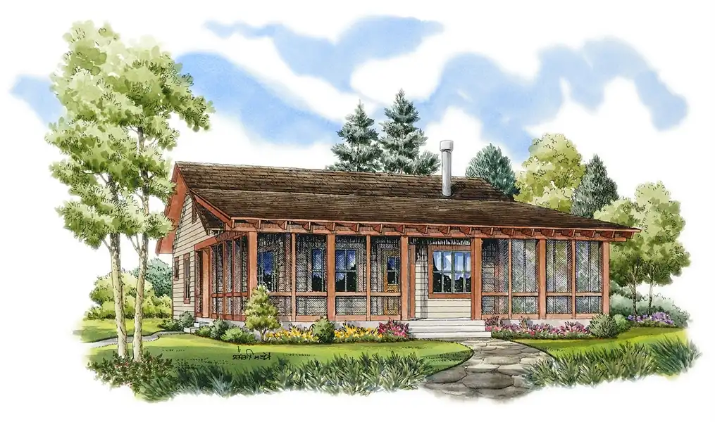 A wraparound screened porch seems to welcome guests to this country one-story house plan, with two bedrooms, two baths and an affordable 1,031 square feet of living area. The living and dining rooms in this home plan are enhanced by a fireplace and a vaulted ceiling, perfect for entertaining. The cozy kitchen offers snack space for four. Personal baths and walk-in closets are showcased in the two quiet bedrooms of this home design. Our customers love the ample porch space for fresh-air relaxation and dining.