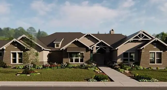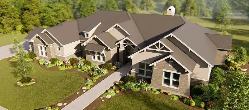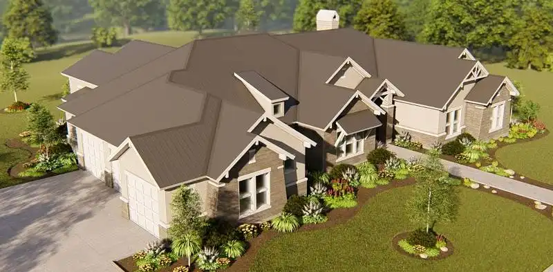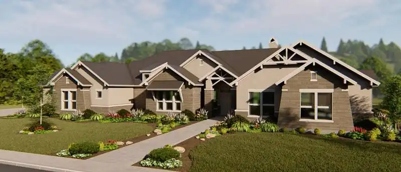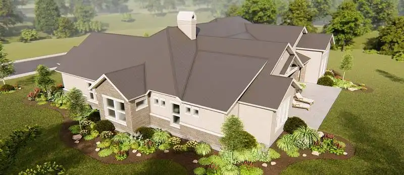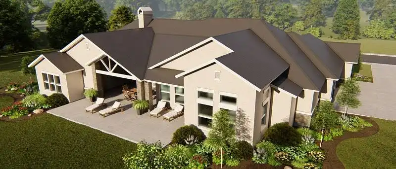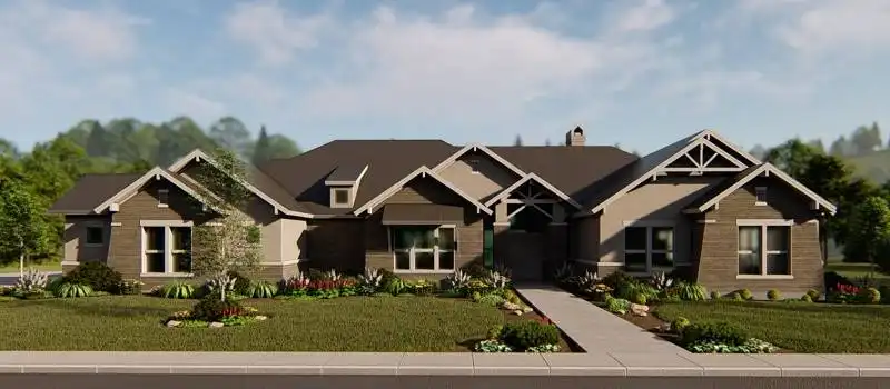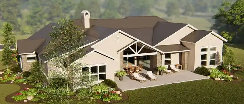 Repeated gables give a striking appearance to this four-bedroom ranch house plan. The layout of the home plan includes extra spaces for entertaining and fun. A fireplace warms the vaulted great room, which is spacious and inviting. The island kitchen features a nearby pantry. Meals may be served in the dining area or on the vaulted porch. Play pool with friends in the vaulted game room, or watch a movie in the media room. The deluxe master suite provides peaceful backyard views. The private bath with an oval tub and a sit-down shower leads to a personal exercise room. Three additional bedroom suites are suitable for children or guests.