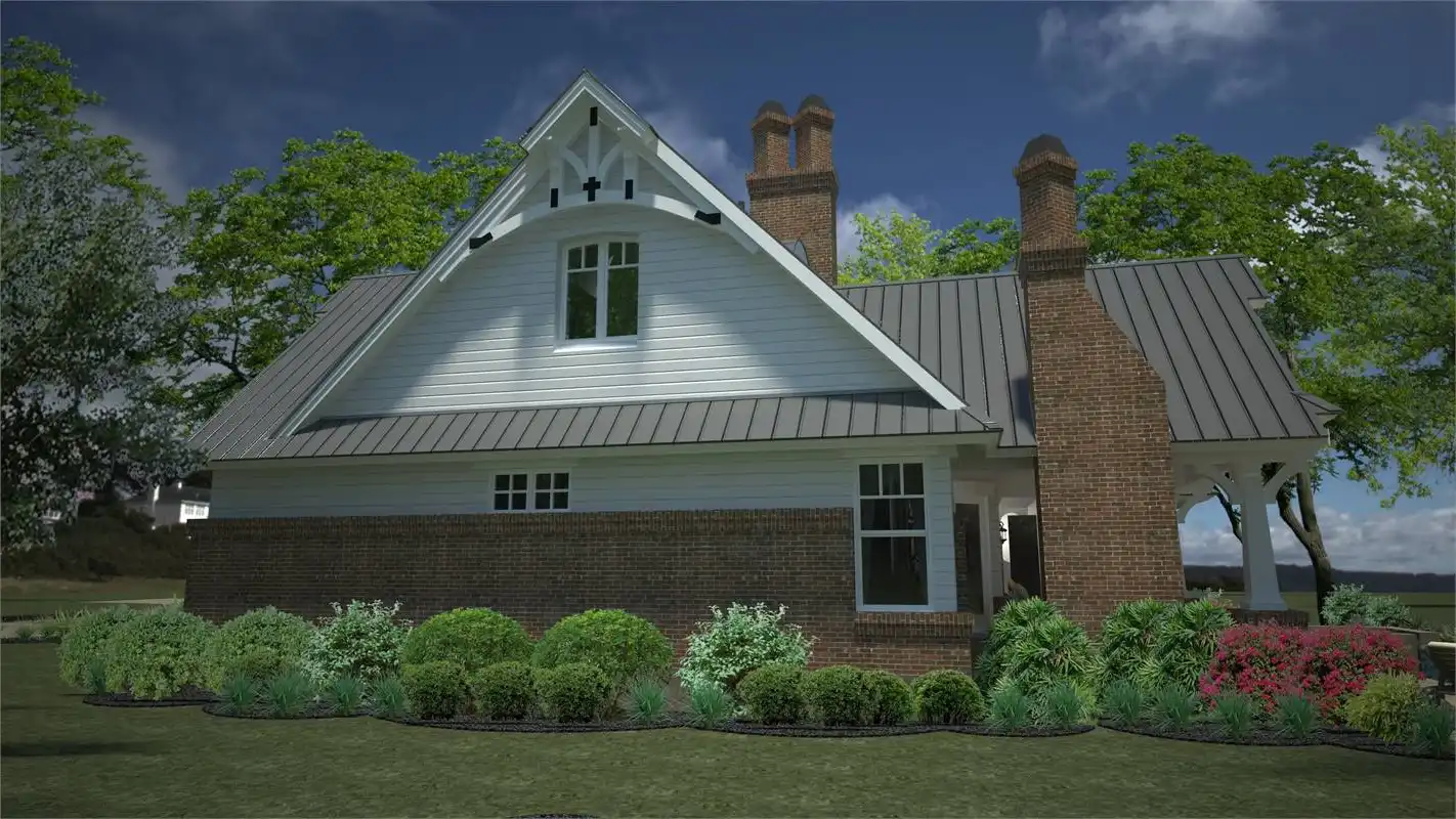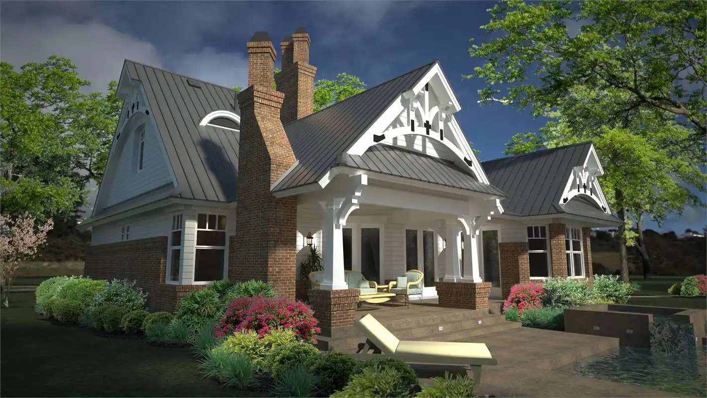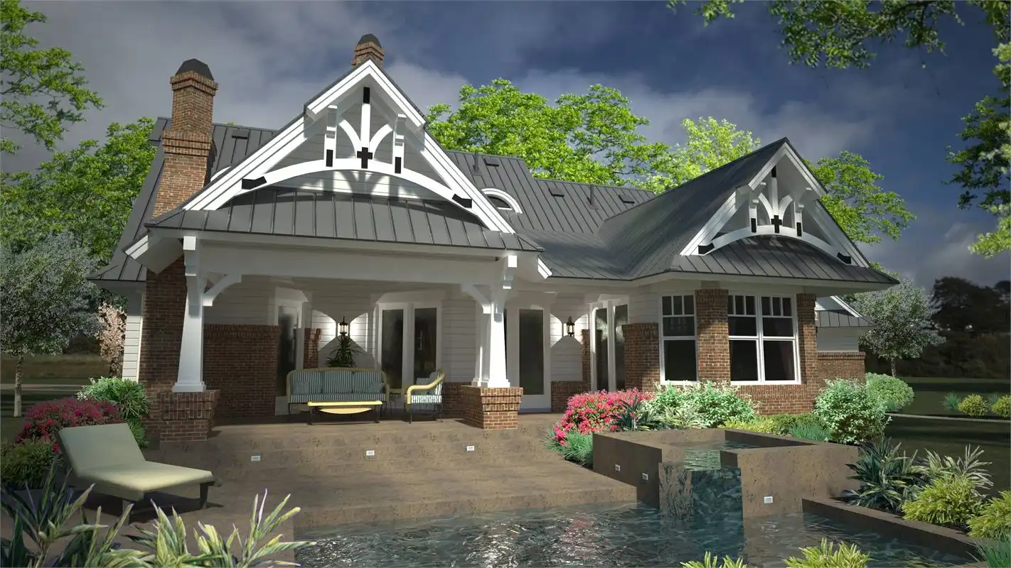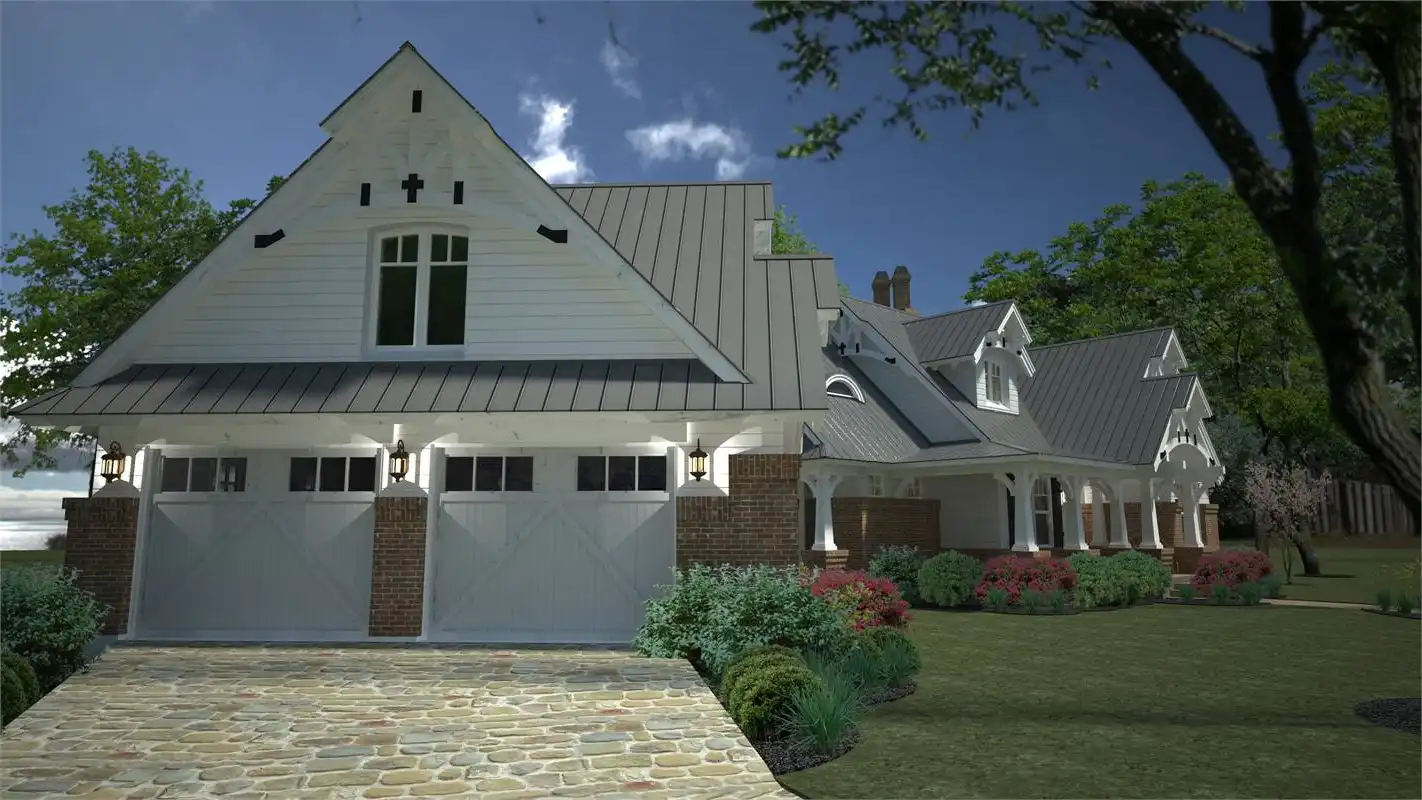 This is our brand new version of the hugely popular Merveille Vivante house plan. Due to popular demand, this home design is now available in a country farmhouse style, but with all the features that makes this versatile 1,421 square foot home plan so charming. The first floor offers an efficiently designed open floor plan featuring a dining room, living area, and a kitchen with a large island for serving and entertaining. A covered lanai with fireplace is accessed through the family room and kitchen making outdoor entertaining easy. There's plenty of room to grow with a 504 square feet second floor bonus space and fully finished optional basement. The 2-car garage can be left detached or is available as an attached option.