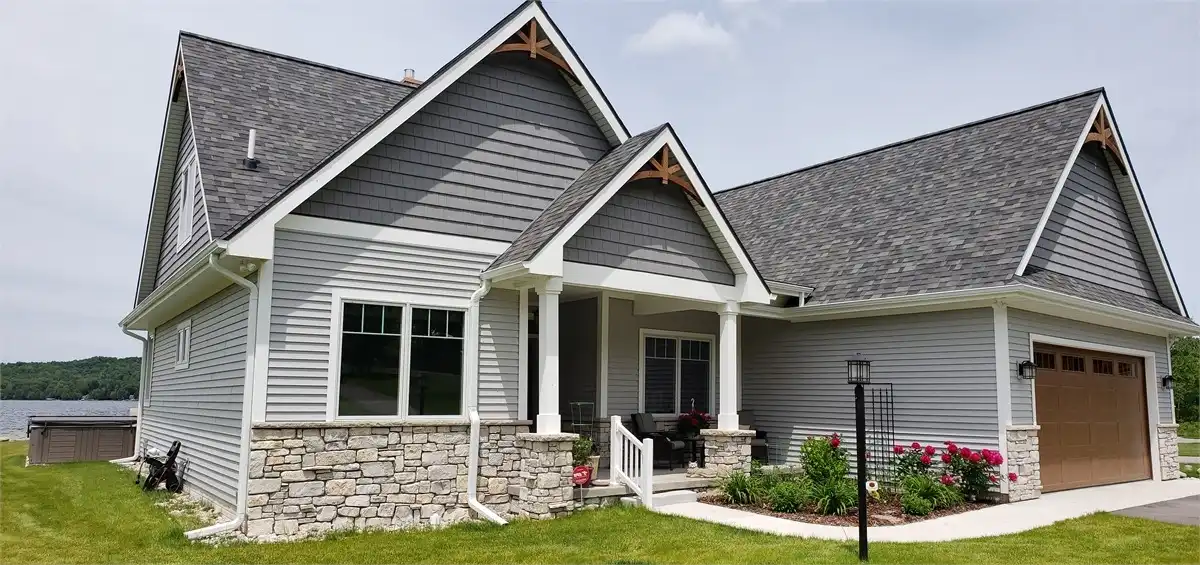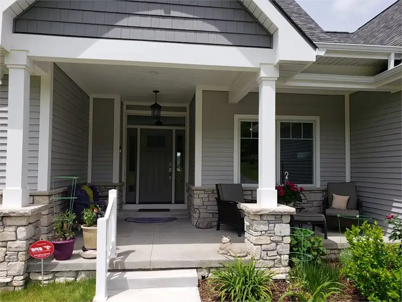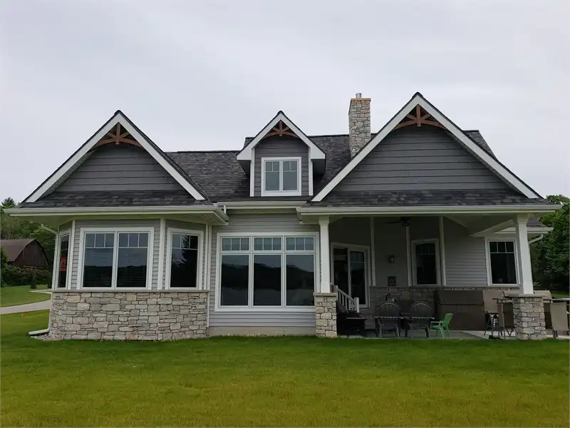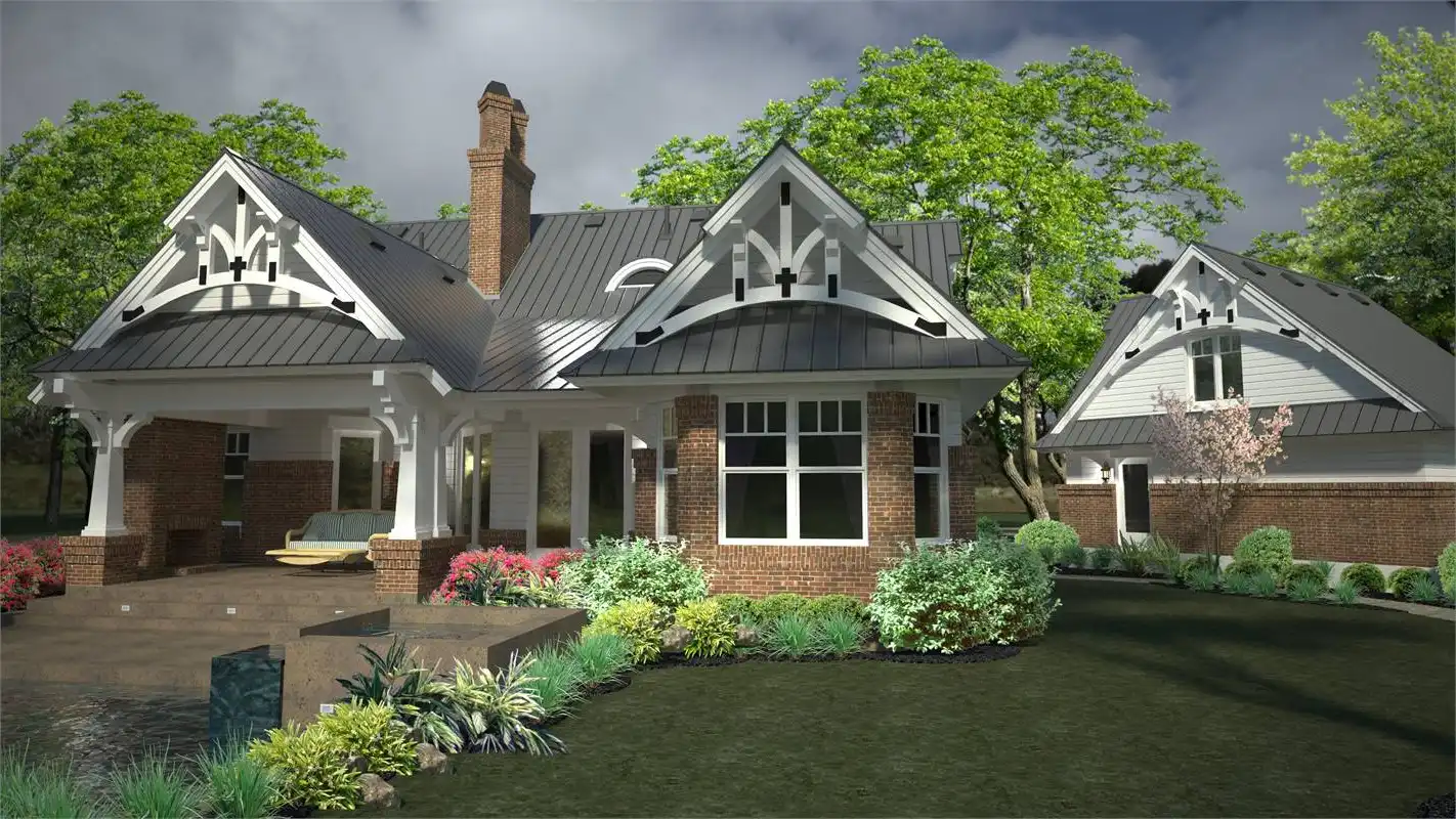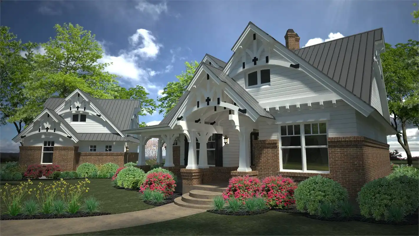 This is our brand new version of the hugely popular Merveille Vivante house plan. Due to popular demand, this home design is now available in a country farmhouse style, but with all the features that makes this versatile 1,421 square foot home plan so charming. The first floor offers an efficiently designed open floor plan featuring a dining room, living area, and a kitchen with a large island for serving and entertaining. A covered lanai with fireplace is accessed through the family room and kitchen making outdoor entertaining easy. There's plenty of room to grow with a 504 square feet second floor bonus space and fully finished optional basement. The 2-car garage can be left detached or is available as an attached option.