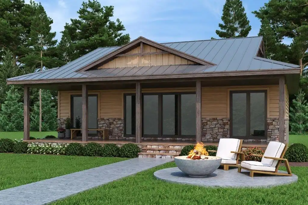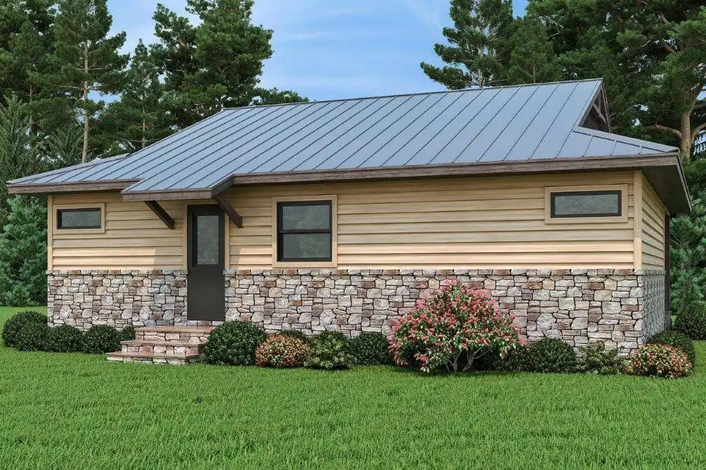 House Plan 2326 is an affordable lake cottage with 1,153 square feet, two bedrooms, two bathrooms, and a detached two-car garage. It packs its space into a neat rectangular footprint with open living in the middle and bedroom suites split to the sides. Check out that island kitchen overlooking the vaulted great room! It has a closet to the side that contains the pantry and stacked laundry. One of the bedroom suites has a three-piece bath while the other offers a four-piece bath--and you can choose the pieces you want with two different layouts!