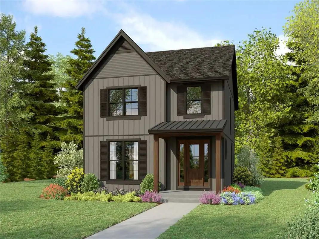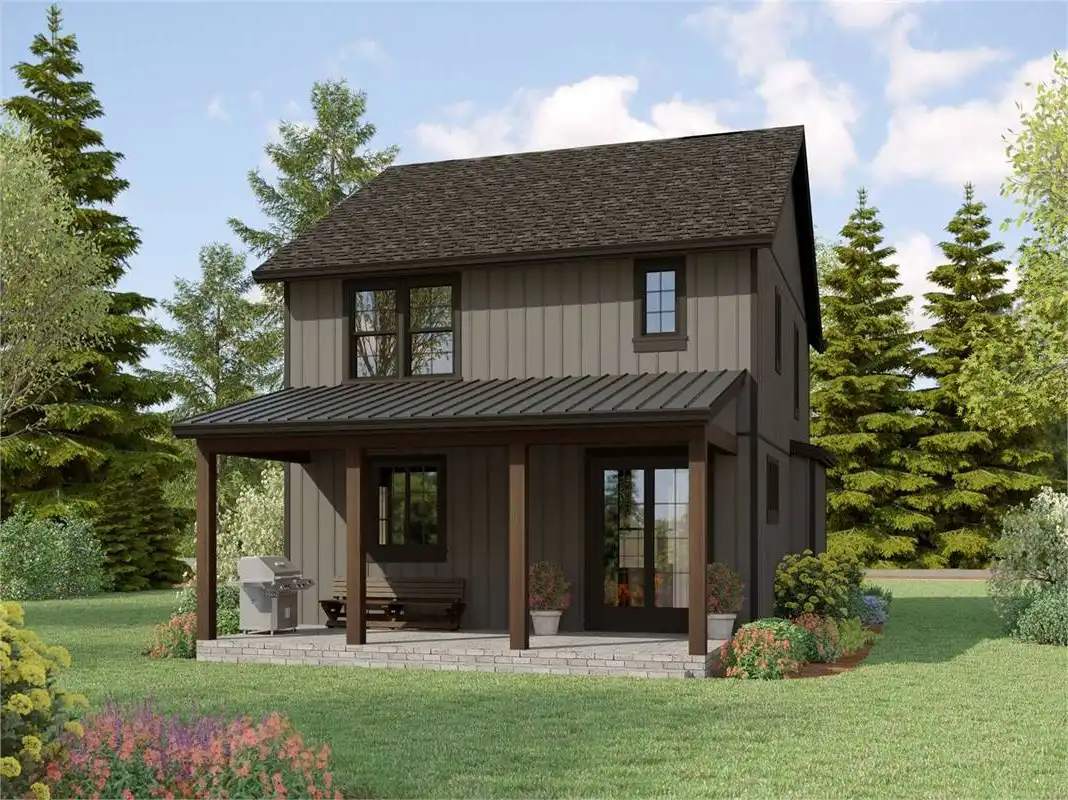House Plan 2330 is a cute little cottage offering 1,658 square feet, three bedrooms, and two-and-a-half bathrooms across two stories. The main level is open-concept, with living space in front and the island kitchen and dining area in back. There's also a powder room by the foyer and a laundry closet in the kitchen. The bedrooms are grouped upstairs and include a vaulted, four-piece primary suite and two bedrooms that share a four-piece hall bathroom.