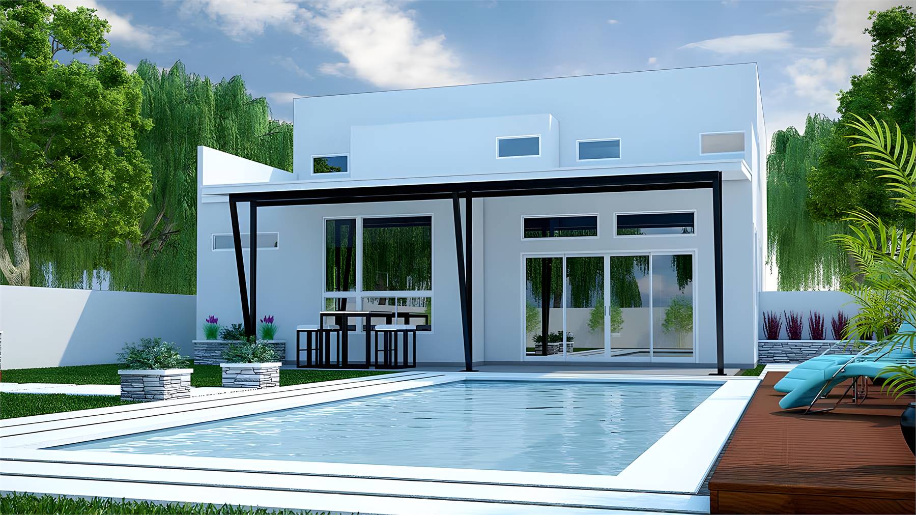 House Plan 2342 is a striking two-story modern home with 3,228 square feet, four bedrooms, and two-and-a-half bathrooms to serve a family well. And with its simple shape, it'll fit into most neighborhoods with ease! Step inside and the main floor places the study off the entry area, the great room farther inside with the island kitchen overlooking the dining and living spaces, and the primary suite tucked behind the garage. Don't miss the sloped ceilings in the living area and primary bedroom! Upstairs, you'll find the rec room, media room, a wet bar, and three bedrooms that share a conveniently divided hall bath. This layout has so much potential for growing families and busy hosts!
