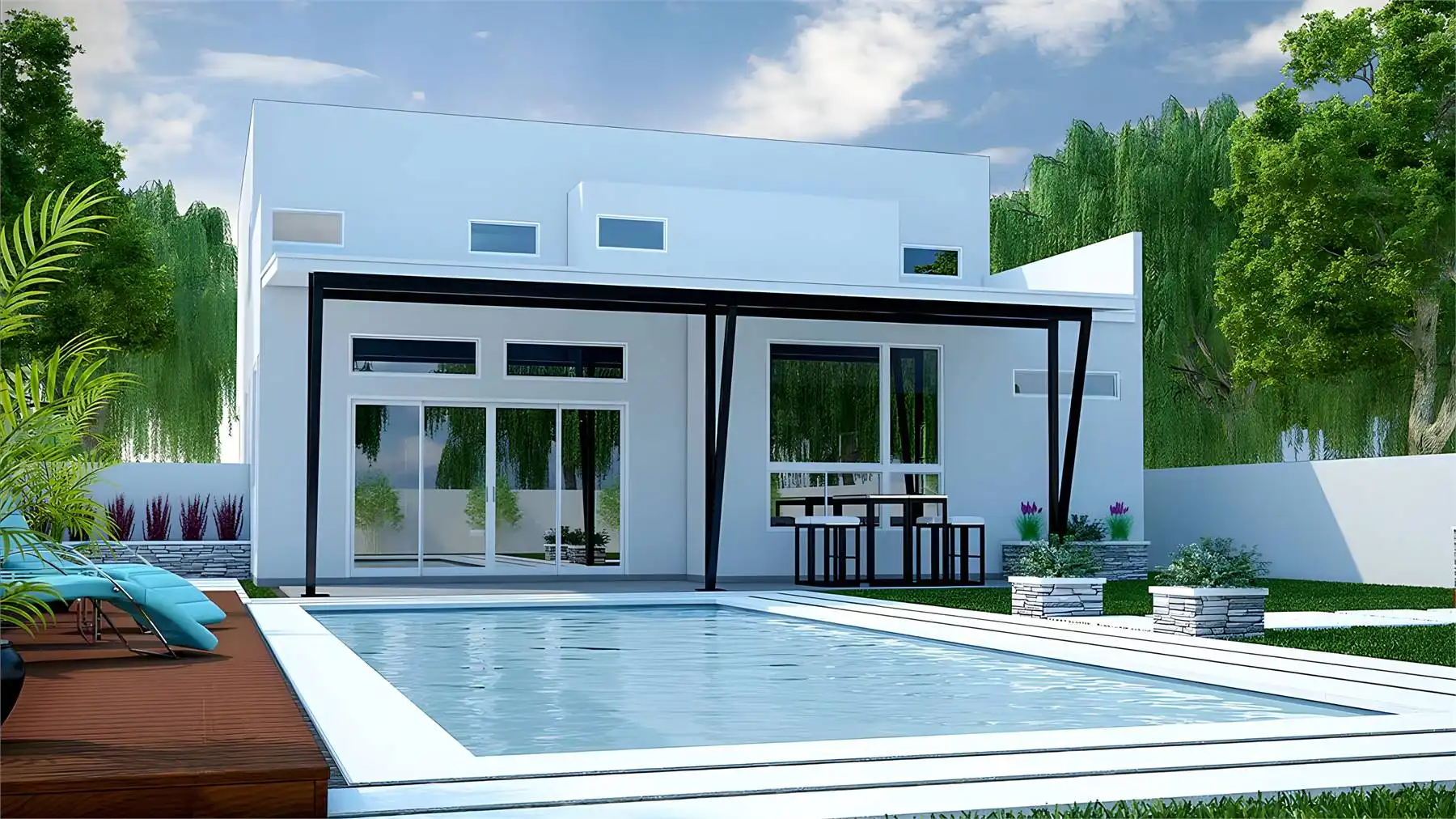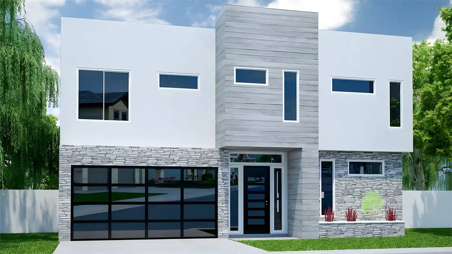 House Plan 2342 is a striking two-story modern home with 3,228 square feet, four bedrooms, and two-and-a-half bathrooms to serve a family well. And with its simple shape, it'll fit into most neighborhoods with ease! Step inside and the main floor places the study off the entry area, the great room farther inside with the island kitchen overlooking the dining and living spaces, and the primary suite tucked behind the garage. Don't miss the sloped ceilings in the living area and primary bedroom! Upstairs, you'll find the rec room, media room, a wet bar, and three bedrooms that share a conveniently divided hall bath. This layout has so much potential for growing families and busy hosts!
