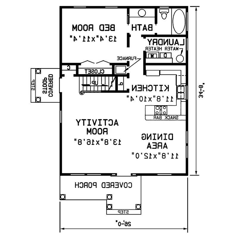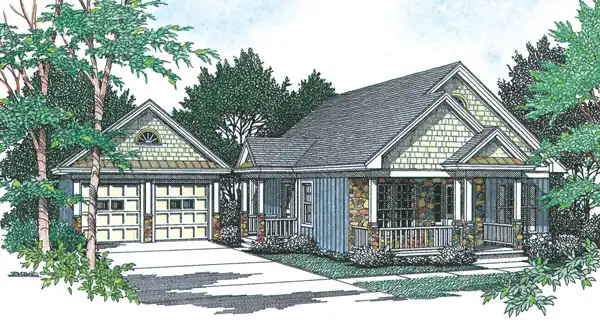 Multiple roof lines on the front of this home are particularly impressive. A covered porch with steps provides a classic air of quality. Big dramatic spaces greet you upon entrance to the home. The great room and dining area are open to one another in a room that is both expansive and impressive. The adjacent U-shaped kitchen is designed with a snack bar counter for quick service of meals on the run. Adjacent and convenient are furnace and pantry closets. A full size laundry room is centrally located to serve all areas of the home. The master bed room and bath are directly to the rear of the home, with the master bath positioned so as to accommodate daytime use. Stairs to the second floor border the great room, while outside access and a coat closet are strategically placed. The upstairs houses two bed rooms and a central family bath. Breathtaking sloped ceilings add excitement to the rooms. The exterior of the home is a combination of vertical siding, stone and cedar shakes. A covered stoop provides sheltered entrance to the side door. The plan is furnished with a detached two car garage in the same style as the home.