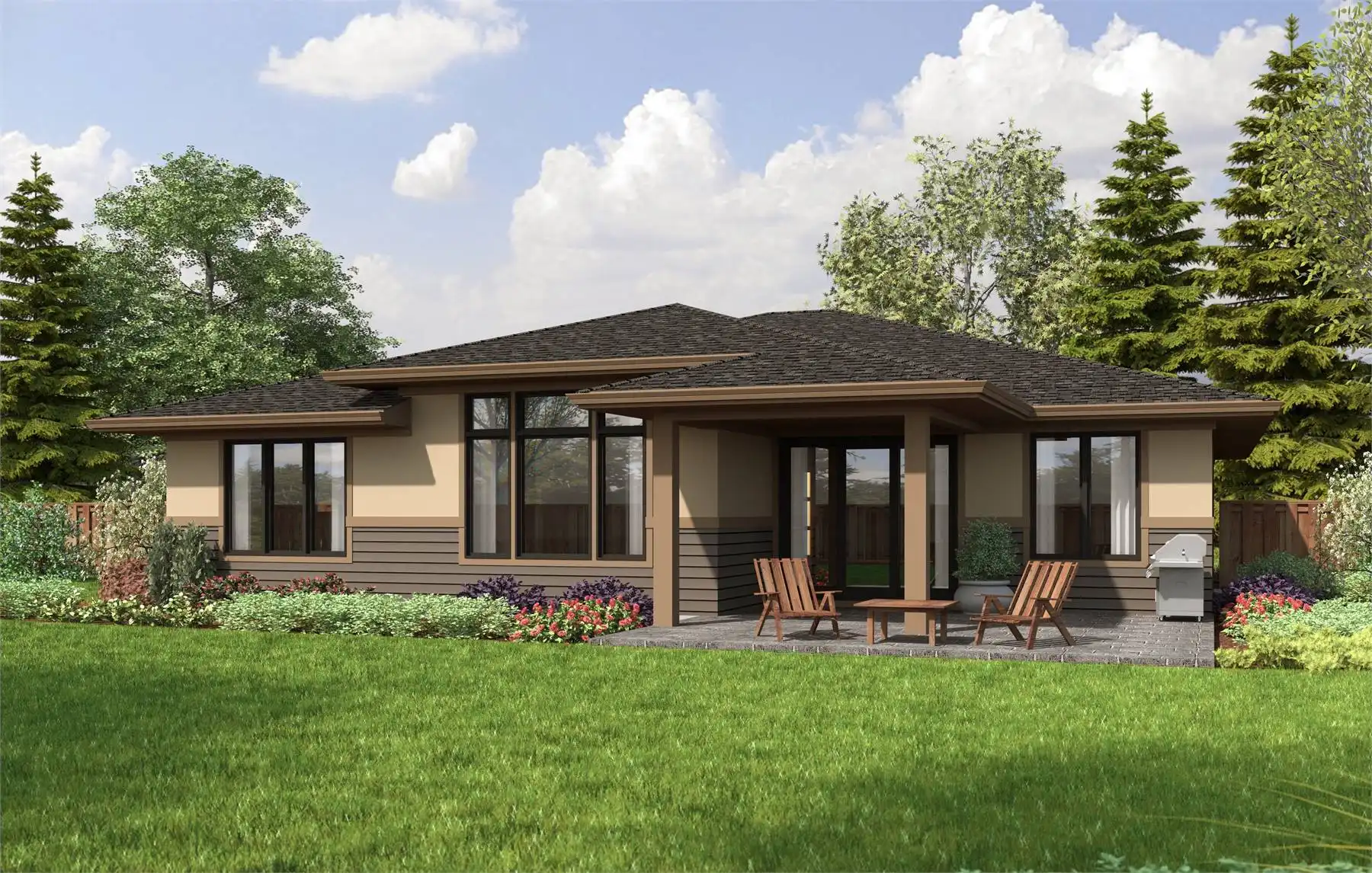 Are you looking for a midsize home with a convenient single-level layout? Something with understated modern style that'll fit right into most neighborhoods with ease? Take a look at House Plan 2348, a contemporary ranch with a low-profile facade and 2,272 square feet. Inside, you'll find three bedrooms, two baths, and a flex room in addition to the open-concept living spaces. Two secondary bedrooms and a nearby hall bath sit on one side of the foyer while the laundry room and mudroom coming in from the garage are located on the other. The master suite is in one back corner, boasting windows on two sides, a four-piece bath with a tile shower, and a large walk-in closet. The great room offers totally clear sightlines between the island kitchen, dining area, and living space with raised ceilings. Finally, the flex room fills out the other back corner and could make another bedroom or office, if you prefer. House Plan 2348 is a great flexible home for today's families!