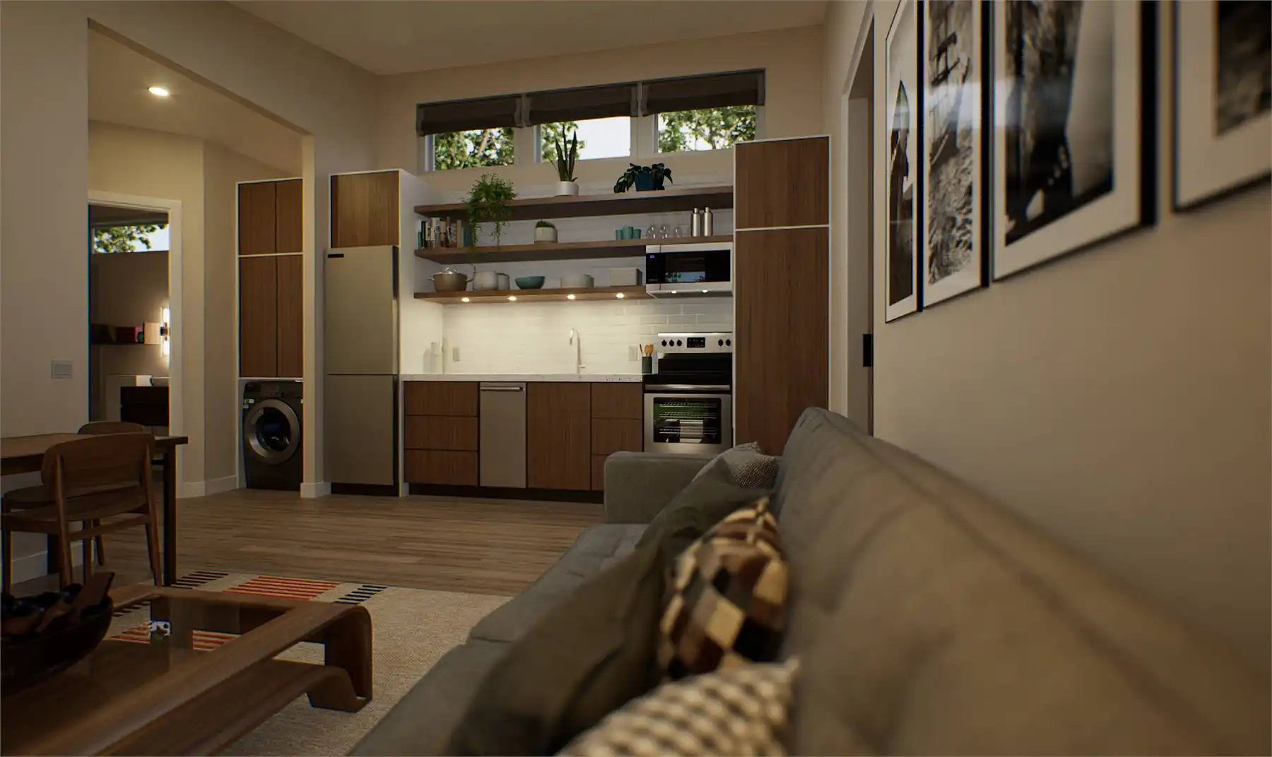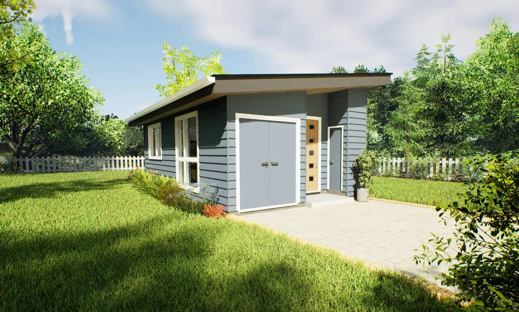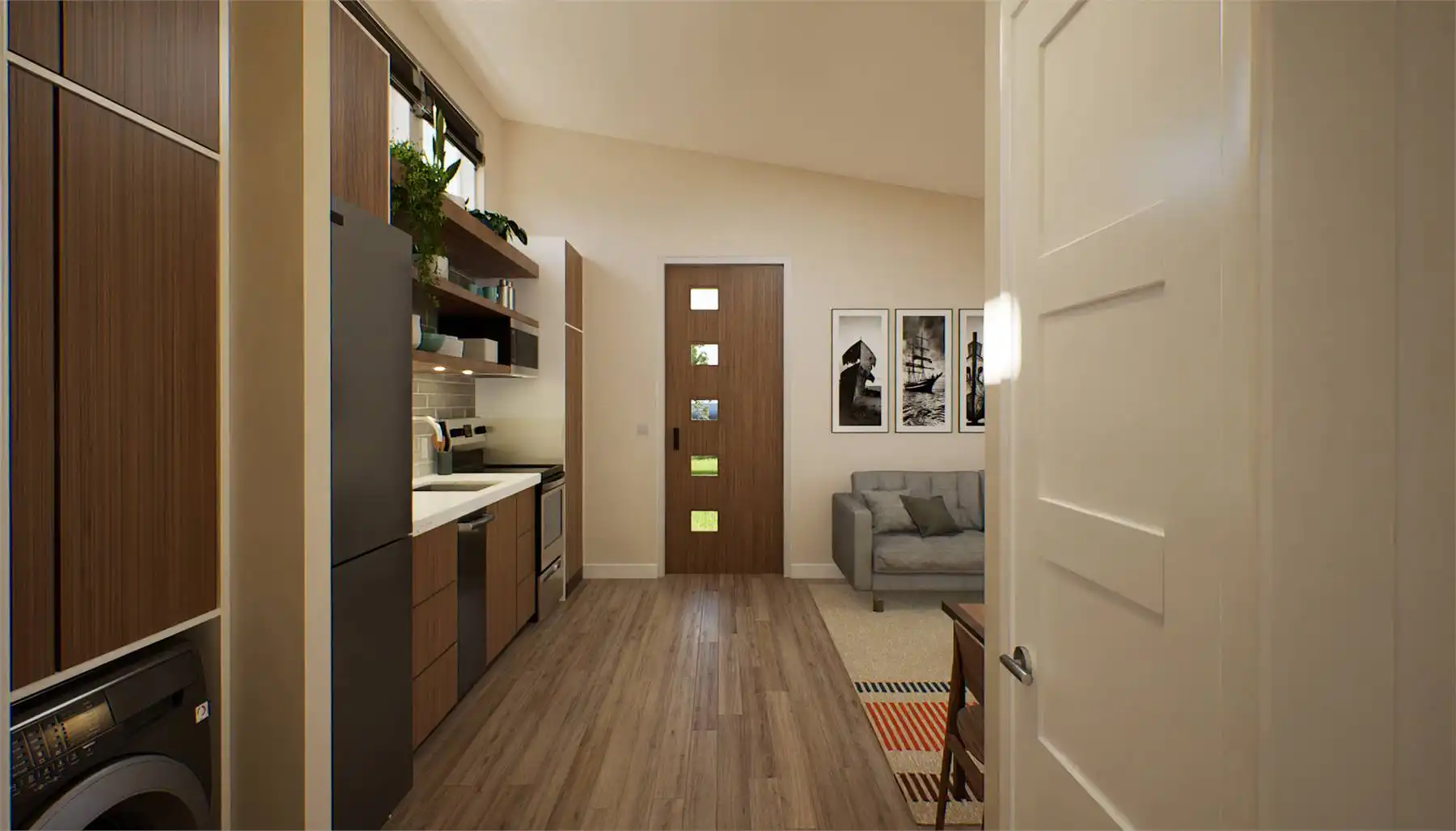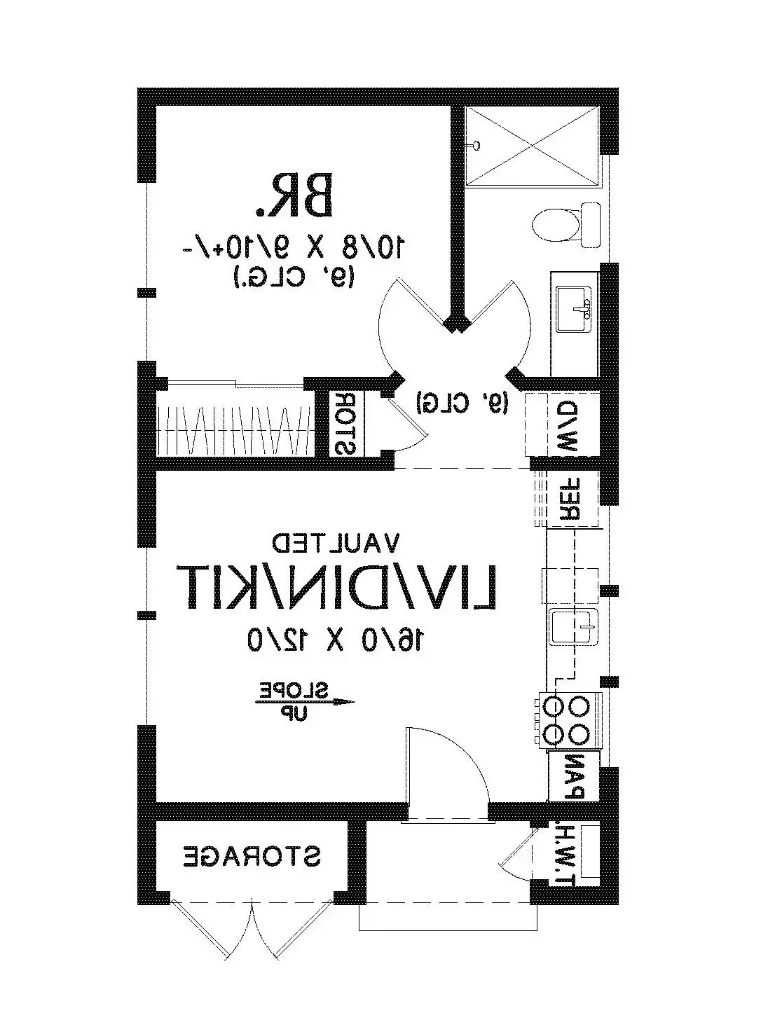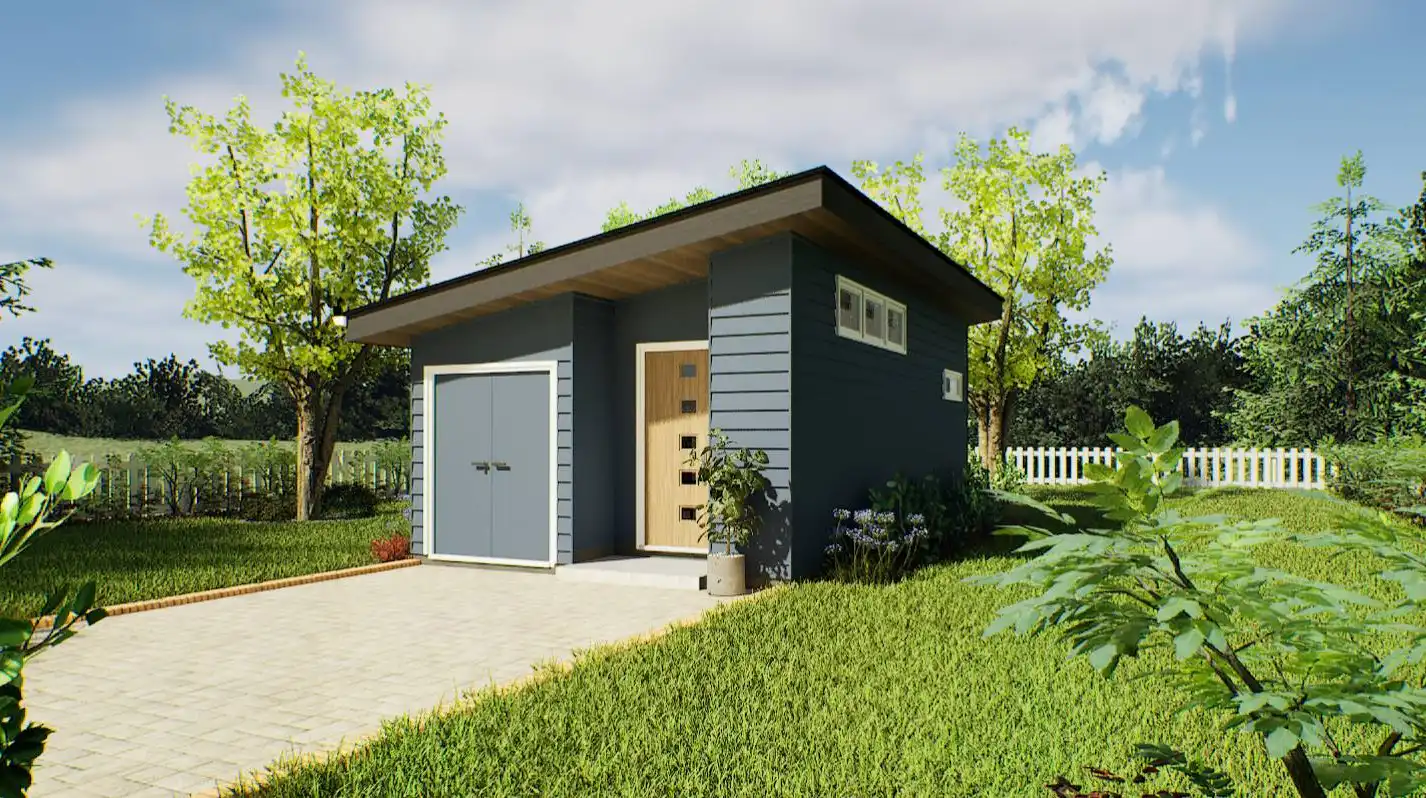 If you're seeking a sleek and compact living space, this minimalist contemporary house plan is the perfect design. With a total area of 442 square feet, this home has been thoughtfully designed to offer one bedroom and one bathroom while maximizing every inch of space for functionality and practicality. The floor plan features an open living, dining, and kitchen area with a vaulted ceiling, while the bedroom and bath are situated towards the back.