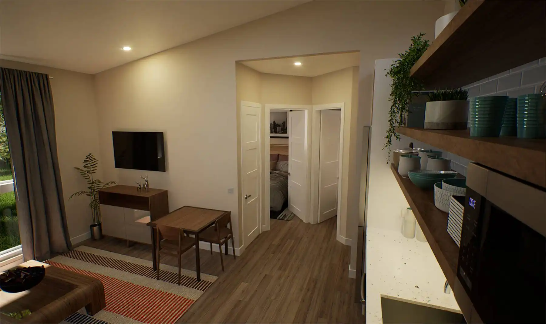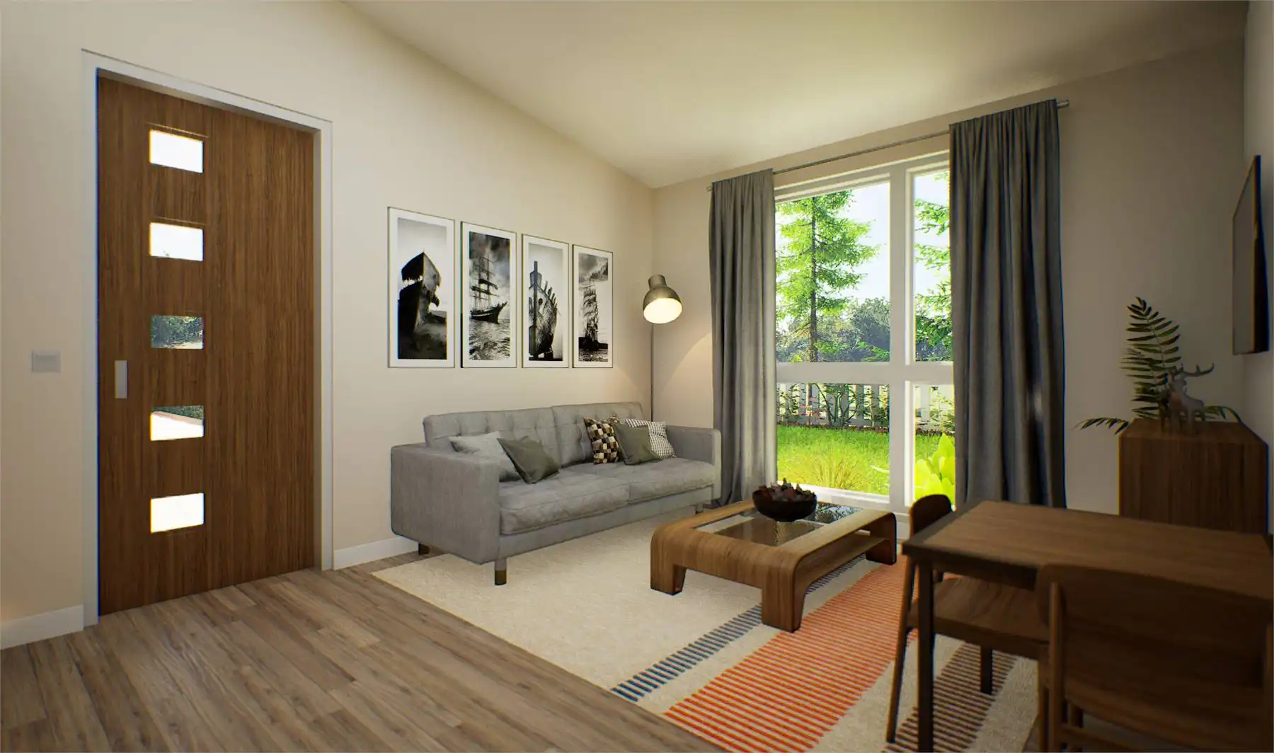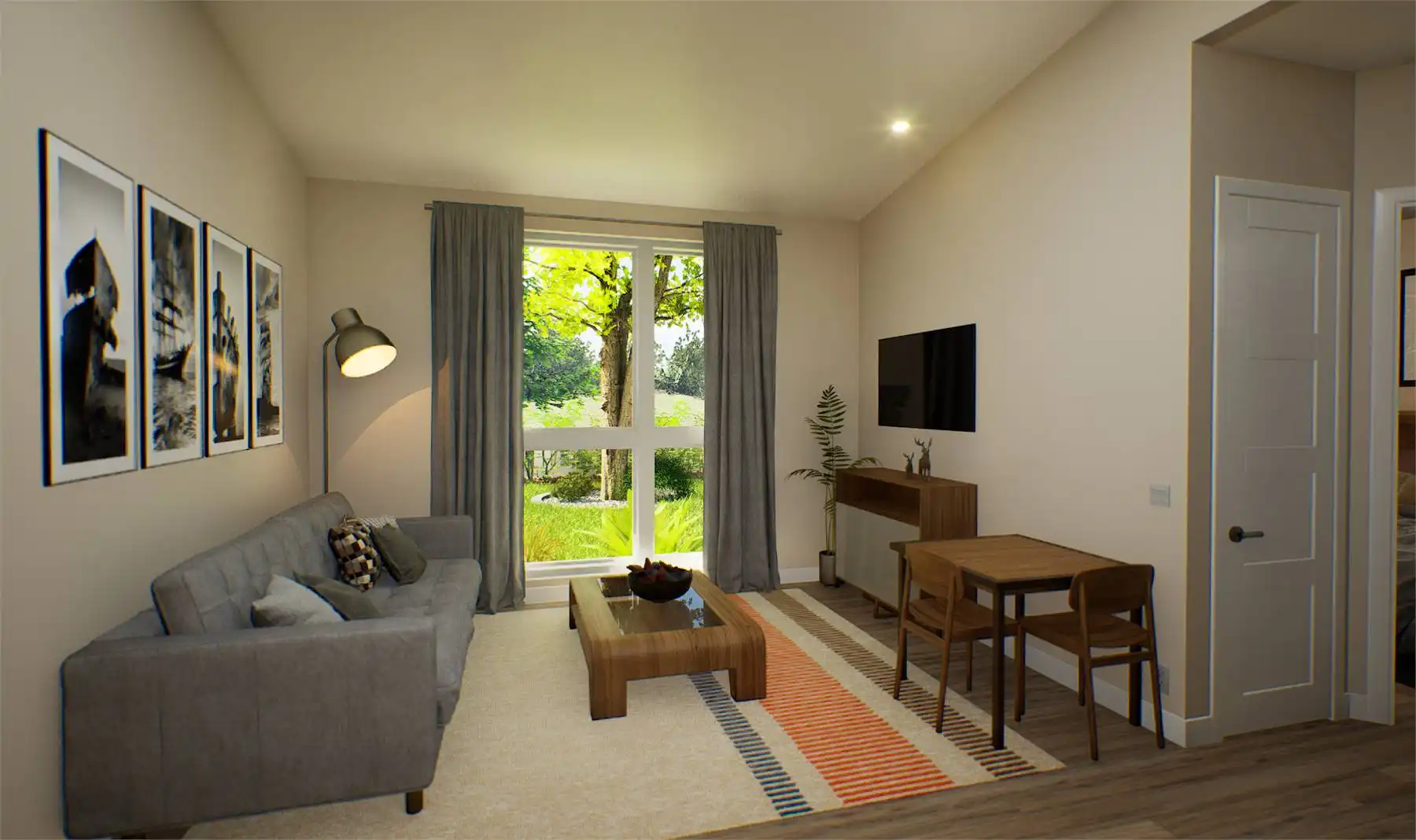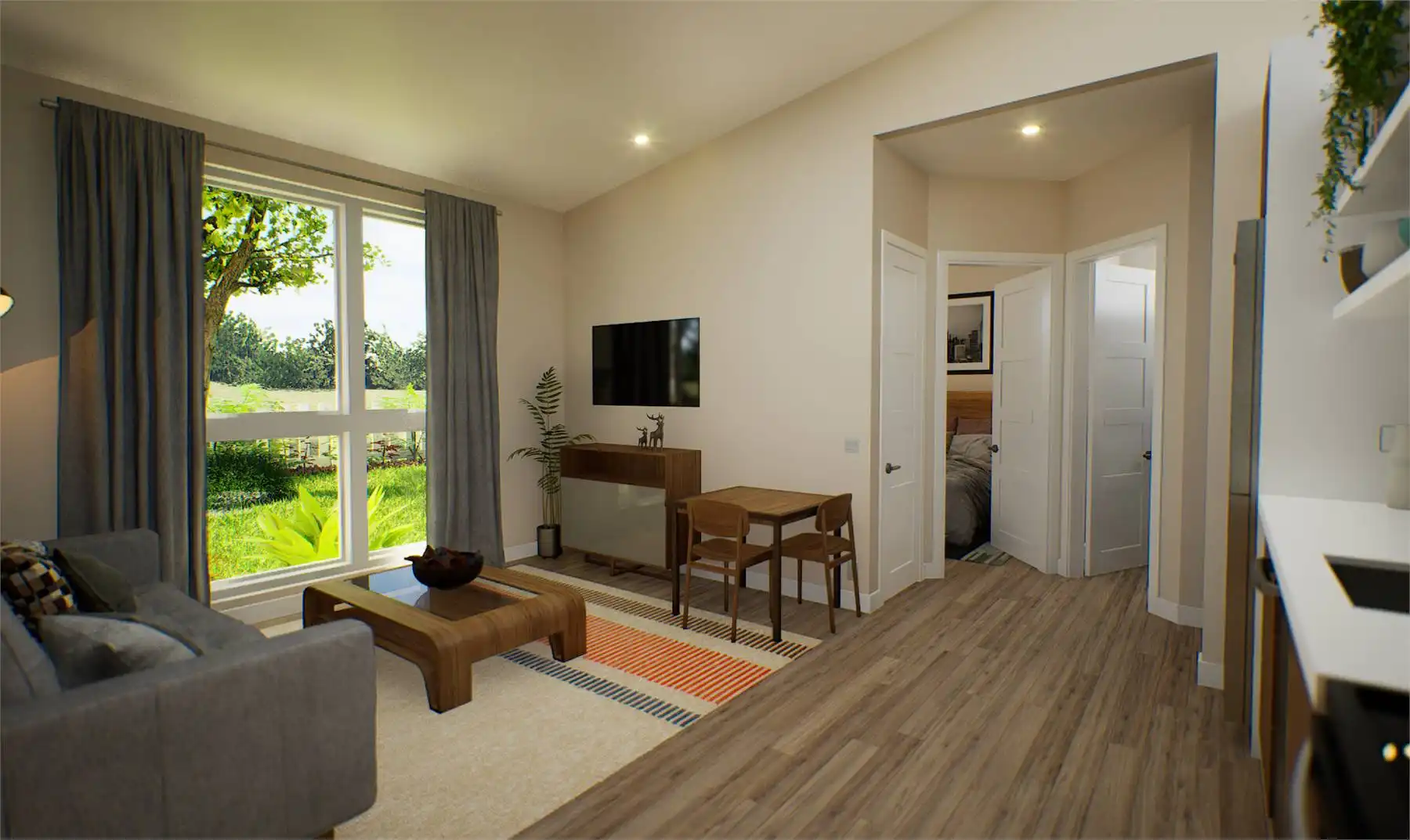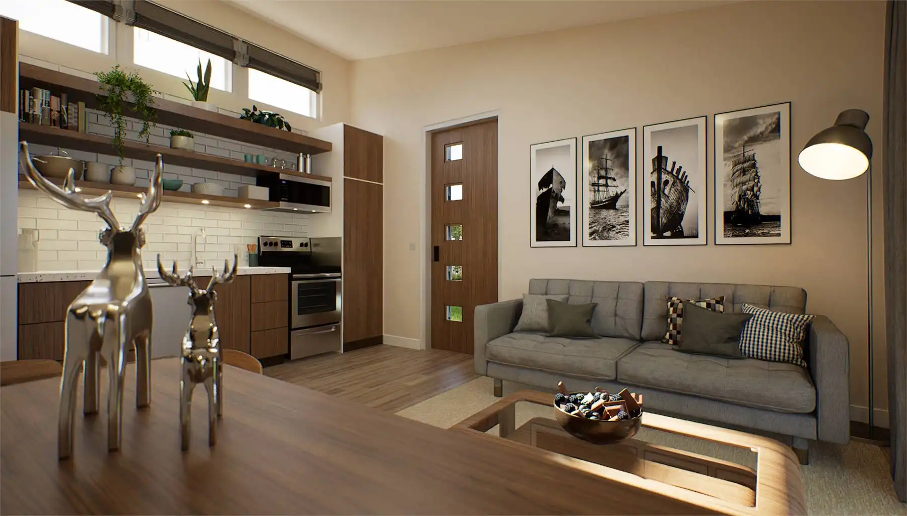 If you're seeking a sleek and compact living space, this minimalist contemporary house plan is the perfect design. With a total area of 442 square feet, this home has been thoughtfully designed to offer one bedroom and one bathroom while maximizing every inch of space for functionality and practicality. The floor plan features an open living, dining, and kitchen area with a vaulted ceiling, while the bedroom and bath are situated towards the back.