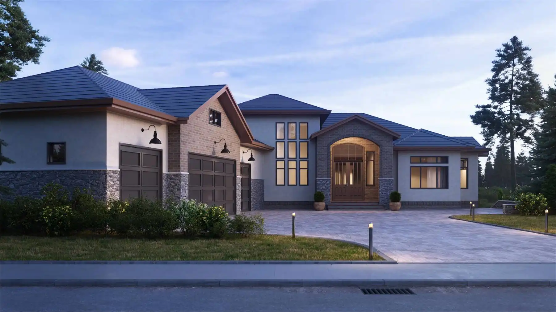 House Plan 2353 offers a unique floor plan optimized for a small family's luxury! It offers 3,112 square feet on one level, complete with two bedrooms and two-and-a-half baths. Both bedrooms are suites and grouped in one hallway while the formal parlor and open great room fill out the center of the floor plan. The island kitchen and mudroom anchor the other side. This design also includes a four-car angled garage and a walkout basement level waiting for your finishing touches!