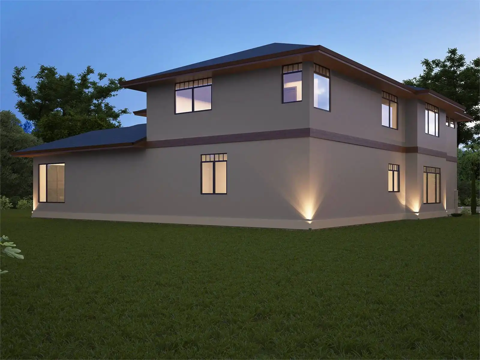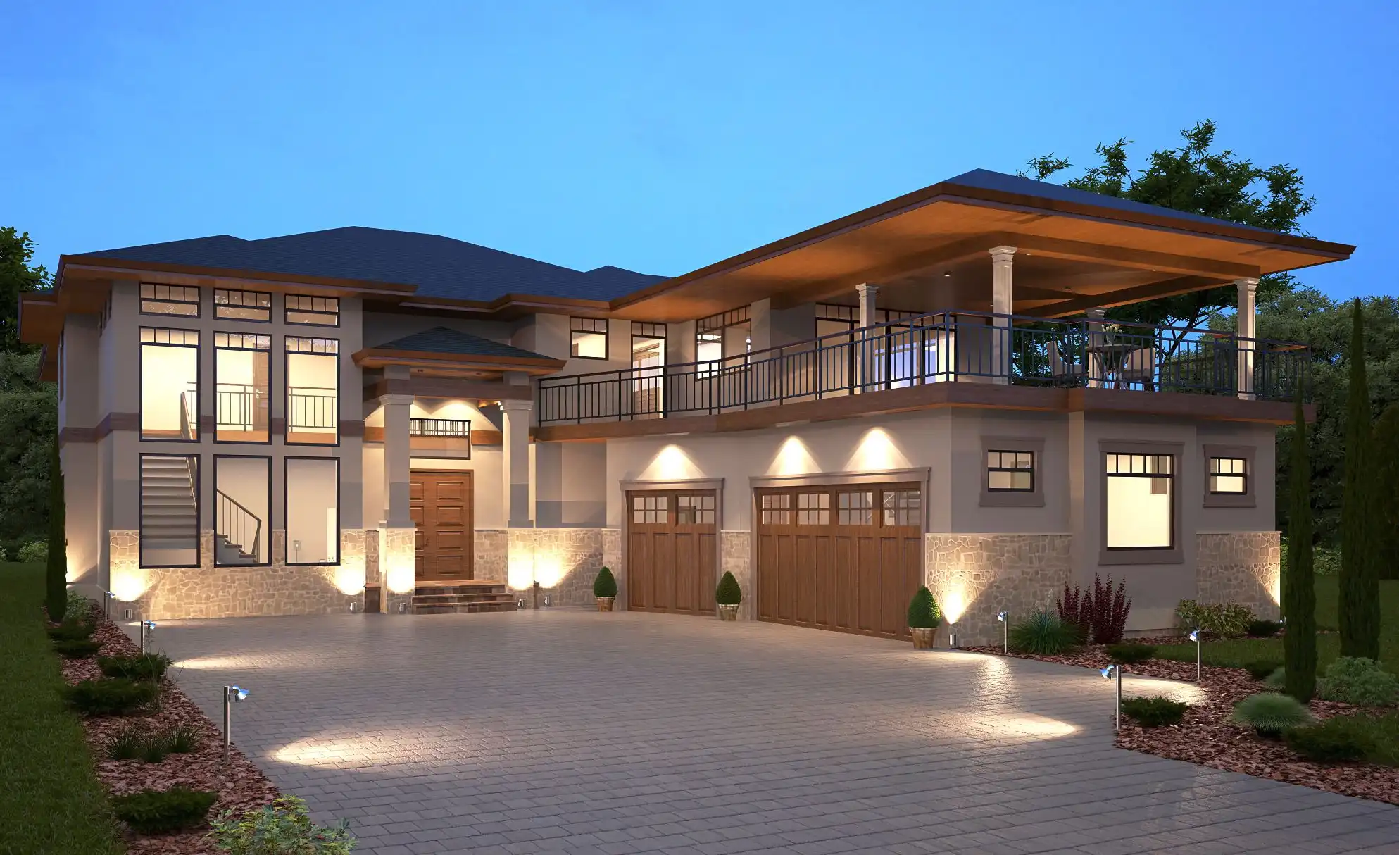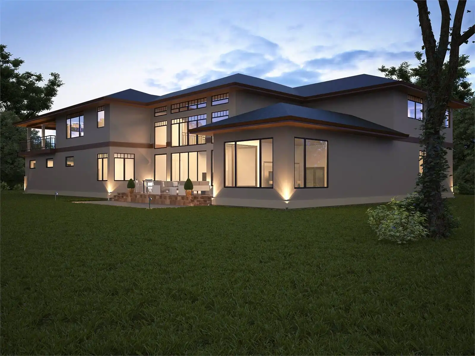 House Plan 2354 offers chic Mediterranean-inspired transitional flair and 5,451 square feet laid out perfectly for a tighter lot. When you enter, you'll find an office tucked off to the side, by the entrance of the three-car garage. The super spacious, voluminous great room makes up the center of the floor plan while the luxurious master suite rounds out the back. Upstairs, there's a pair of Jack-and-Jill bedrooms, another private bedroom suite, and a bonus. But that's not all! House Plan 2354 has a deck inset beside the great room and a covered deck over the garage, accessible by the hallway near the bonus. This provides built-in outdoor living space, so don't worry if your lot doesn't have enough room to expand out and add some on!