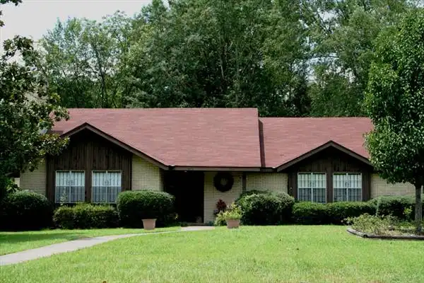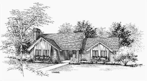 This modest sized and low cost design offers both an informal family room and a formal living area. The family room has a 10' four way sloped ceiling and wood burning brick fireplace. All bedrooms are larger than in comporable sized plans and the two front bedrooms have a window seat.