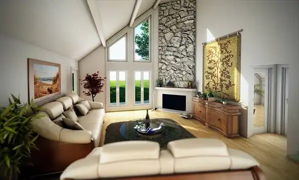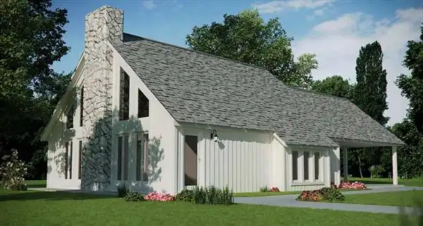 This cedar sided rustic cottage is perfect for those that have a modest budget but desire volumes of space. The master suite and living room have vaulted ceilings supported by wood beams. Soaring glass in both areas allows for king sized views. The massive stone fireplace provides the finishing touch for romantic evenings in this perfect getaway cottage.