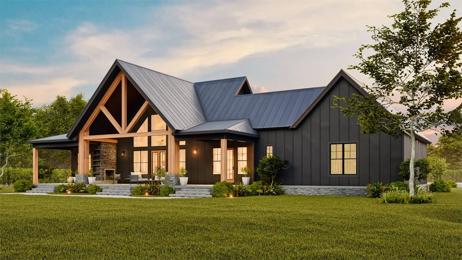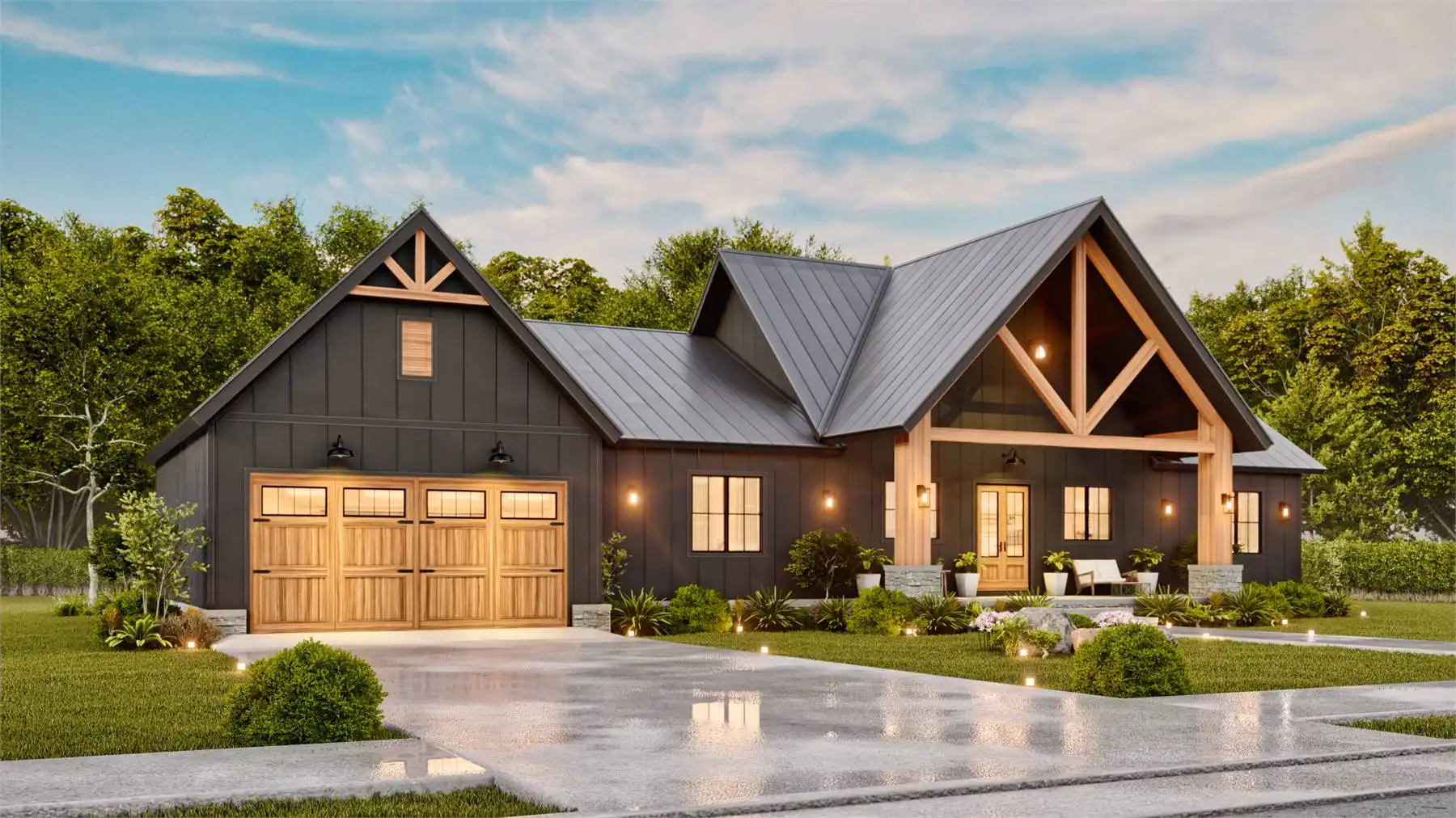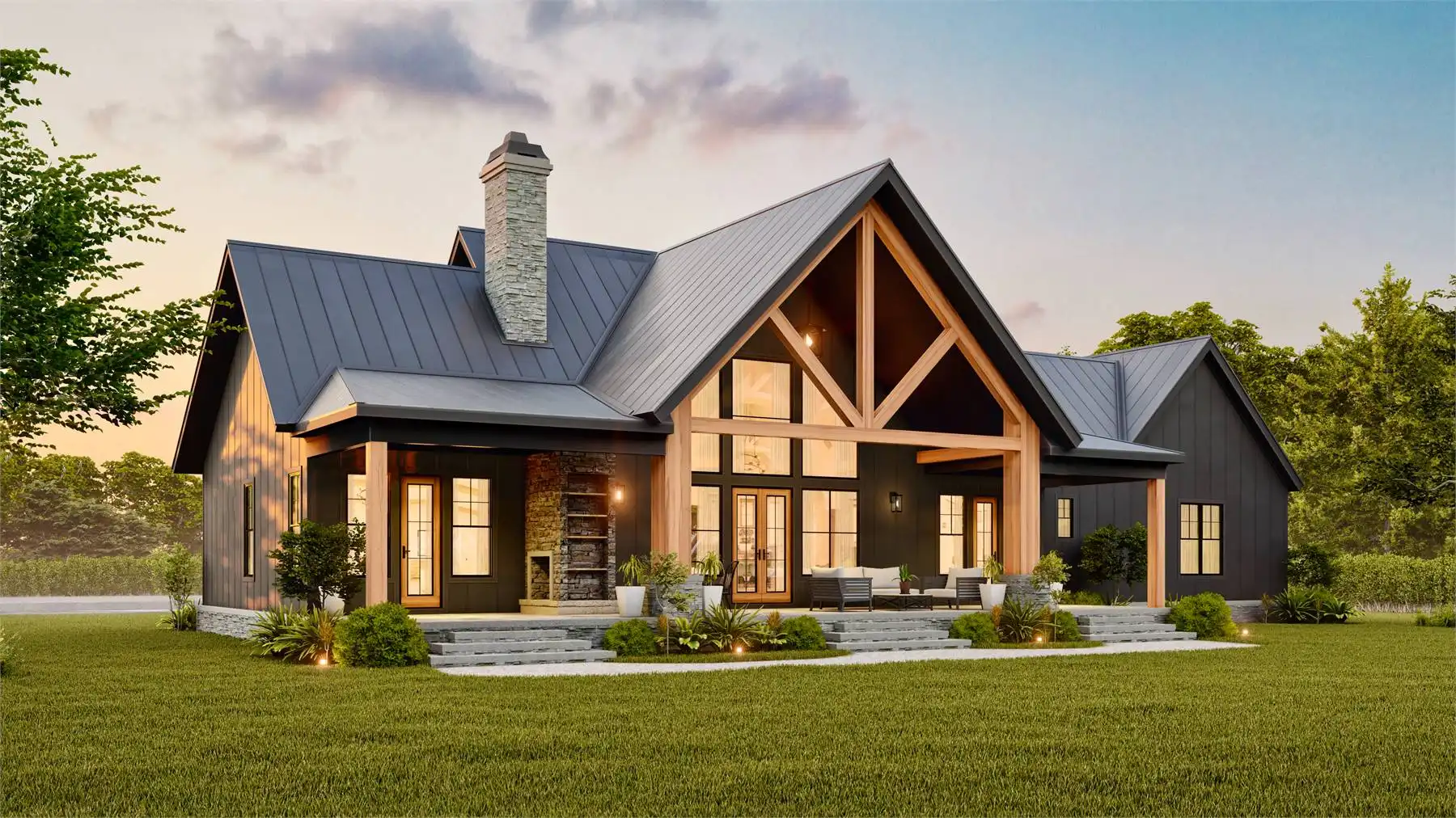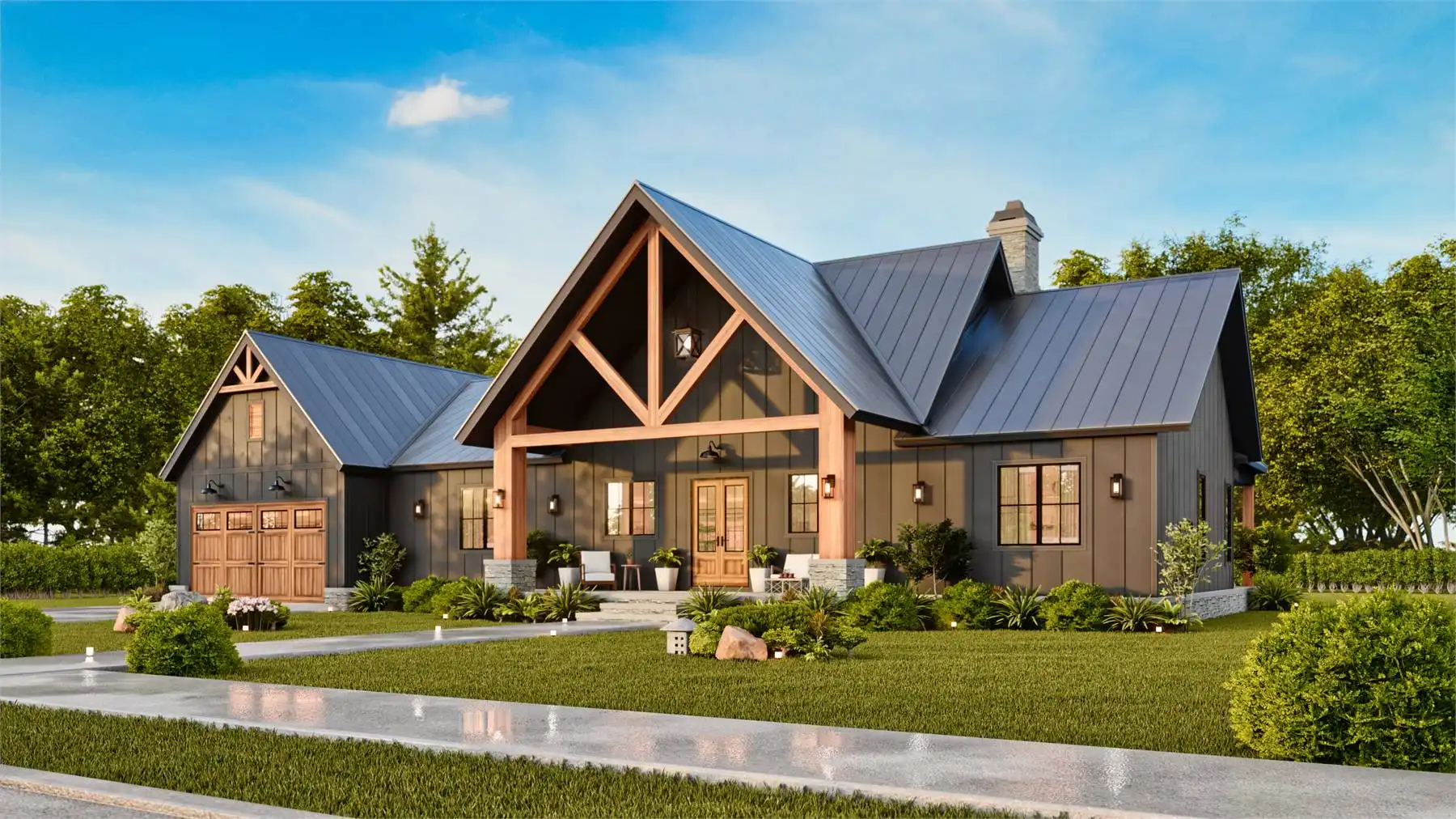 House Plan 2386 is a beautiful yet simple and affordable-to-build country ranch with plenty of rustic style. It would be perfect for year-round or seasonal living in a natural setting. The 1,928-square-foot design boasts wide-open living in the center, complete with an island kitchen and a vaulted ceiling with high windows over the living and dining areas. The luxe primary suite is on one side of this while two other suites are on the opposite side of the house. Make sure to appreciate the spacious covered back porch--it has an outdoor fireplace to provide as much ambiance in the fresh air as outside! A front-entry two-car garage on the side rounds out this popular plan.