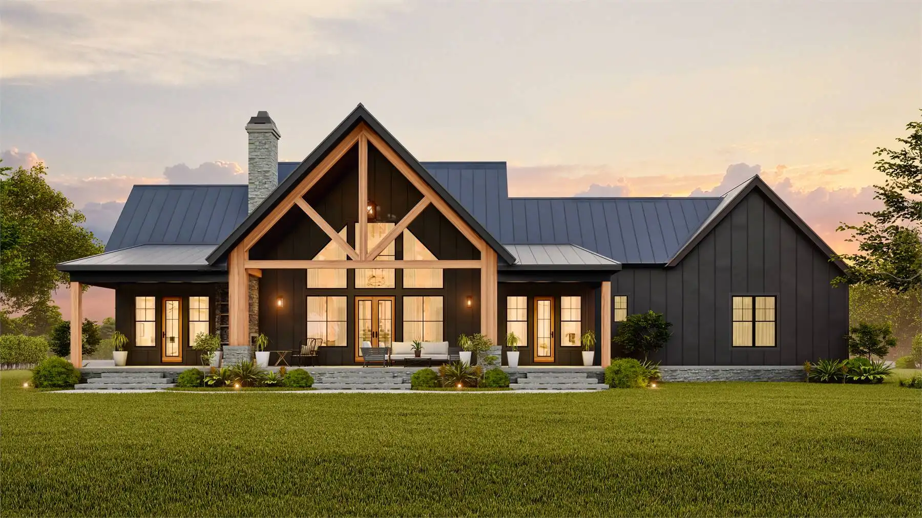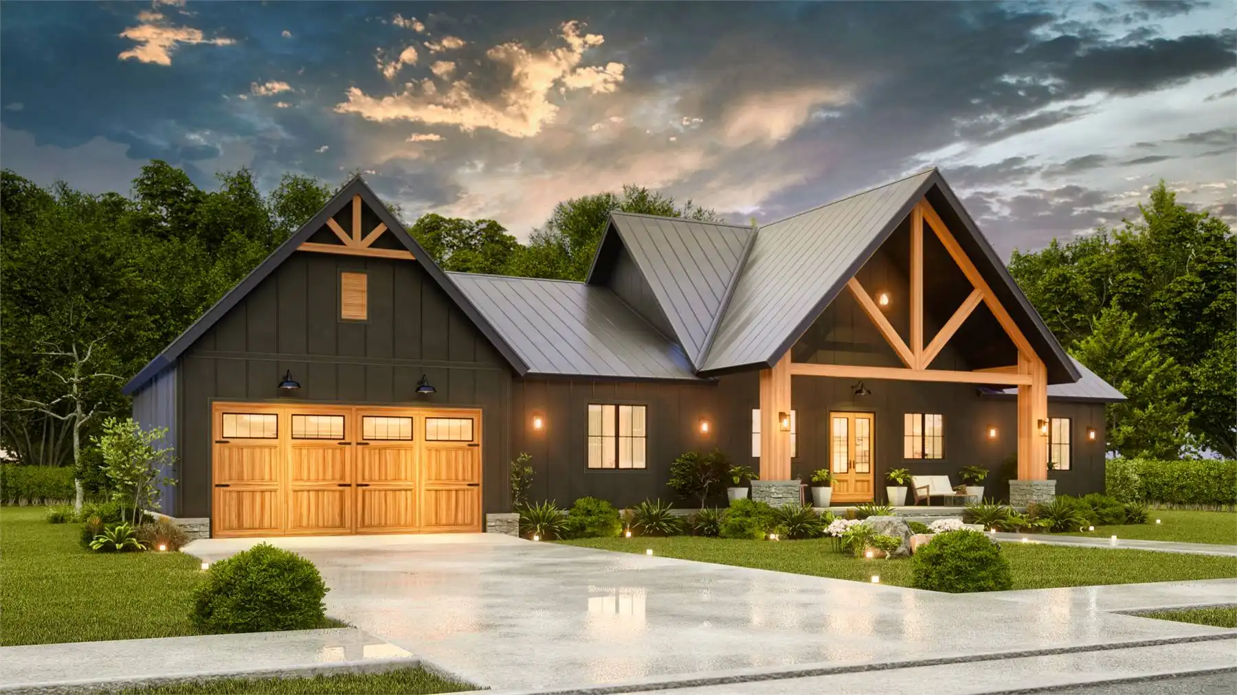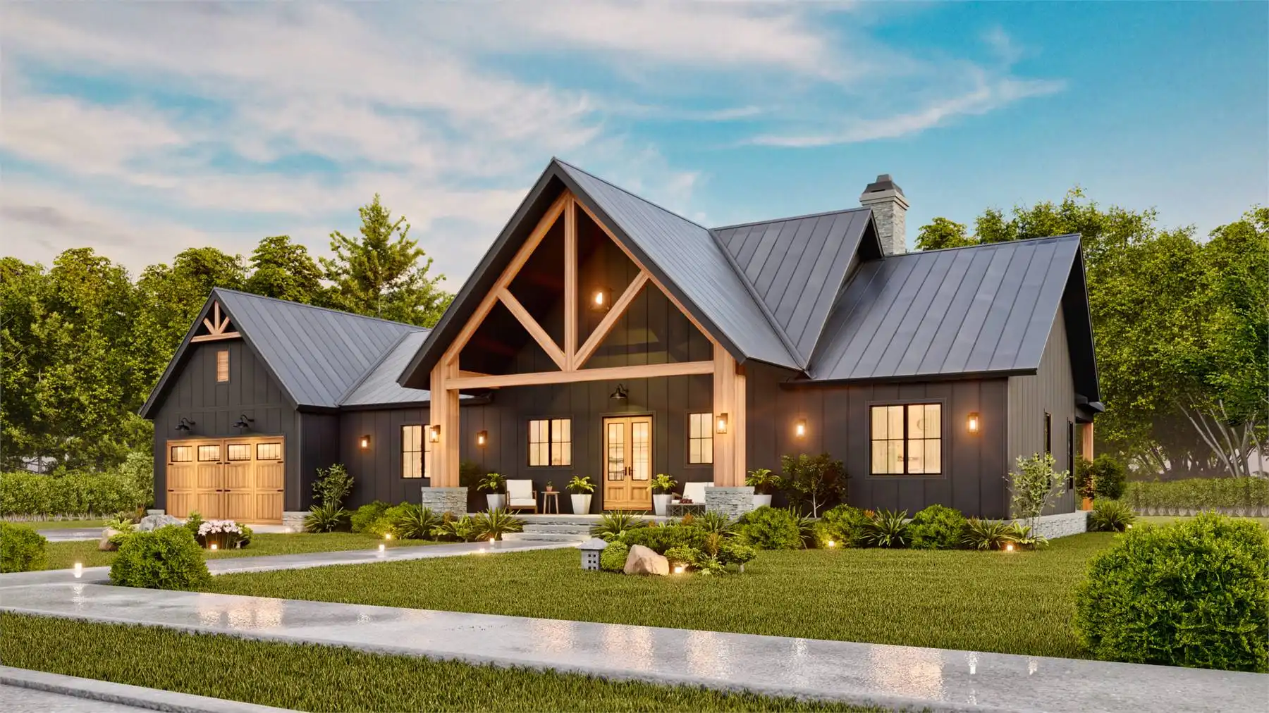 House Plan 2386 is a beautiful yet simple and affordable-to-build country ranch with plenty of rustic style. It would be perfect for year-round or seasonal living in a natural setting. The 1,928-square-foot design boasts wide-open living in the center, complete with an island kitchen and a vaulted ceiling with high windows over the living and dining areas. The luxe primary suite is on one side of this while two other suites are on the opposite side of the house. Make sure to appreciate the spacious covered back porch--it has an outdoor fireplace to provide as much ambiance in the fresh air as outside! A front-entry two-car garage on the side rounds out this popular plan.