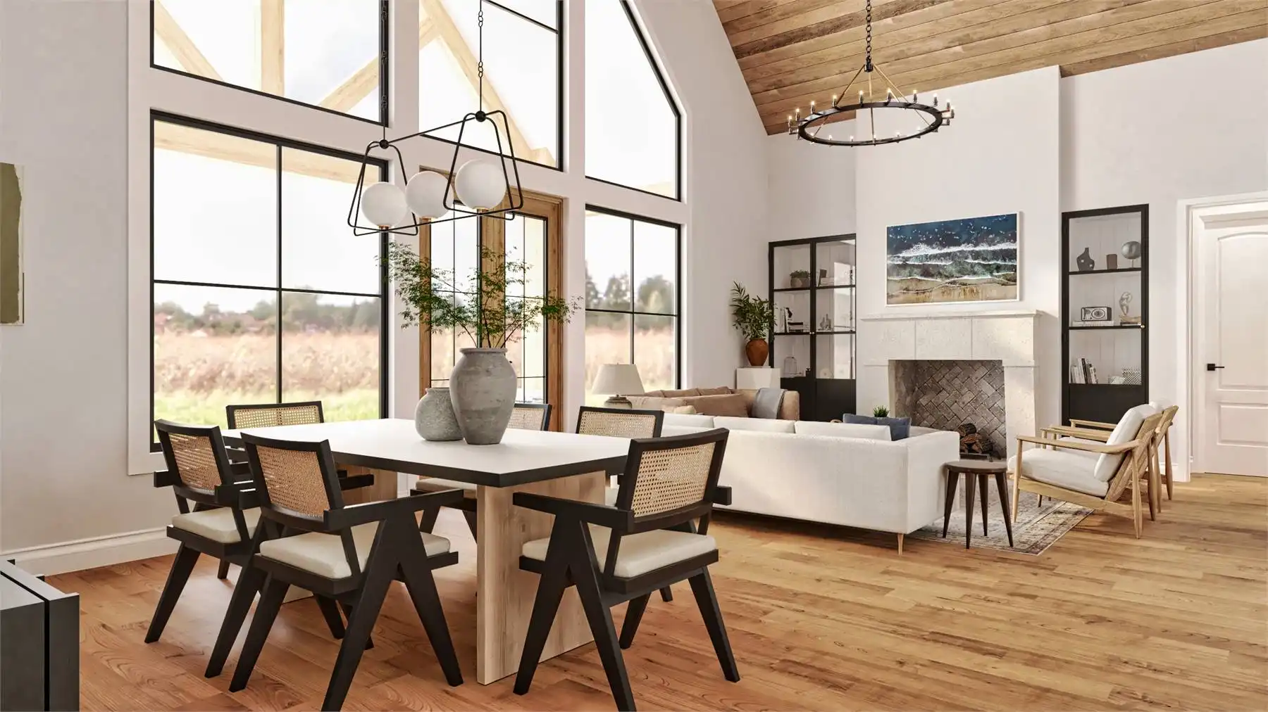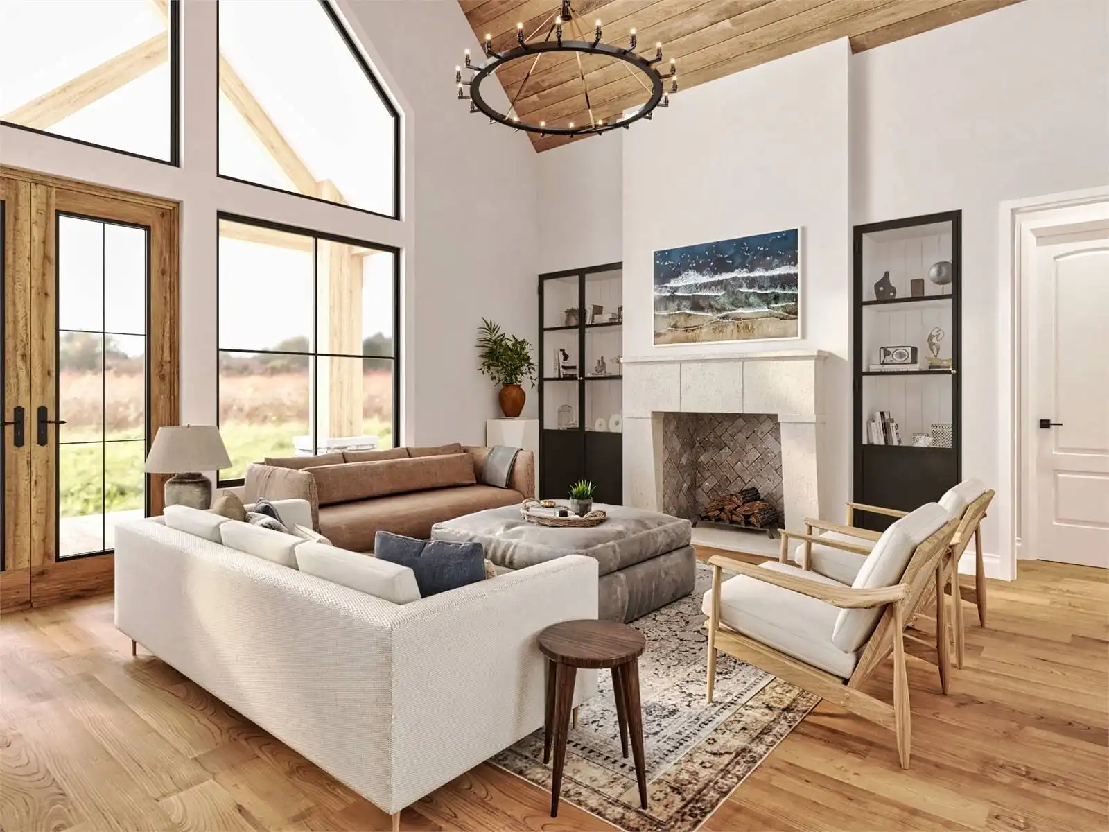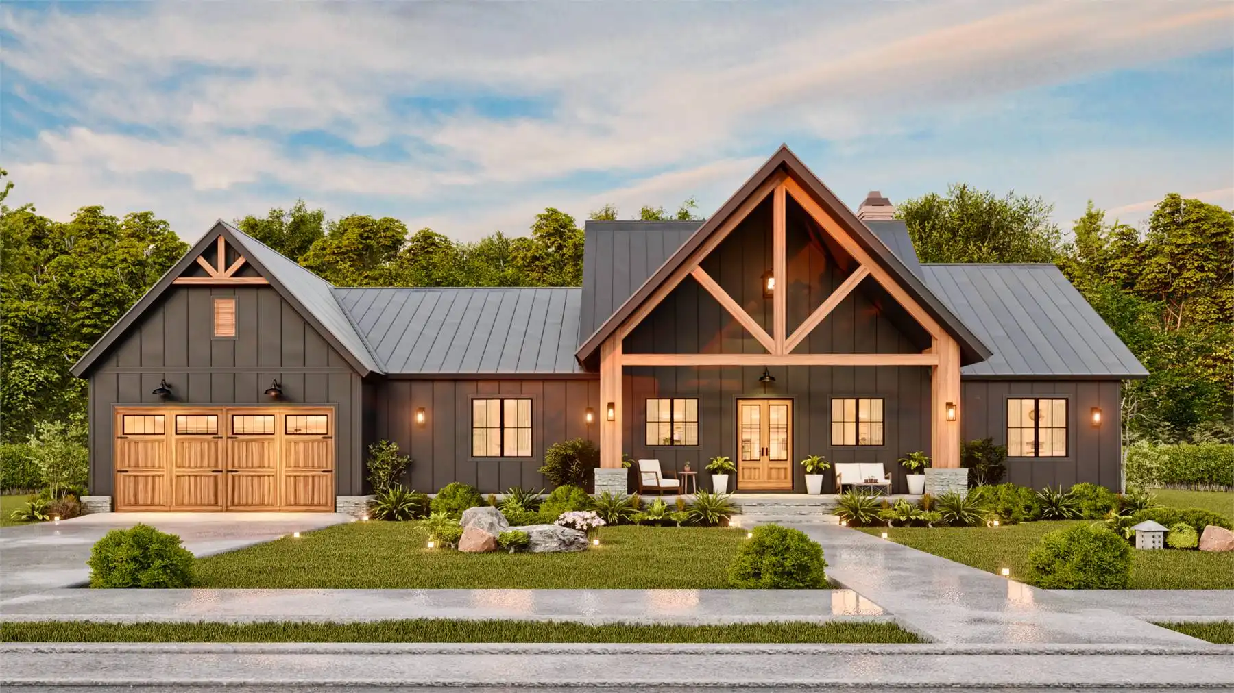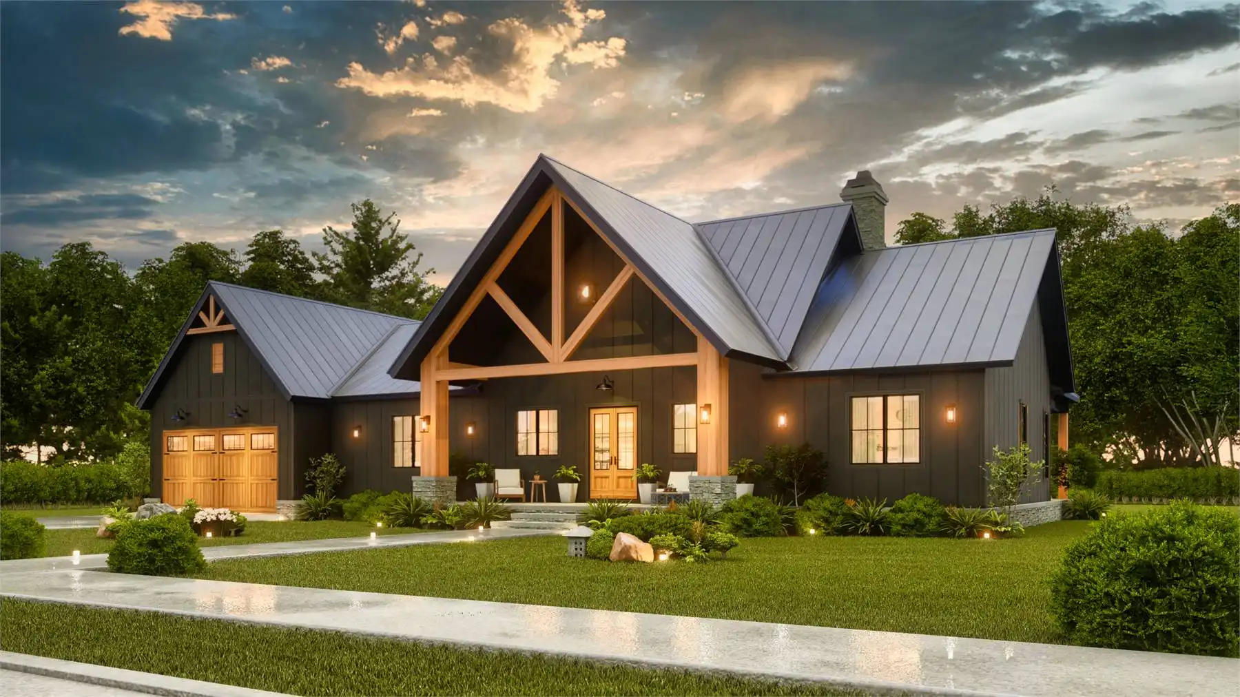 House Plan 2386 is a beautiful yet simple and affordable-to-build country ranch with plenty of rustic style. It would be perfect for year-round or seasonal living in a natural setting. The 1,928-square-foot design boasts wide-open living in the center, complete with an island kitchen and a vaulted ceiling with high windows over the living and dining areas. The luxe primary suite is on one side of this while two other suites are on the opposite side of the house. Make sure to appreciate the spacious covered back porch--it has an outdoor fireplace to provide as much ambiance in the fresh air as outside! A front-entry two-car garage on the side rounds out this popular plan.