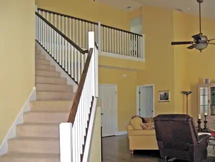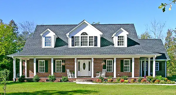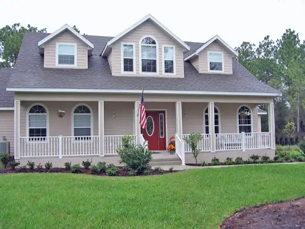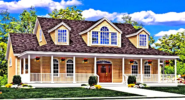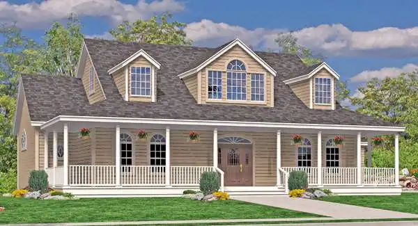 This 2,245 square foot with a covered wrap-around porch and lovely arched windows give this home a comfortable farm house style. The attached garage is set way back to minimize it's impact and help retain the classic farmhouse appeal. The huge Great Room features an 18-ft. vaulted ceiling, a dramatic wall of windows and a fireplace set into a media wall for ease of furnishing. Ample counter space and a convenient work island allow maximum use of the roomy kitchen, which looks out to the vaulted breakfast room. Sliding french doors lead to a lovely covered rear porch. On the other side of the home, a dramatic bay window and a 10-ft. ceiling highlight the master bedroom. Two bedrooms and a bath on the second floor are accessed from a dramatic balcony that overlooks the great room.