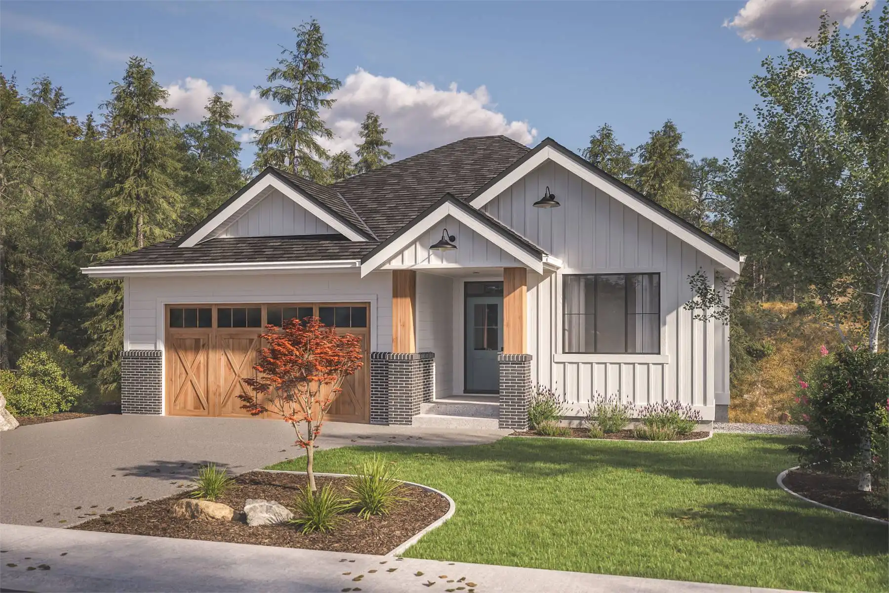 This delightful 2-bedroom, 2-bathroom farmhouse blends comfort and practicality. The open floor plan on the main level includes a welcoming great room, a kitchen with a walk-through pantry, and a cozy dining area. The primary suite offers a walk-in closet and private ensuite, while the second bedroom is situated next to a full bathroom. Step outside to enjoy the covered front porch or relax on the rear sundeck, perfect for outdoor gatherings. The unfinished basement adds flexibility, offering space for future expansion, including an extra bedroom. A spacious double garage completes the home, providing plenty of room for parking and storage.