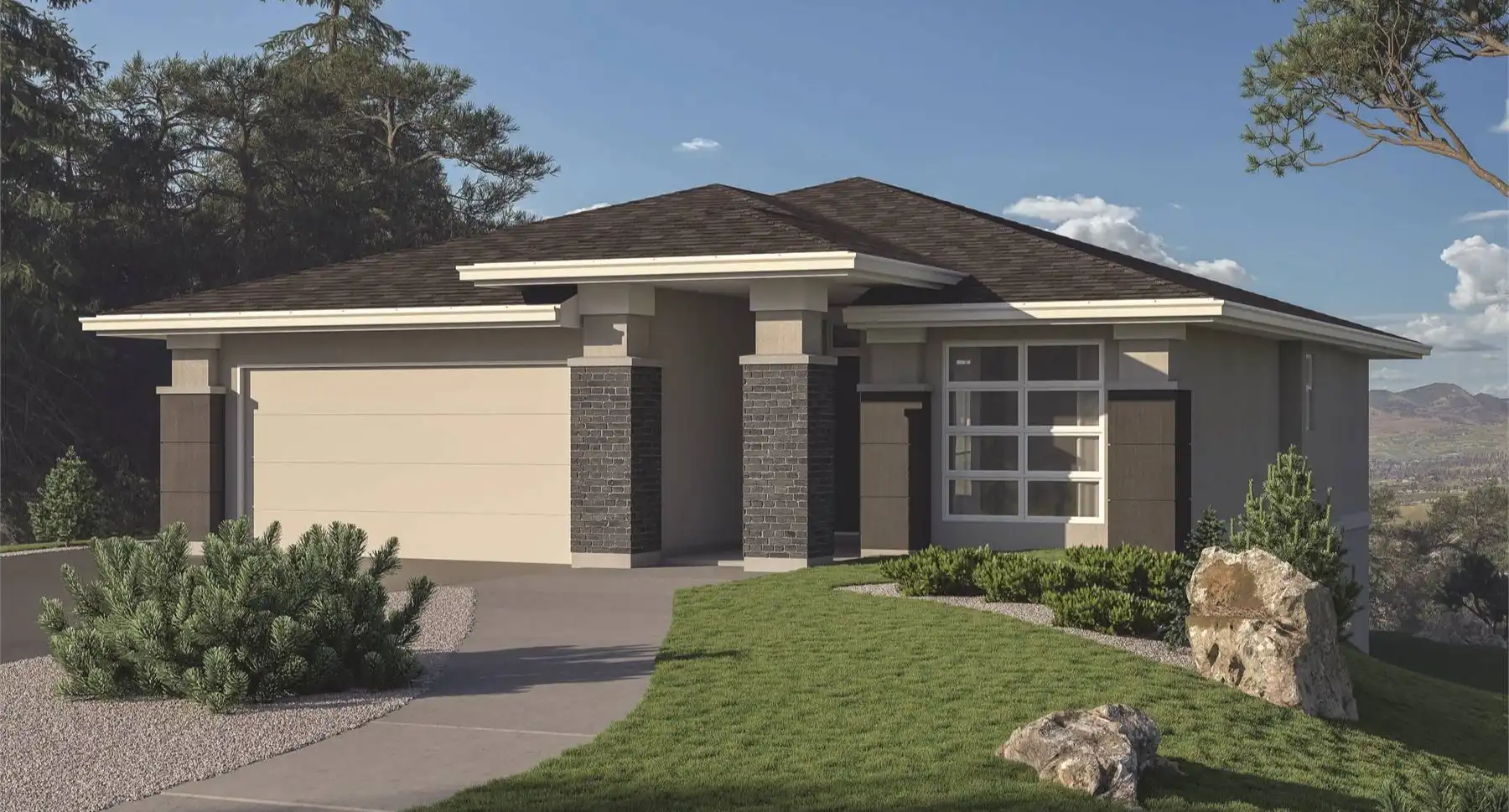 House Plan 2853 is a cozy two-bedroom modern rancher with 1,402 square feet of living space and an unfinished basement, perfect for future expansion or a secondary suite. The open great room features a gas fireplace and sliding doors to a covered deck, ideal for outdoor meals. The kitchen, with a walk-in pantry and prep island, flows into the dining area with views of the backyard. The private primary suite includes a luxurious ensuite with a soaker tub, separate shower, and walk-in closet, while the second bedroom at the front is near a full bathroom. Classic columns and mullioned windows add to its curb appeal, making House Plan 2853 both stylish and functional.
