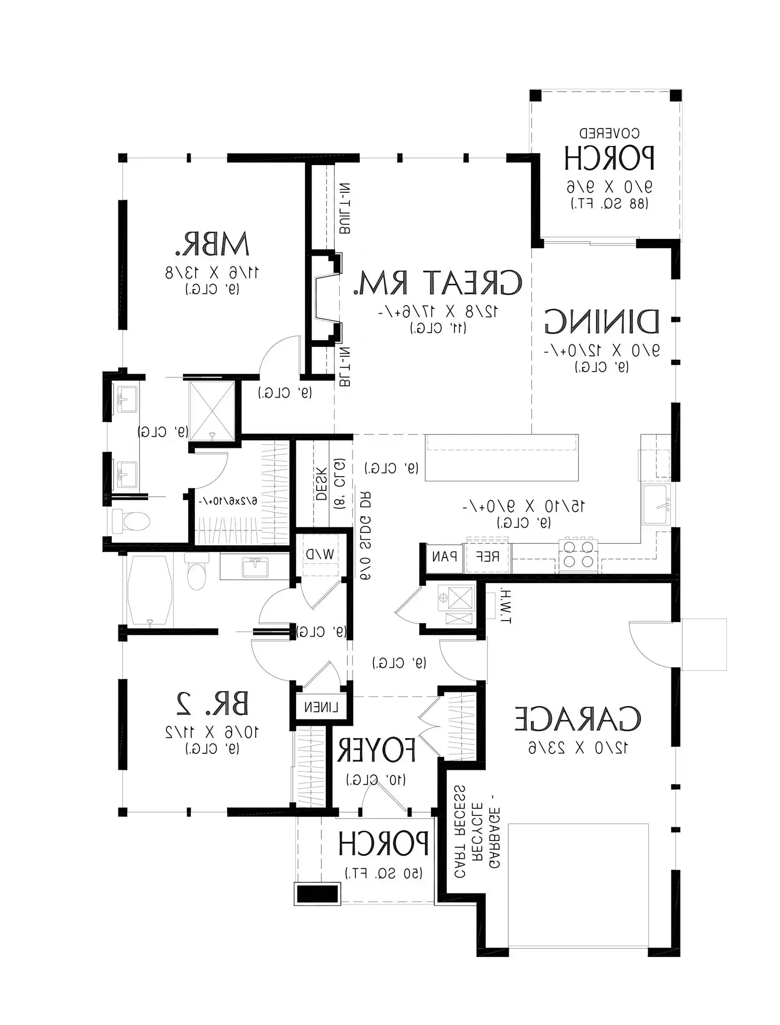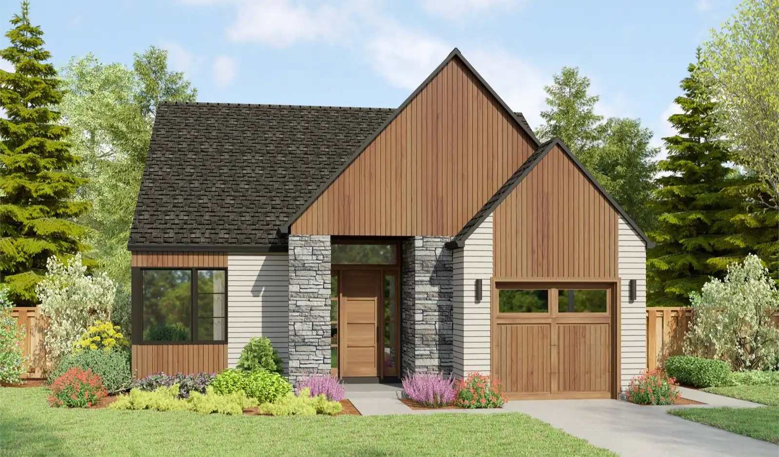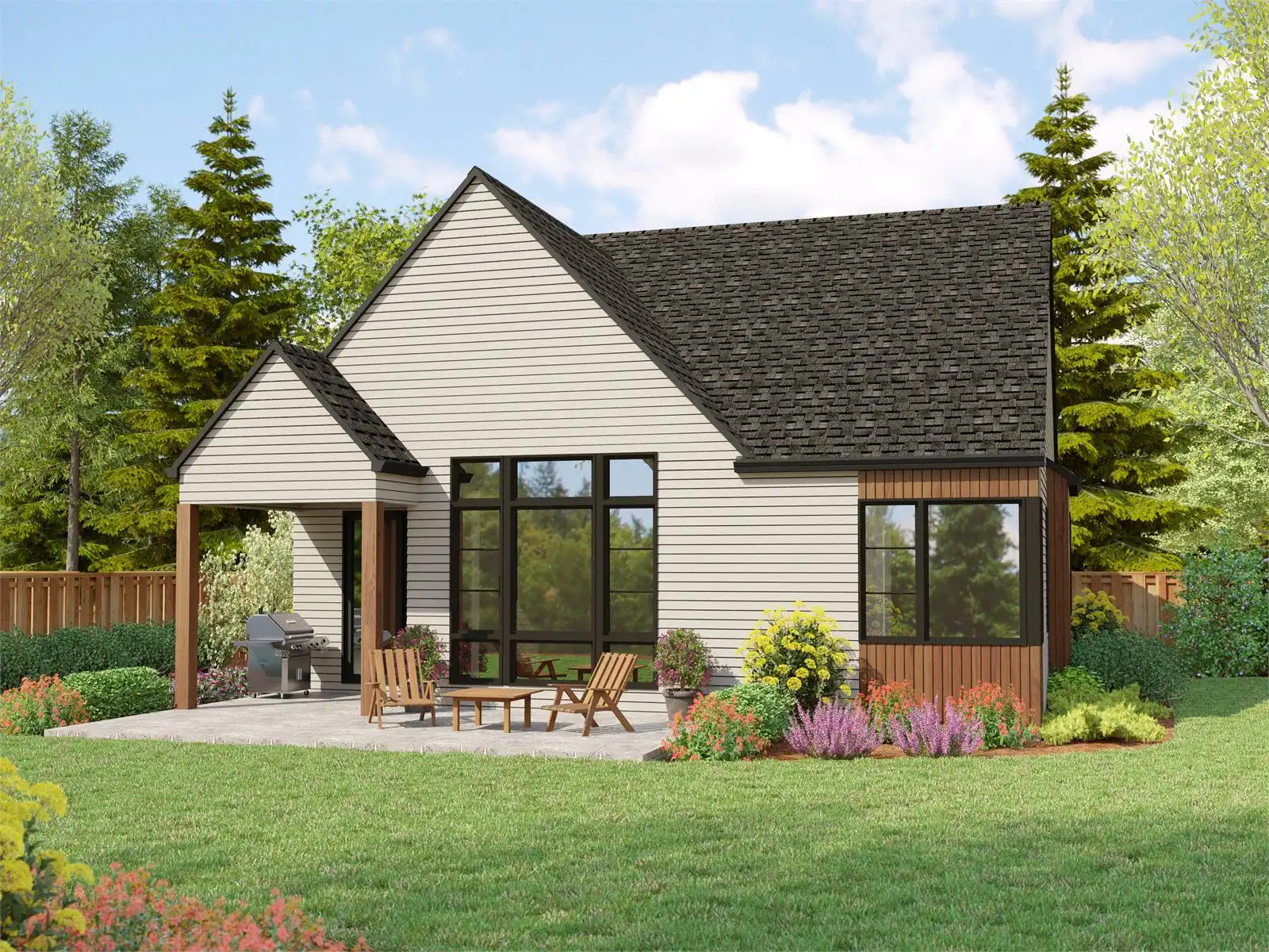 House Plan 2856 would make a great cabin for a natural location with its chic yet modest design! This Scandinavian-inspired home offers 1,297 square feet with two bedrooms and two bathrooms. There's also a one-car garage with dedicated space for trash and recycling cans! Inside, you'll enjoy two split bedroom suites on one side while the open-concept living space maximizes every square foot in back. Need more? You can expand out onto the patio!